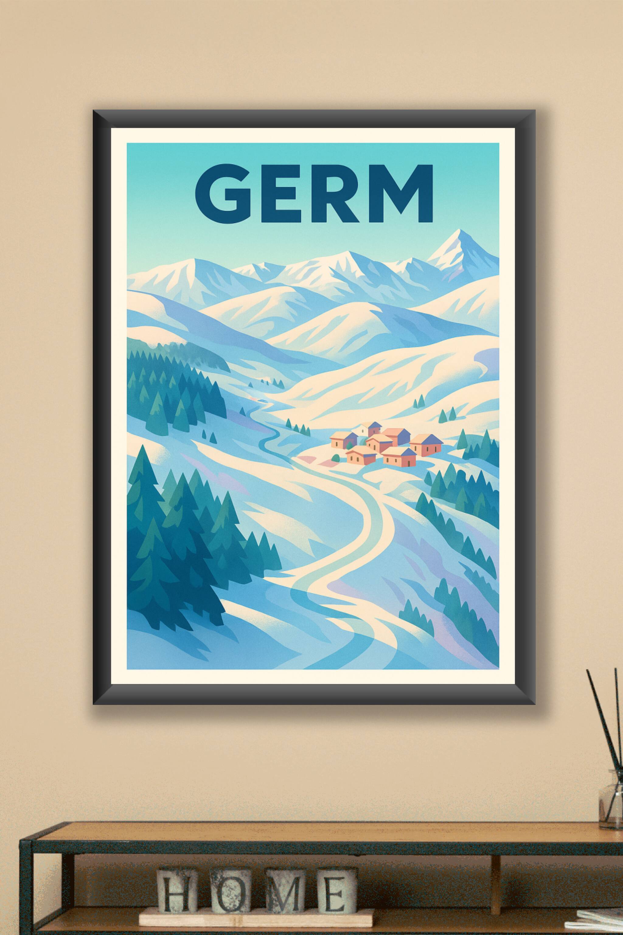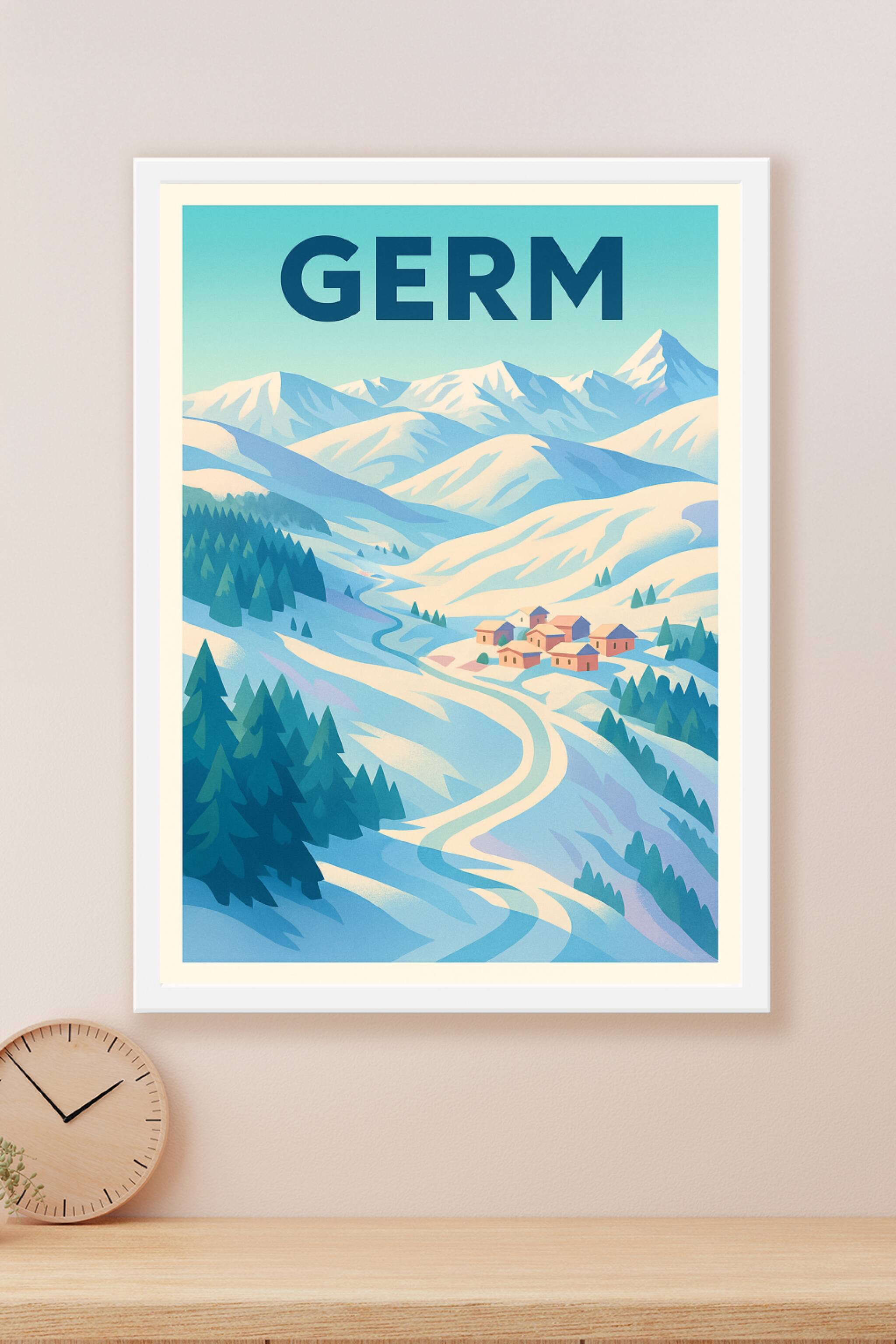 Découvrez l'élégance épurée des paysages alpins avec cette affiche illustrée de Germ, où les sommets enneigés et les chalets se dessinent dans une ...