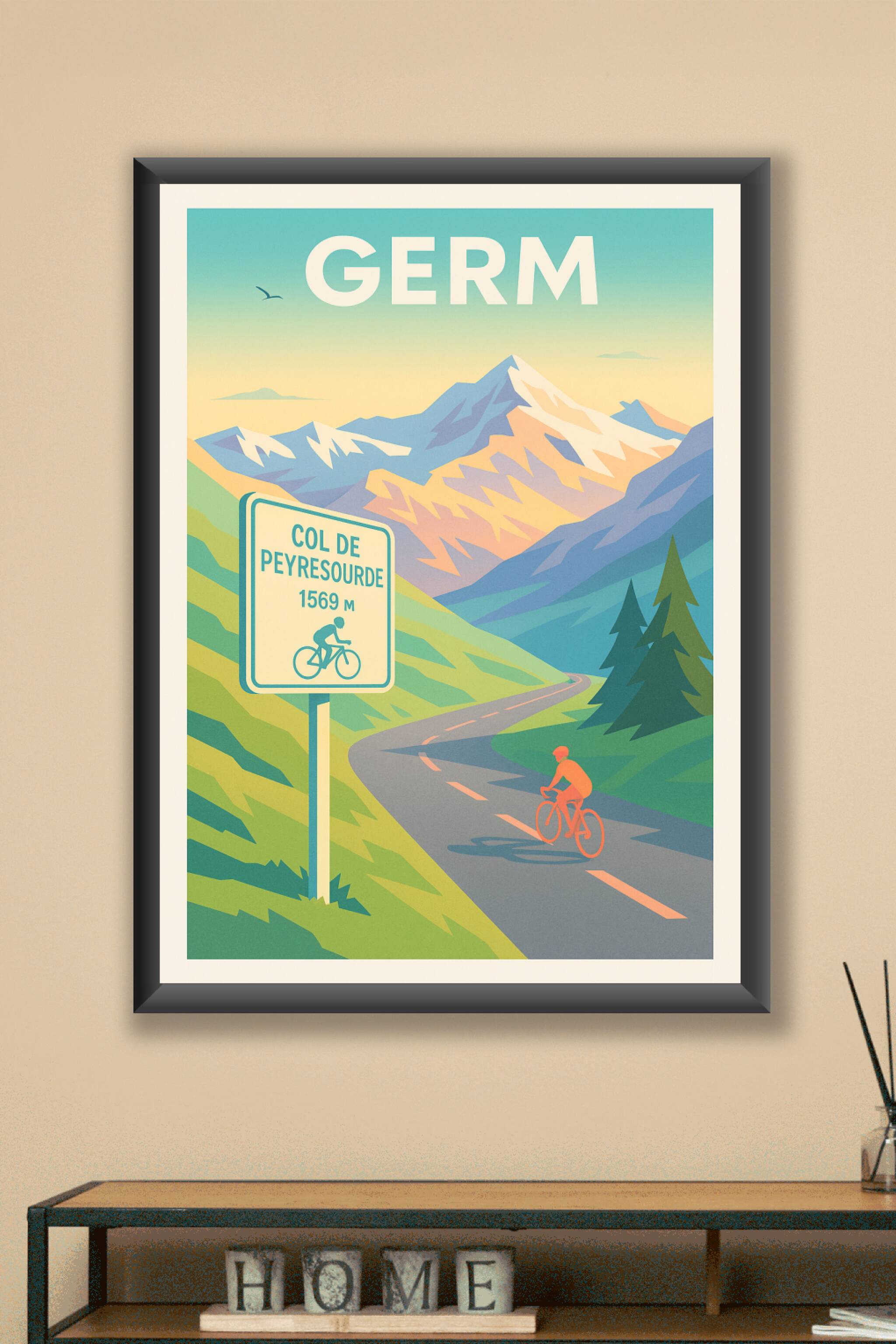 Découvrez la beauté majestueuse des Pyrénées avec cette affiche aux couleurs douces et au style vintage évoquant la montée mythique du Col de Peyresourde. Ce poster illustre parfaitement l'esprit sportif et la nature impressionnante qui entourent Germ.Cette affiche est imprimée en tirage "Fine Art" sur papier 305g coton, garantissant une qualité d'impression haute définition et des couleurs éclatantes. Disponible aux formats A1, A2, A3 et A4, avec ou sans cadre, elle s'adapte à tous les espaces et styles d'intérieur.Faites entrer l'aventure et la légende cycliste dans votre décoration avec ce poster premium, 100% fabriqué en France, idéal pour les passionnés de montagne et d'efforts sportifs.