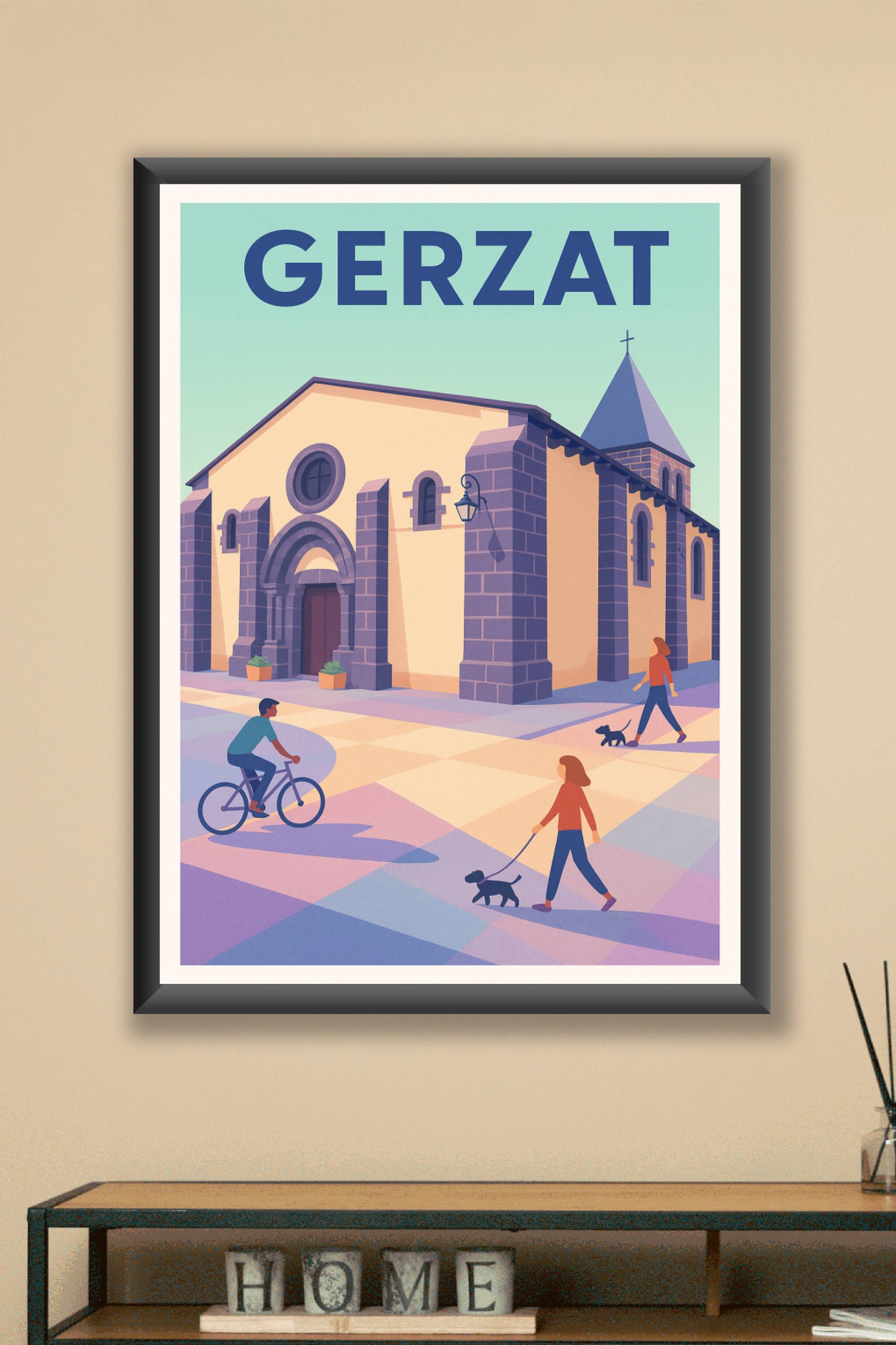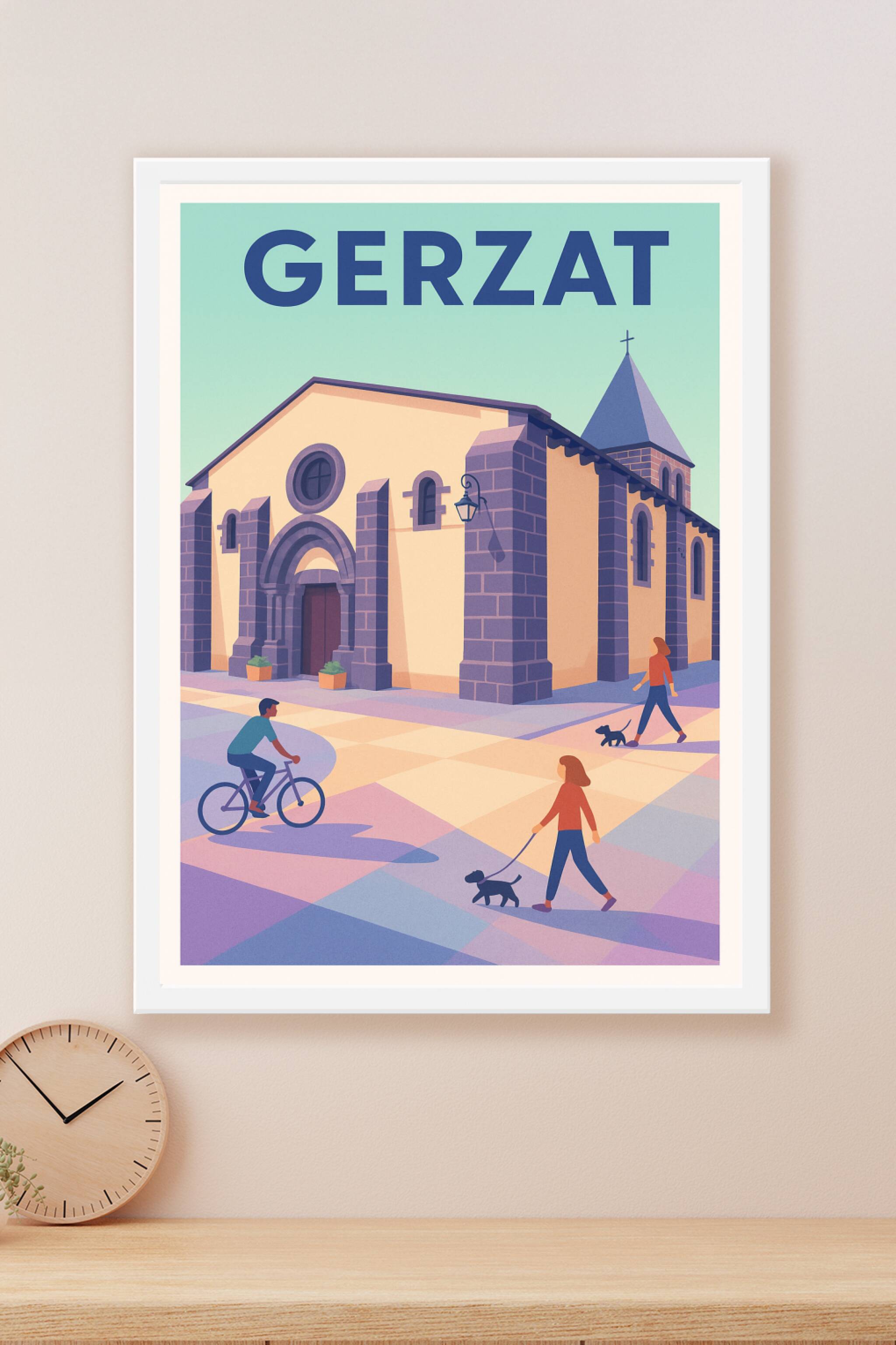 Découvrez l'ambiance paisible et conviviale de Gerzat avec cette affiche illustrée mettant en scène une architecture authentique et des habitants e...