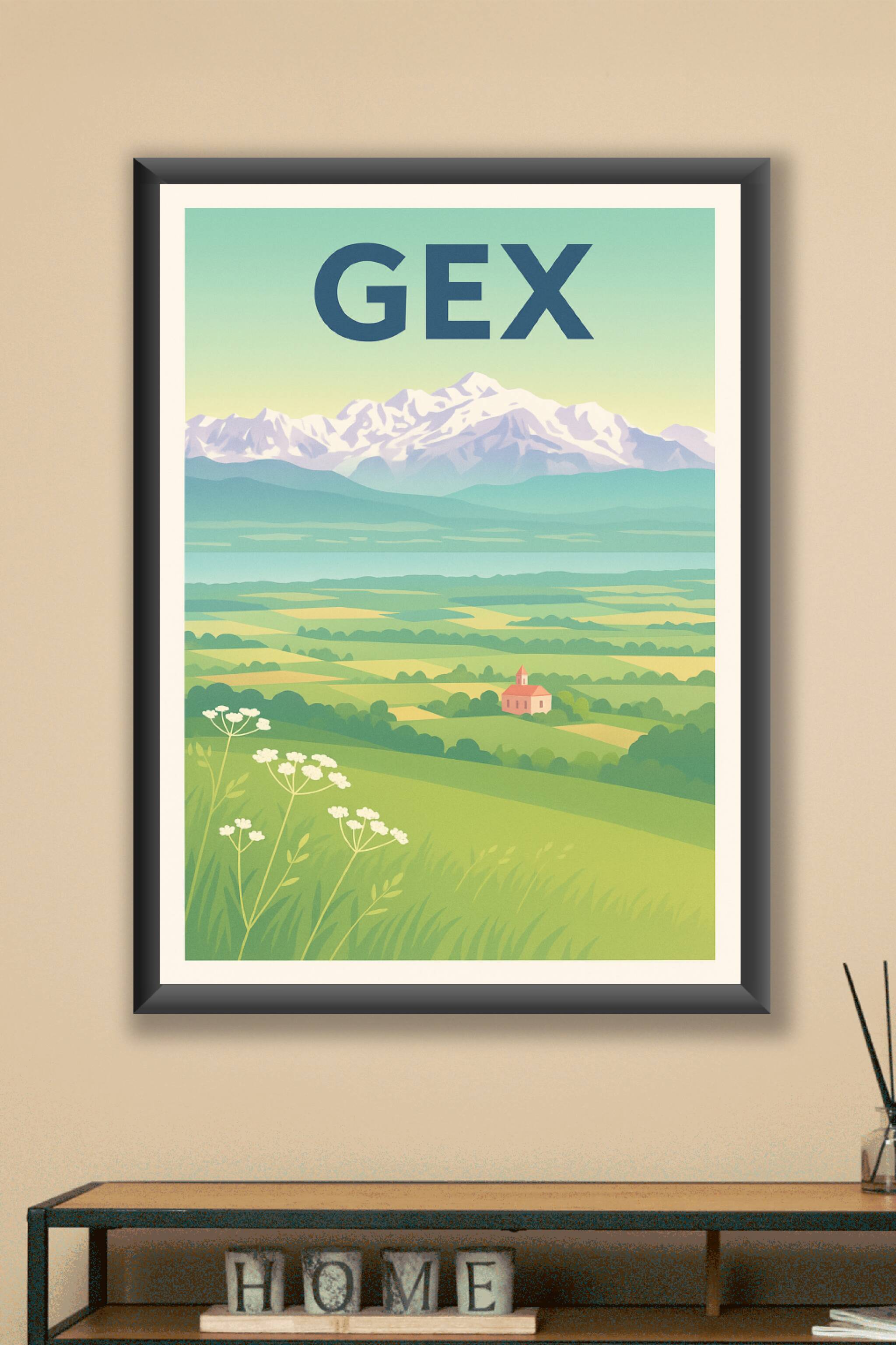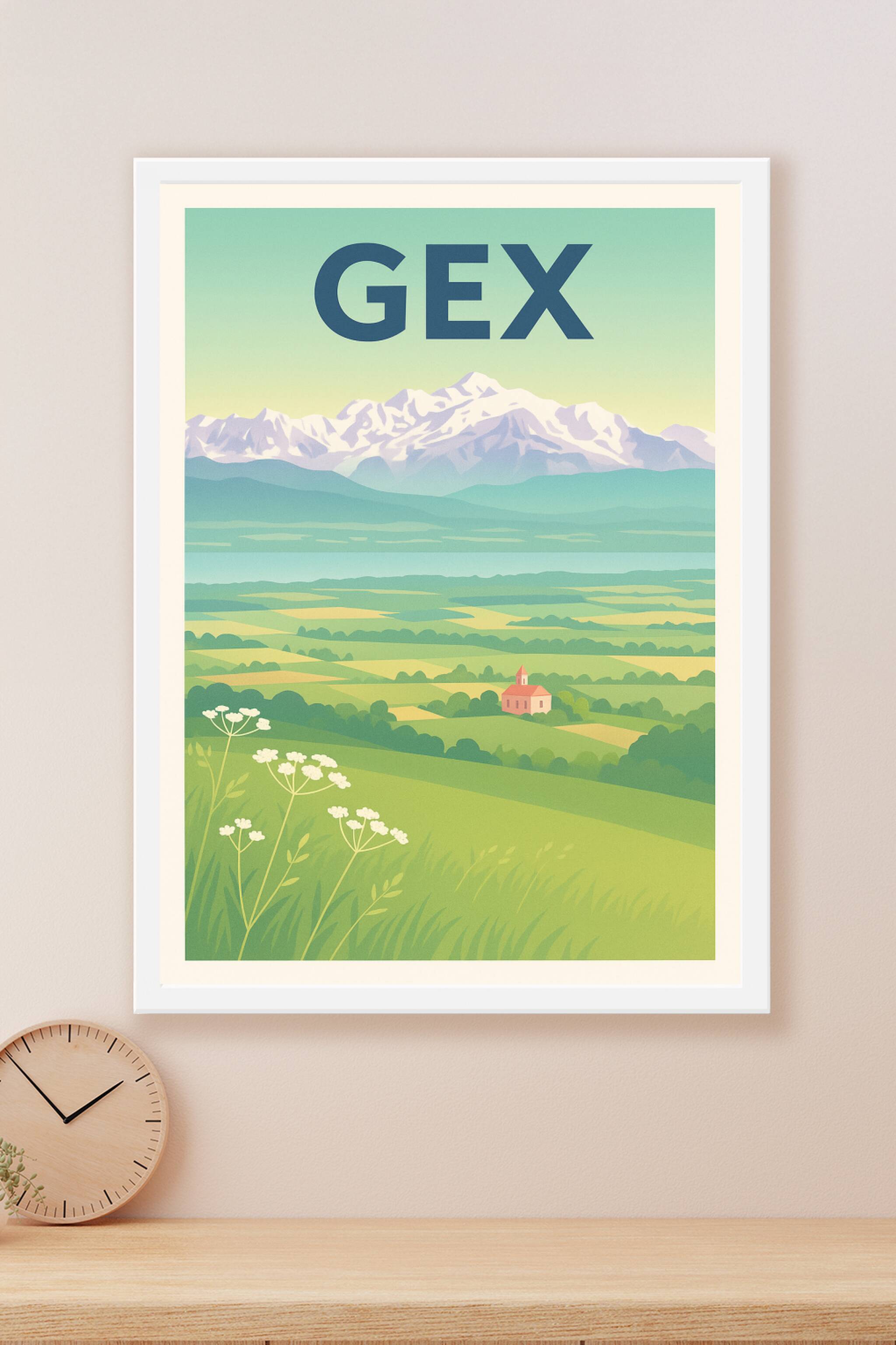 Découvrez la beauté paisible de Gex avec cette affiche illustrée mettant en valeur les vallées verdoyantes et les montagnes enneigées en arrière-pl...