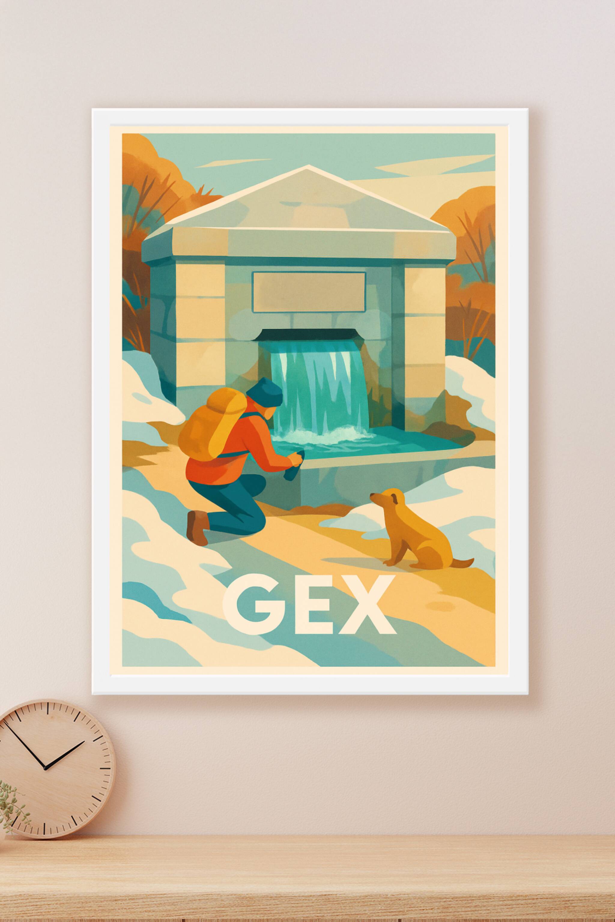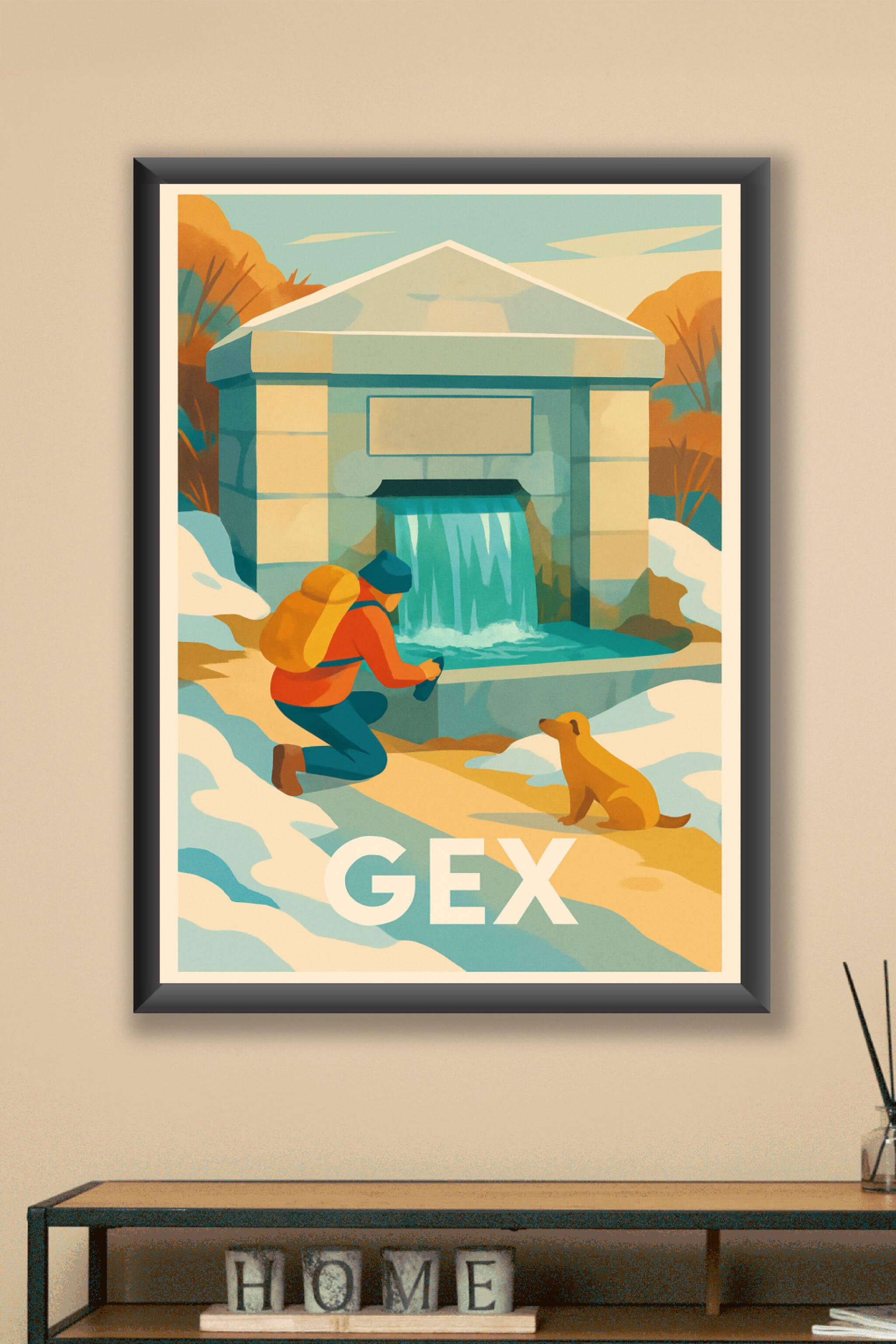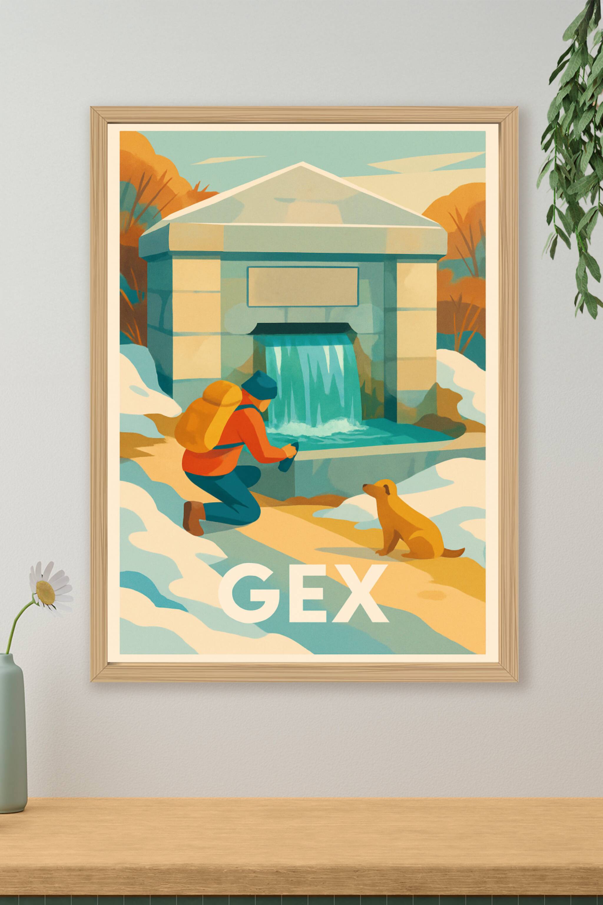 Découvrez l'atmosphère paisible et authentique de Gex avec cette affiche illustrée, mettant en scène un randonneur accompagné de son chien au bord ...