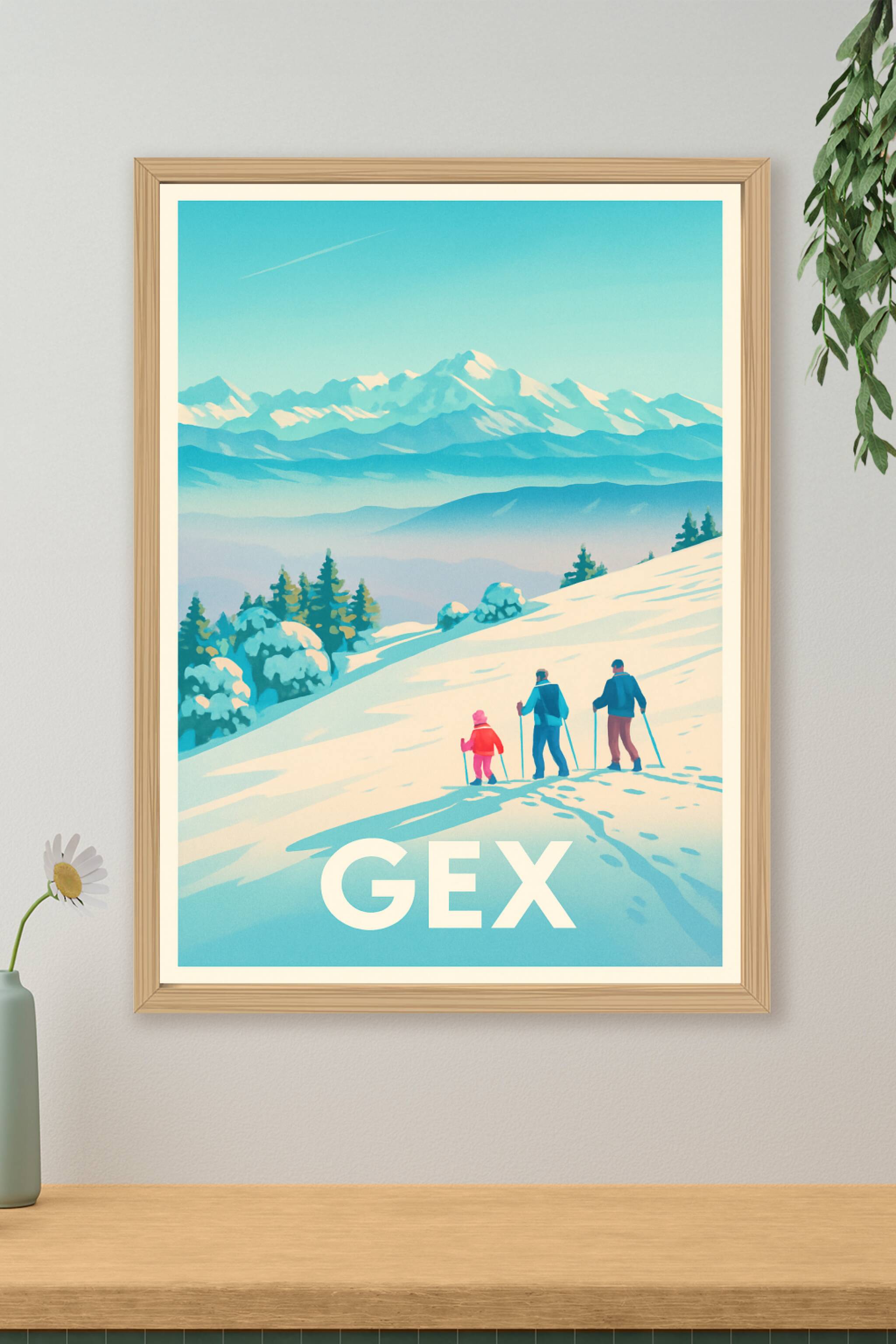 Découvrez la beauté hivernale de Gex avec cette affiche illustrée représentant une scène paisible de balade en raquettes sur un paysage enneigé, do...