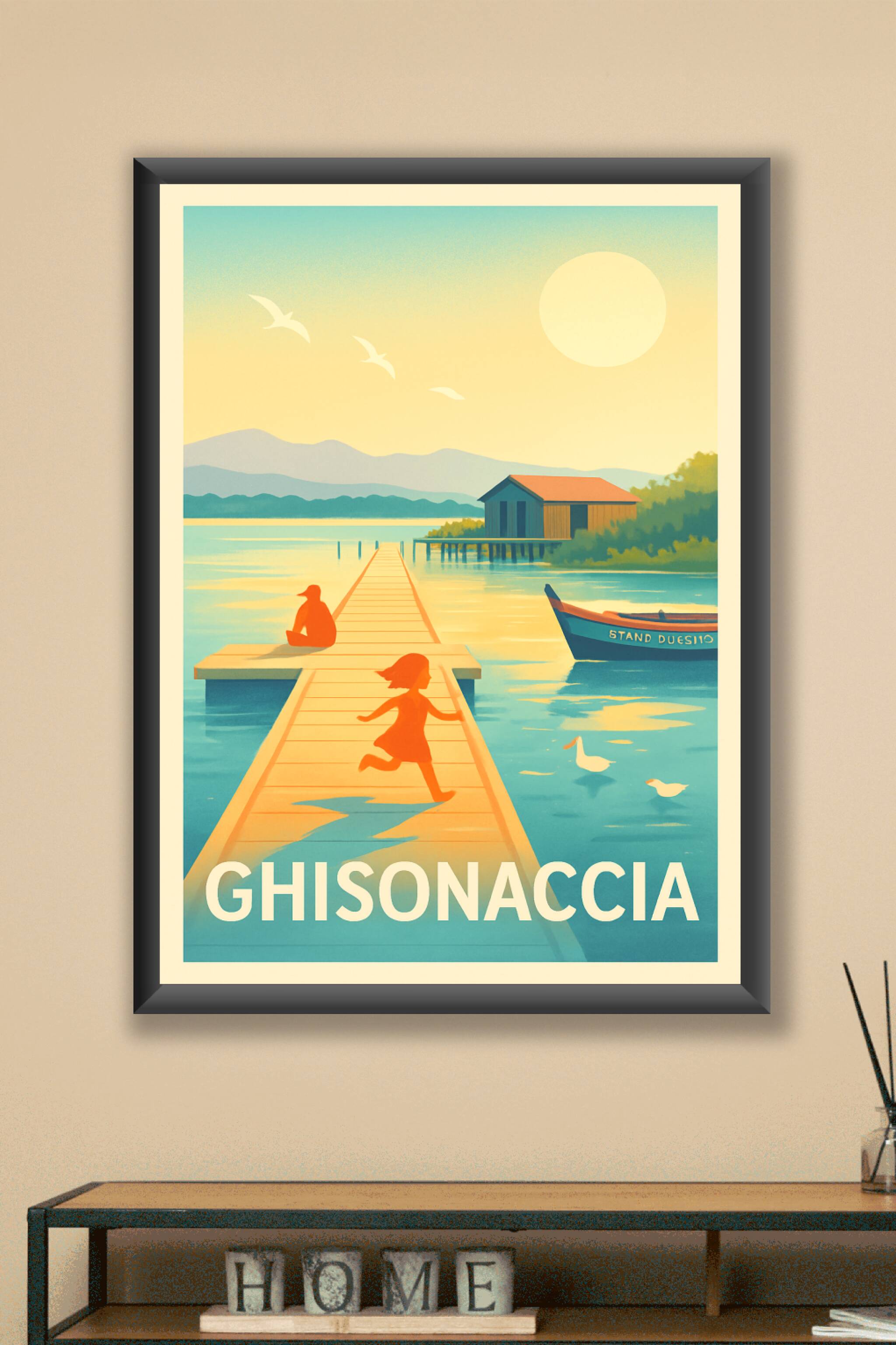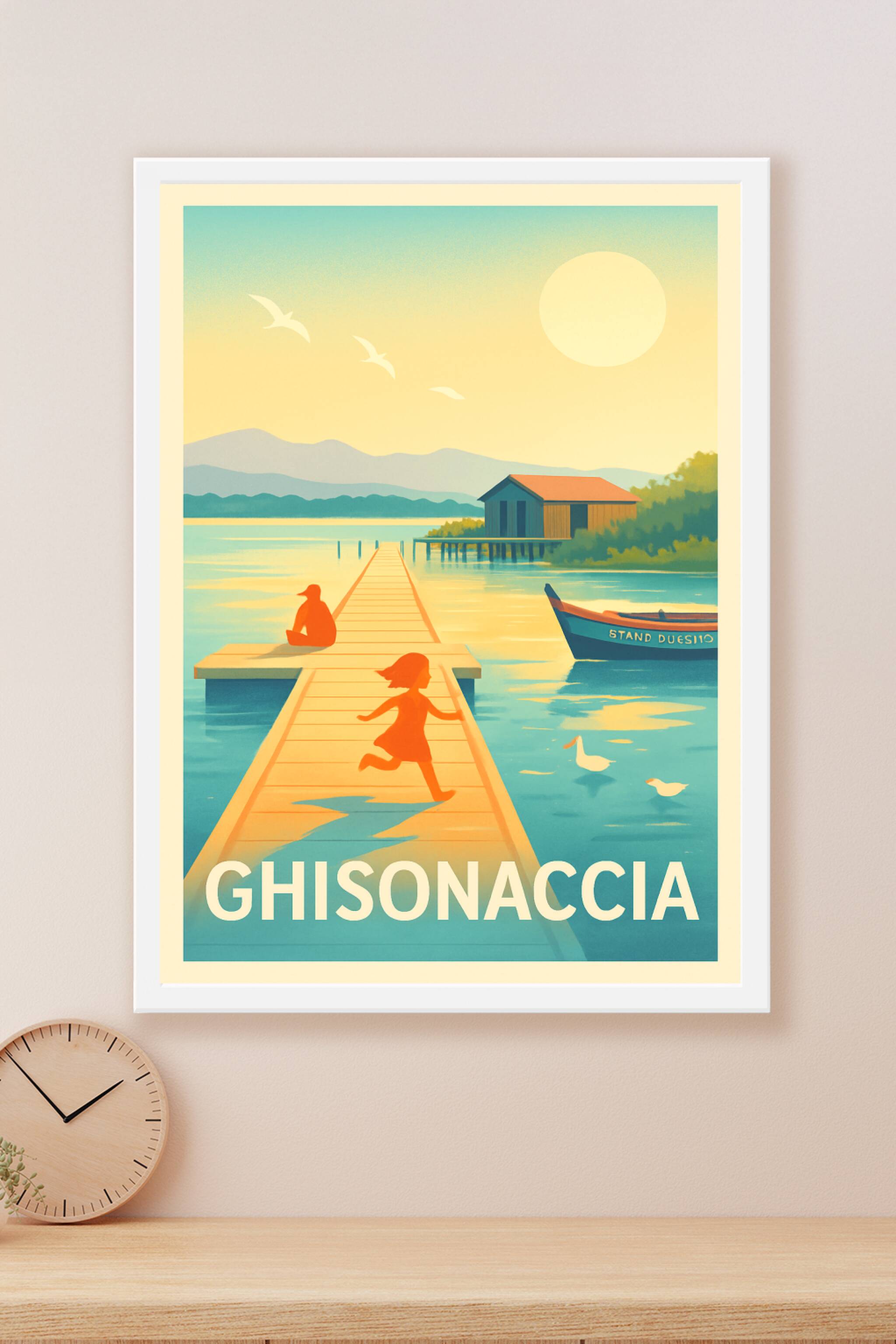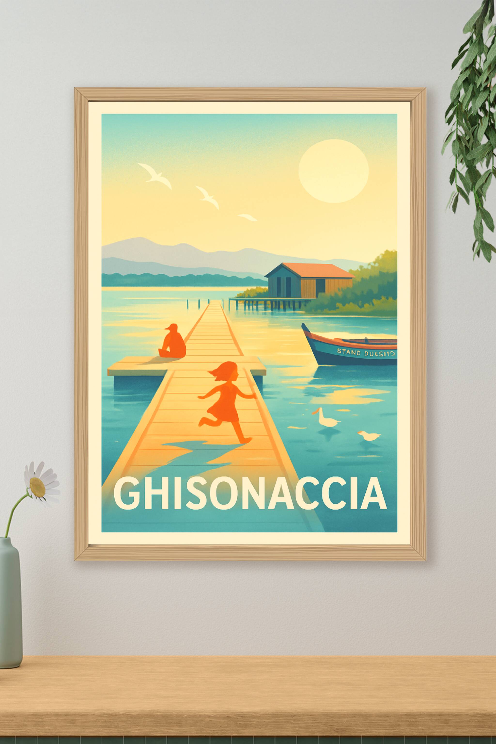 Découvrez la sérénité et la douceur de vivre de Ghisonaccia à travers cette affiche illustrée, où un ponton s'étire au-dessus d'une eau calme sous ...