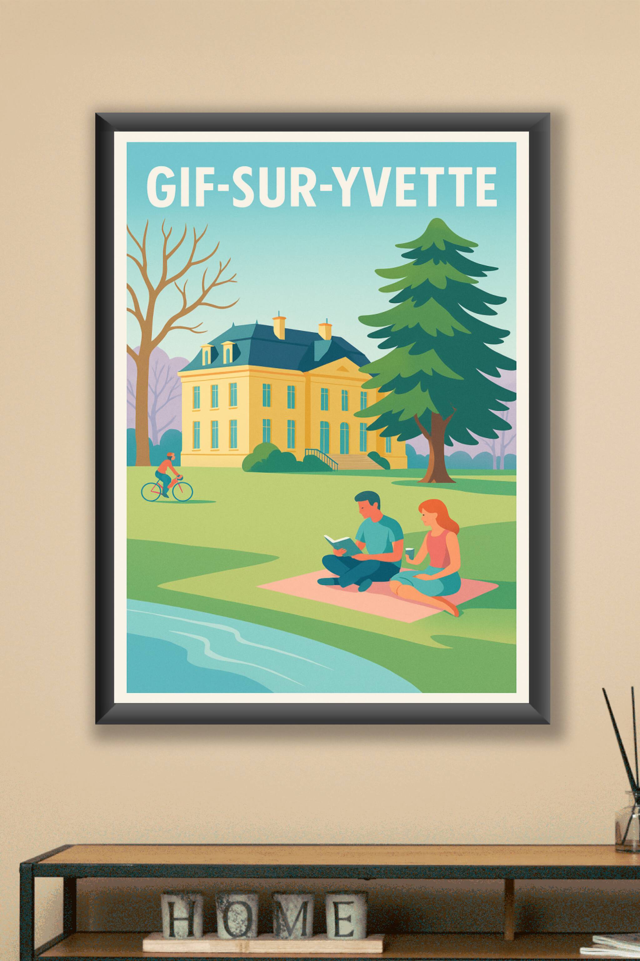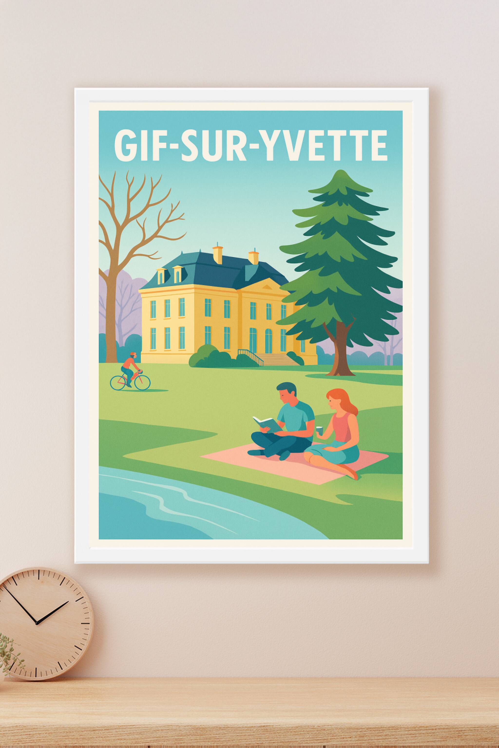 Découvrez la sérénité de Gif-sur-Yvette avec cette affiche illustrant une scène paisible dans un parc verdoyant, où un couple profite d’un moment de détente au bord de l’eau, à l’ombre d’un majestueux arbre et face à une belle demeure historique. Ce poster, au style doux et vintage, apportera une touche de calme et de nature à votre décoration intérieure. Imprimé en tirage "Fine Art" sur un papier coton 305g de haute qualité, il garantit des couleurs éclatantes et une finition parfaite. Disponible en plusieurs formats allant de A1 à A4, avec ou sans cadre, cette affiche est un choix idéal pour embellir votre intérieur ou offrir un cadeau raffiné aux amoureux de la ville et de la campagne.