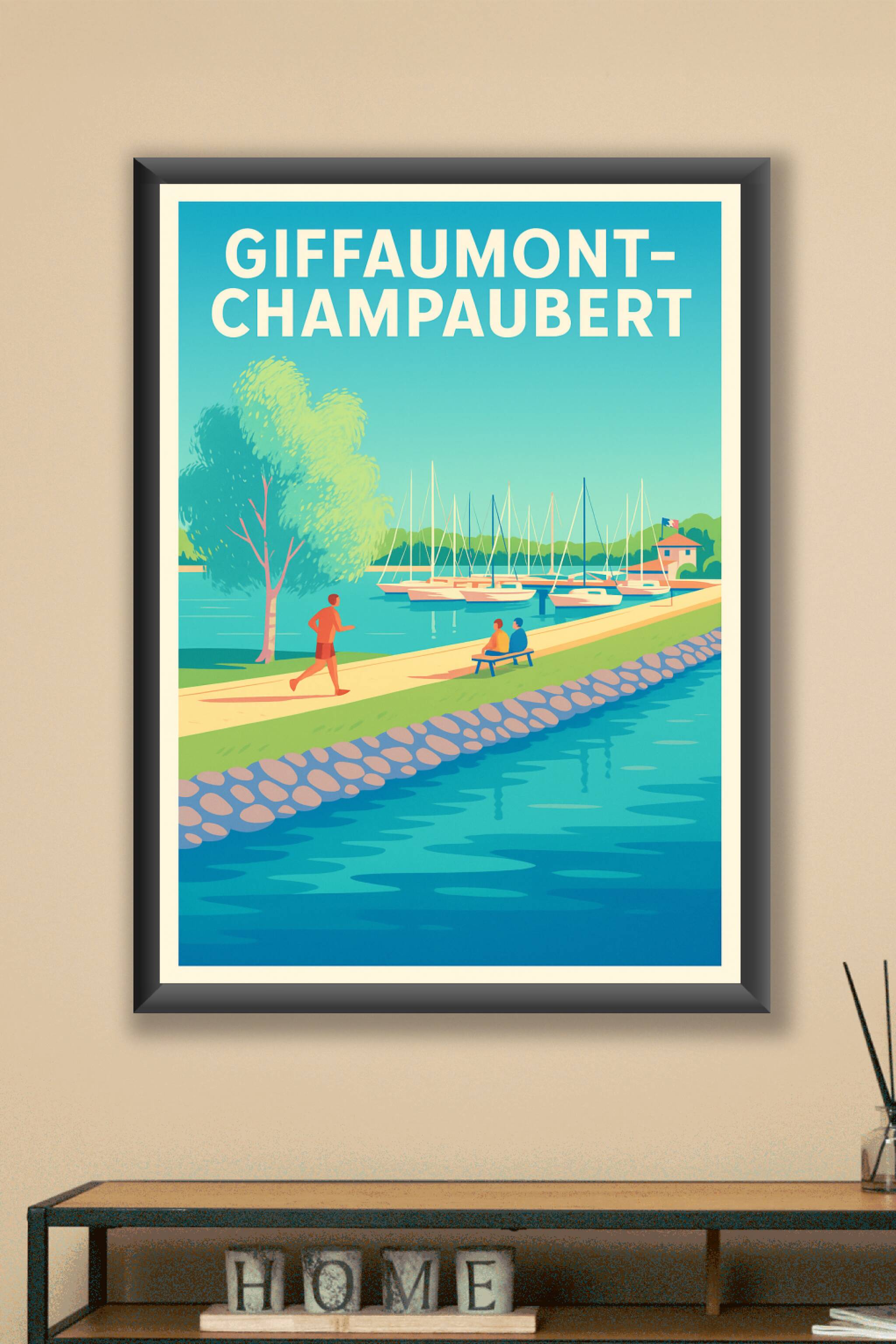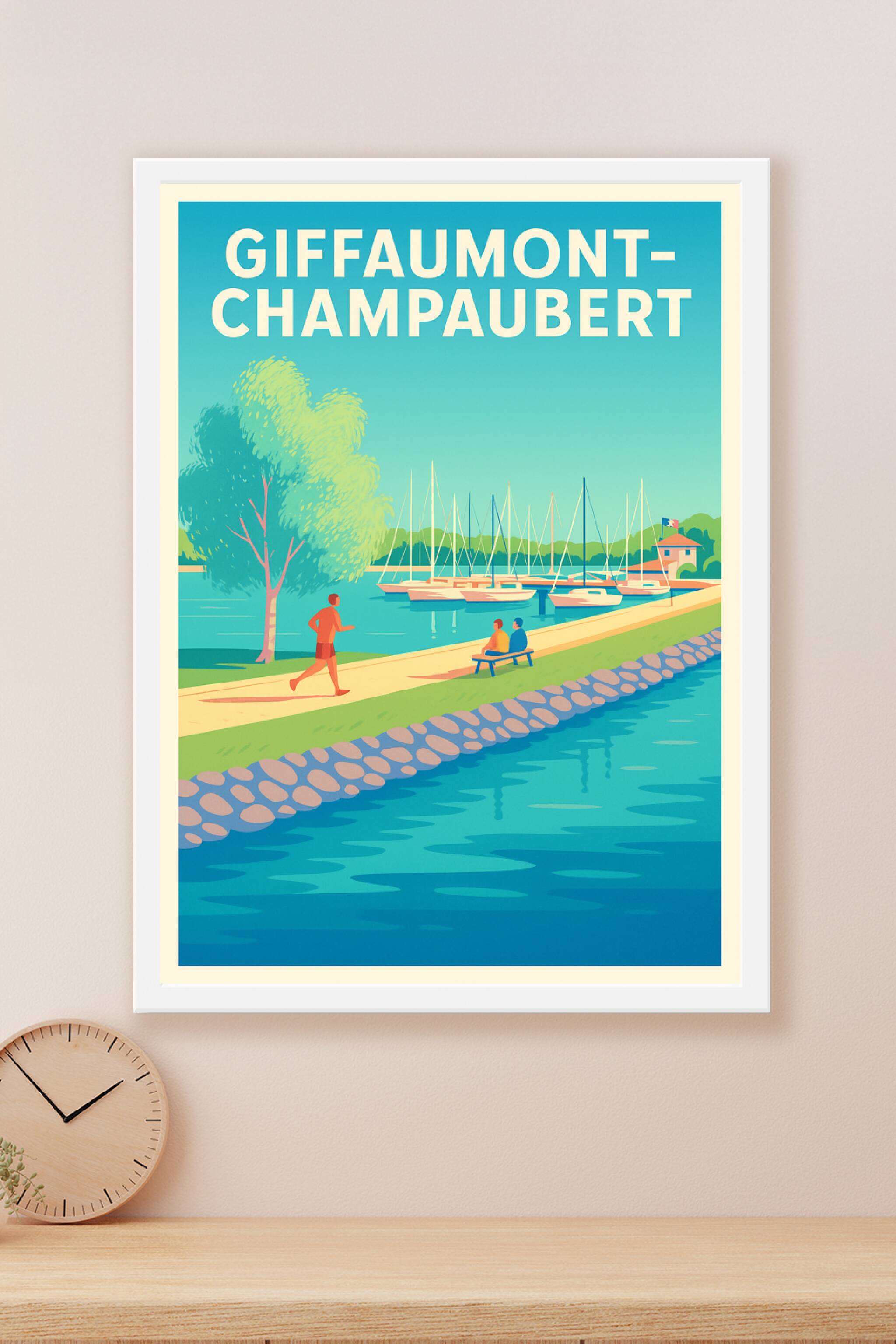 Découvrez la sérénité et le charme naturel de Giffaumont-Champaubert avec cette affiche illustrée mettant en scène une promenade au bord du lac, de...
