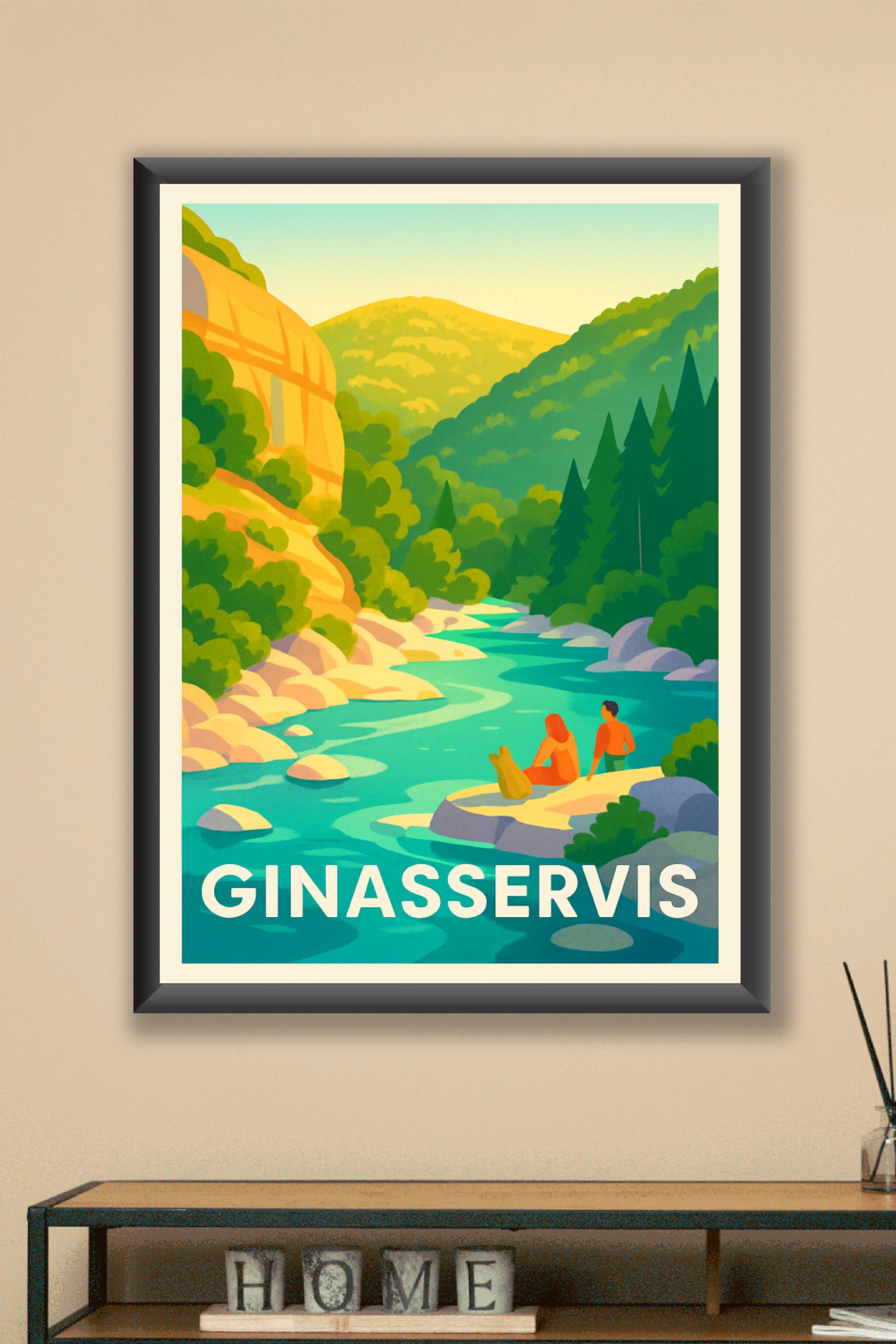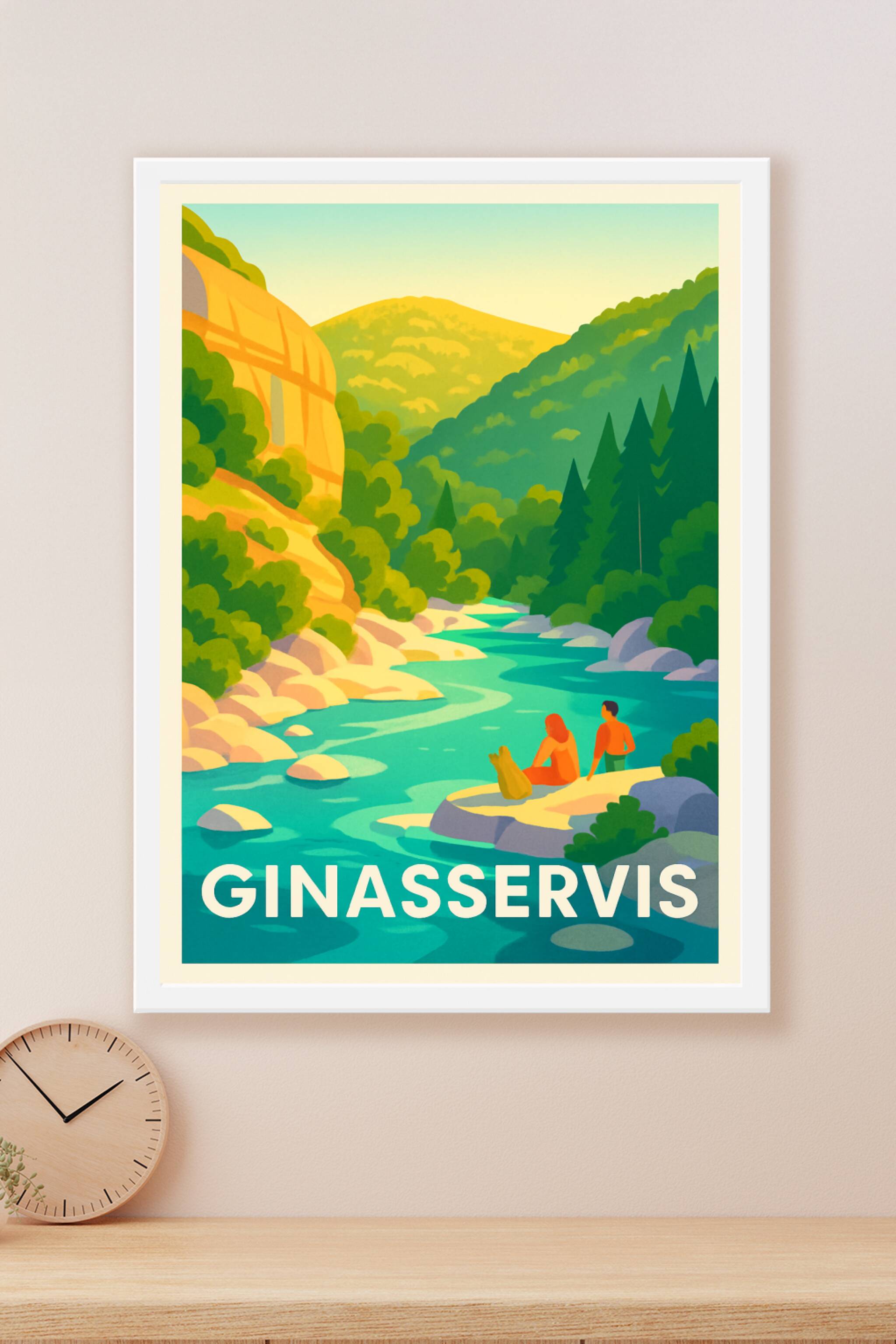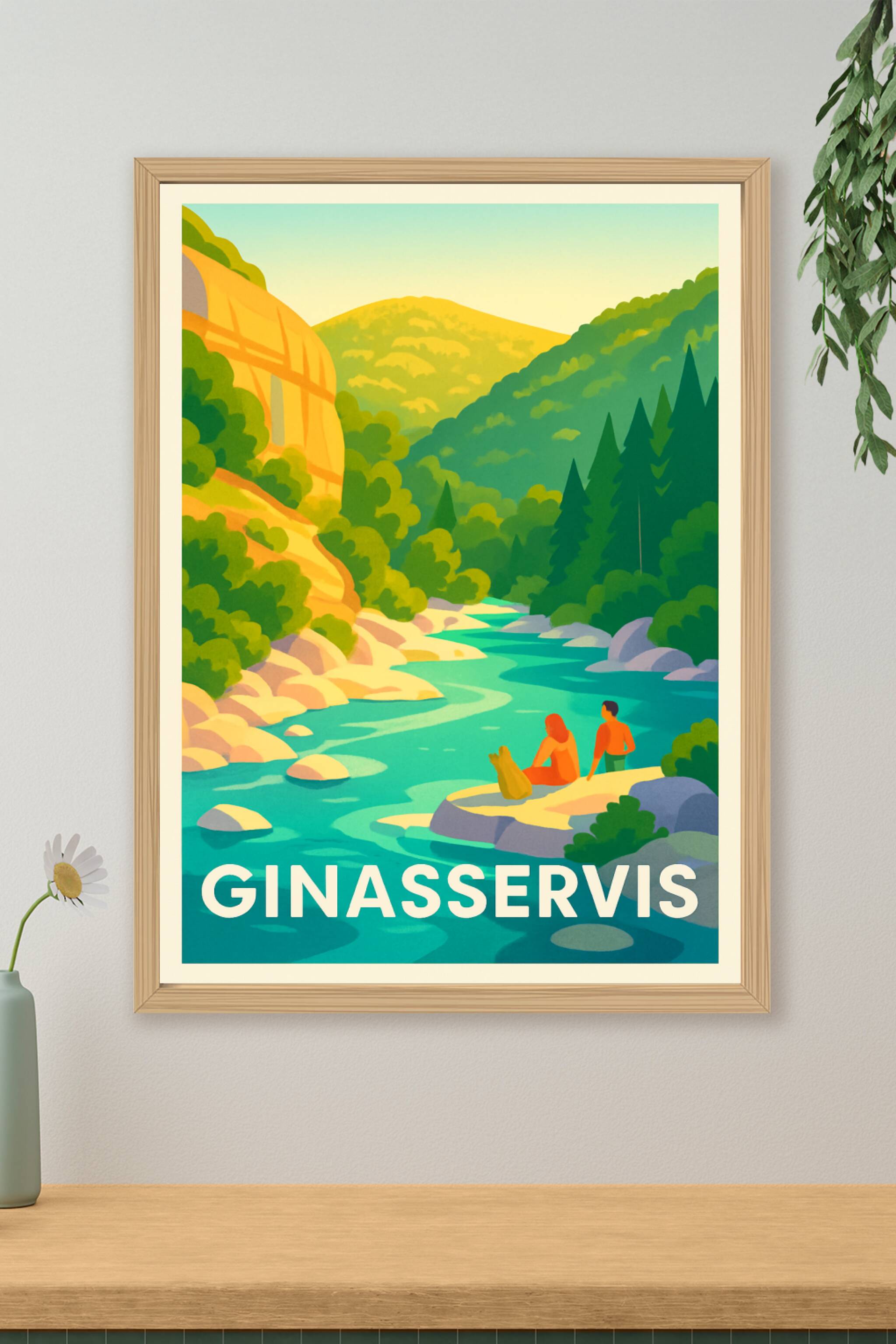 Découvrez la sérénité et la beauté naturelle de Ginasservis avec cette affiche illustrée représentant une scène paisible au bord d'une rivière turq...