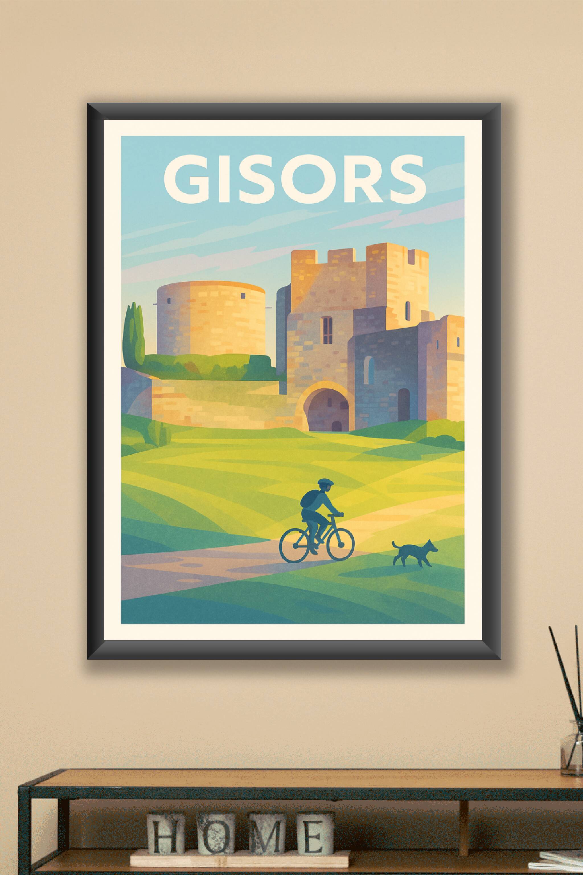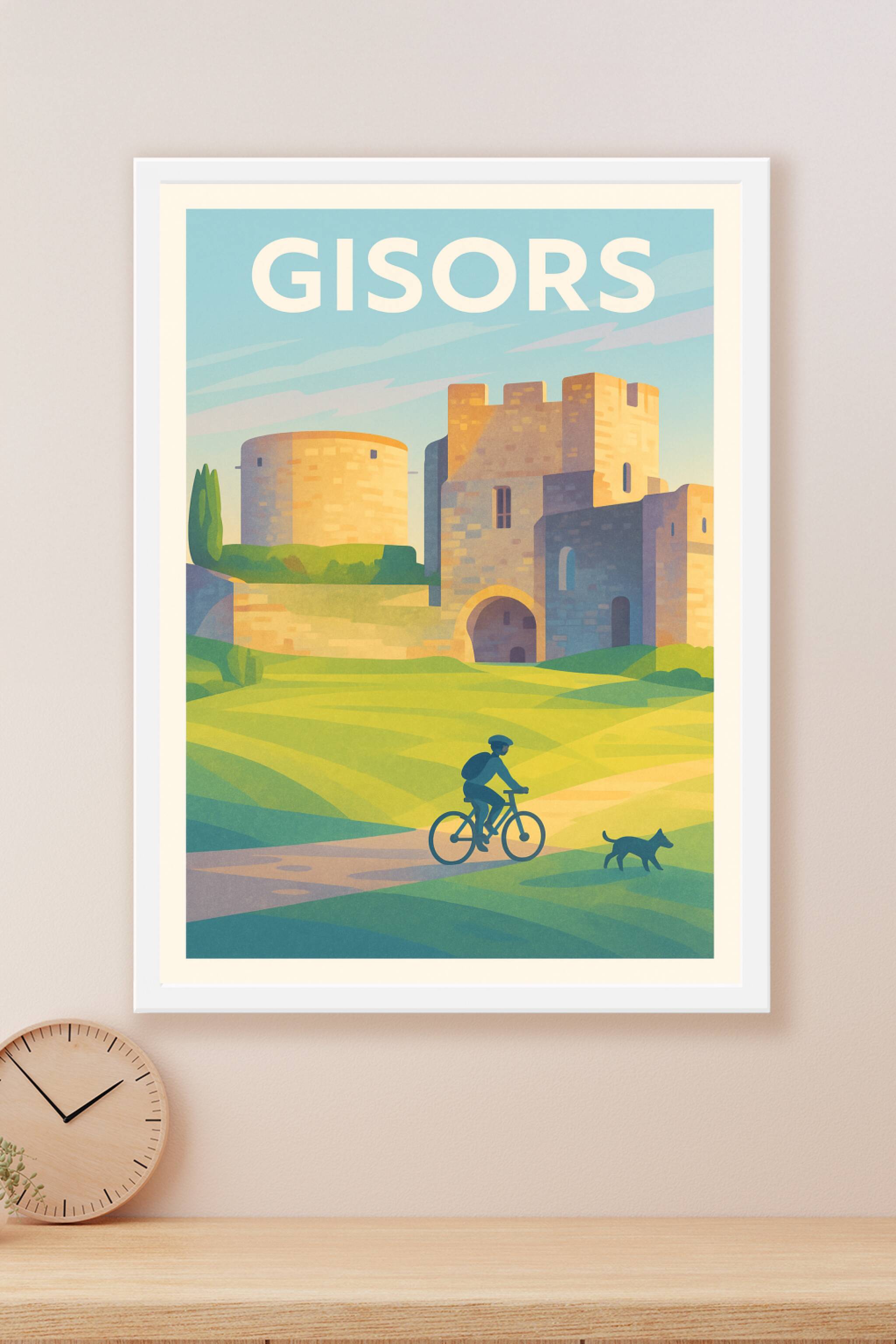 Découvrez l'atmosphère paisible et bucolique de Gisors avec cette affiche illustrée mettant en avant son château médiéval emblématique. Un personna...