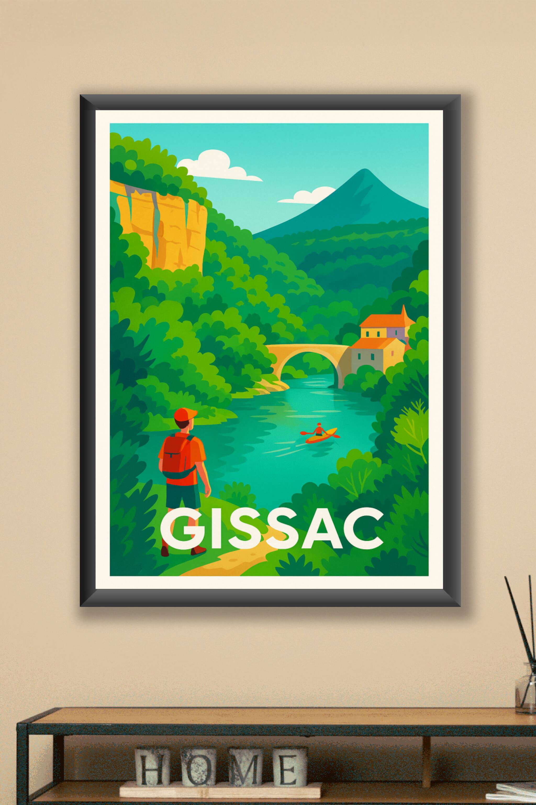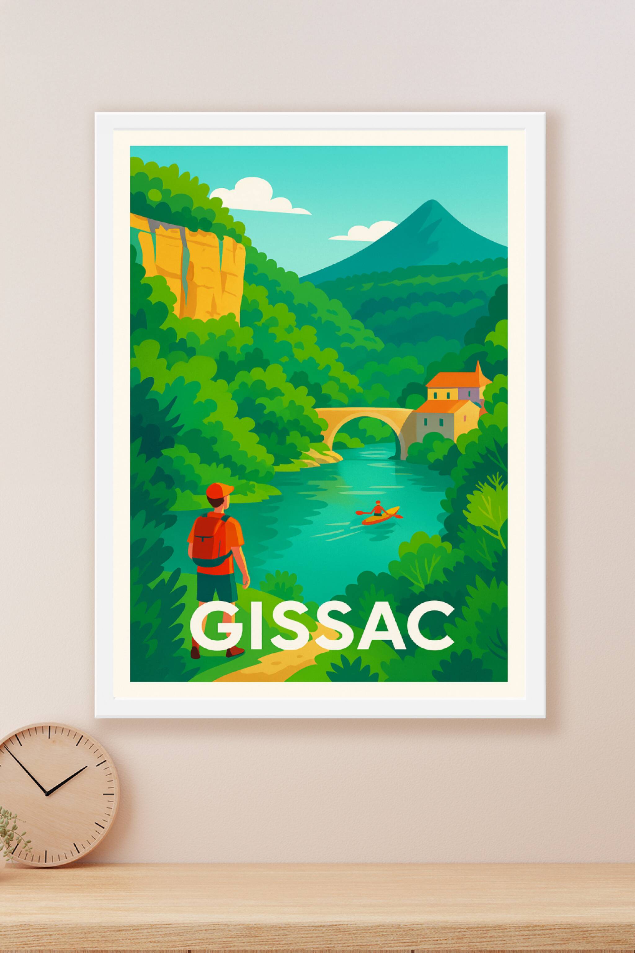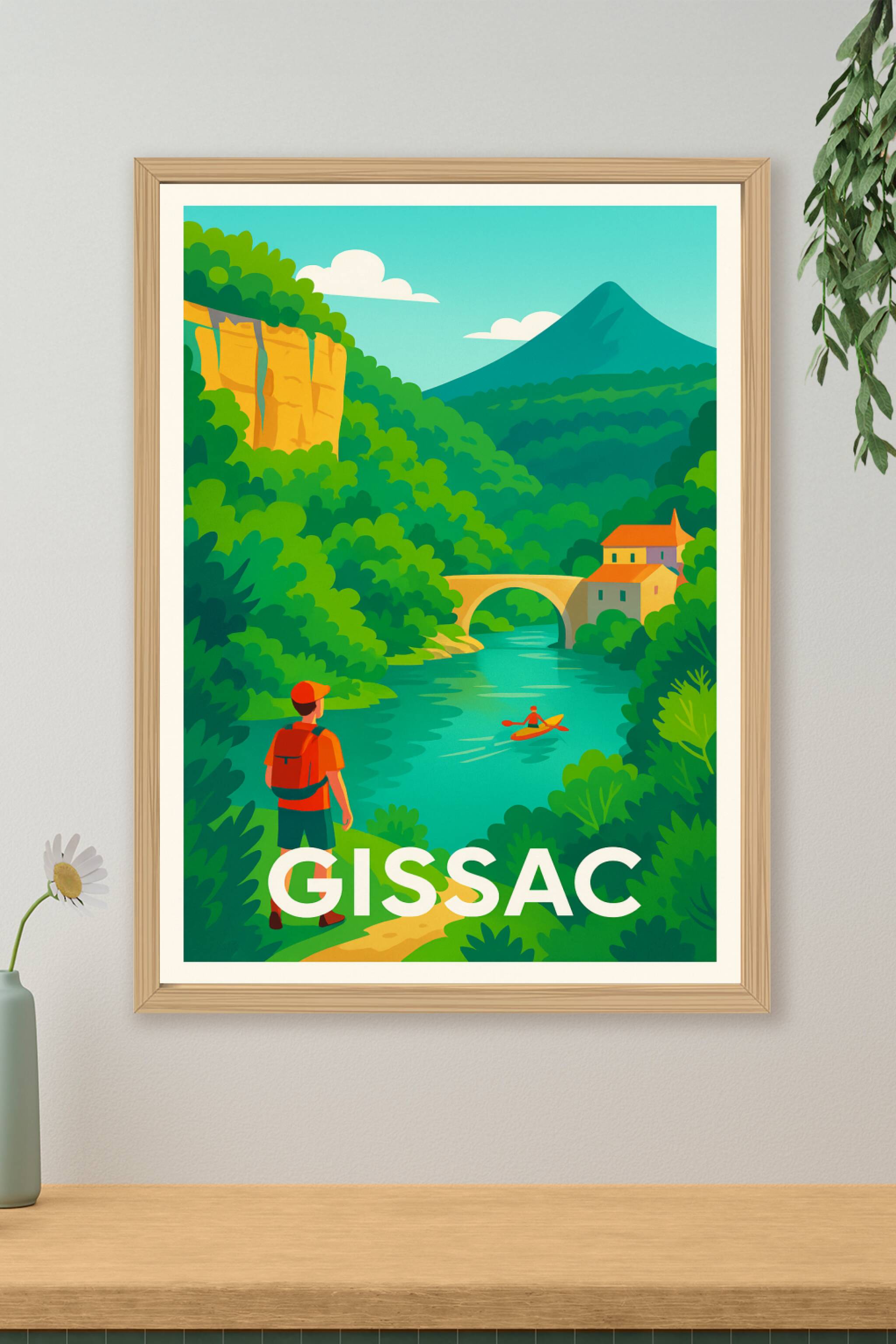 Découvrez Gissac à travers cette affiche illustrée qui capture l'essence paisible et verdoyante de cette charmante destination. Entre rivières limp...