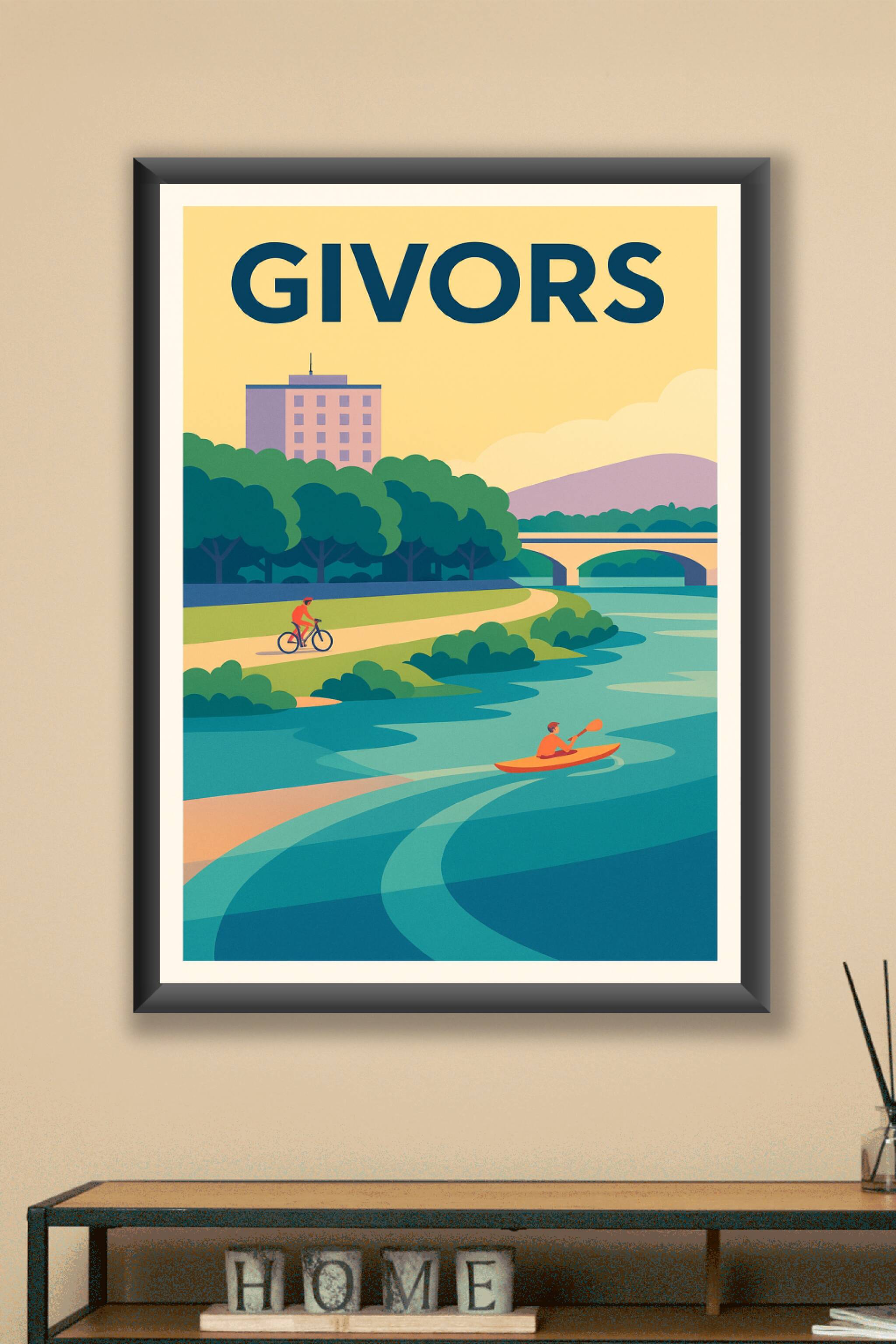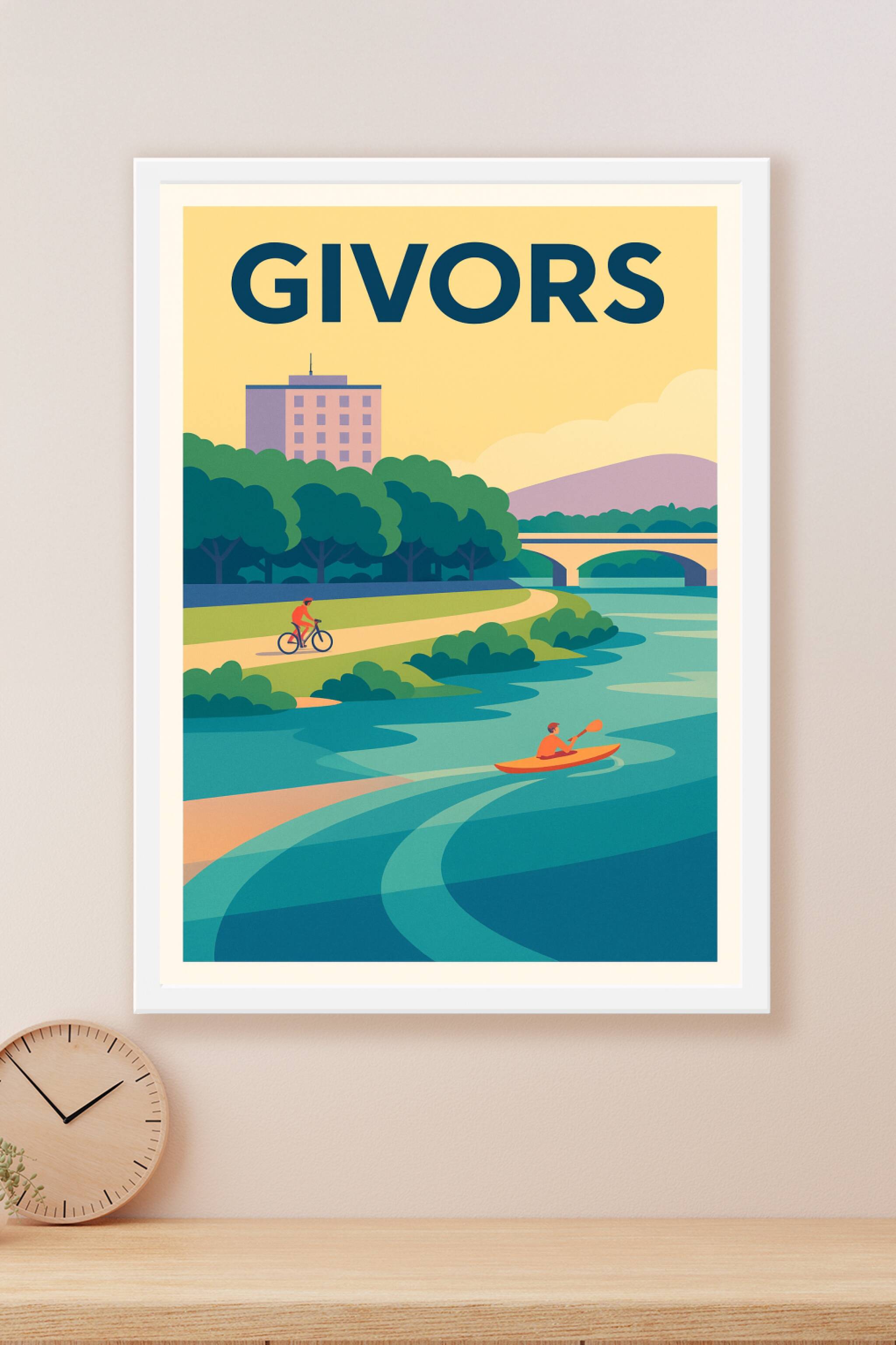 Découvrez la sérénité de Givors avec cette affiche illustrée aux couleurs apaisantes, mettant en scène un paysage naturel rythmée par la rivière, u...