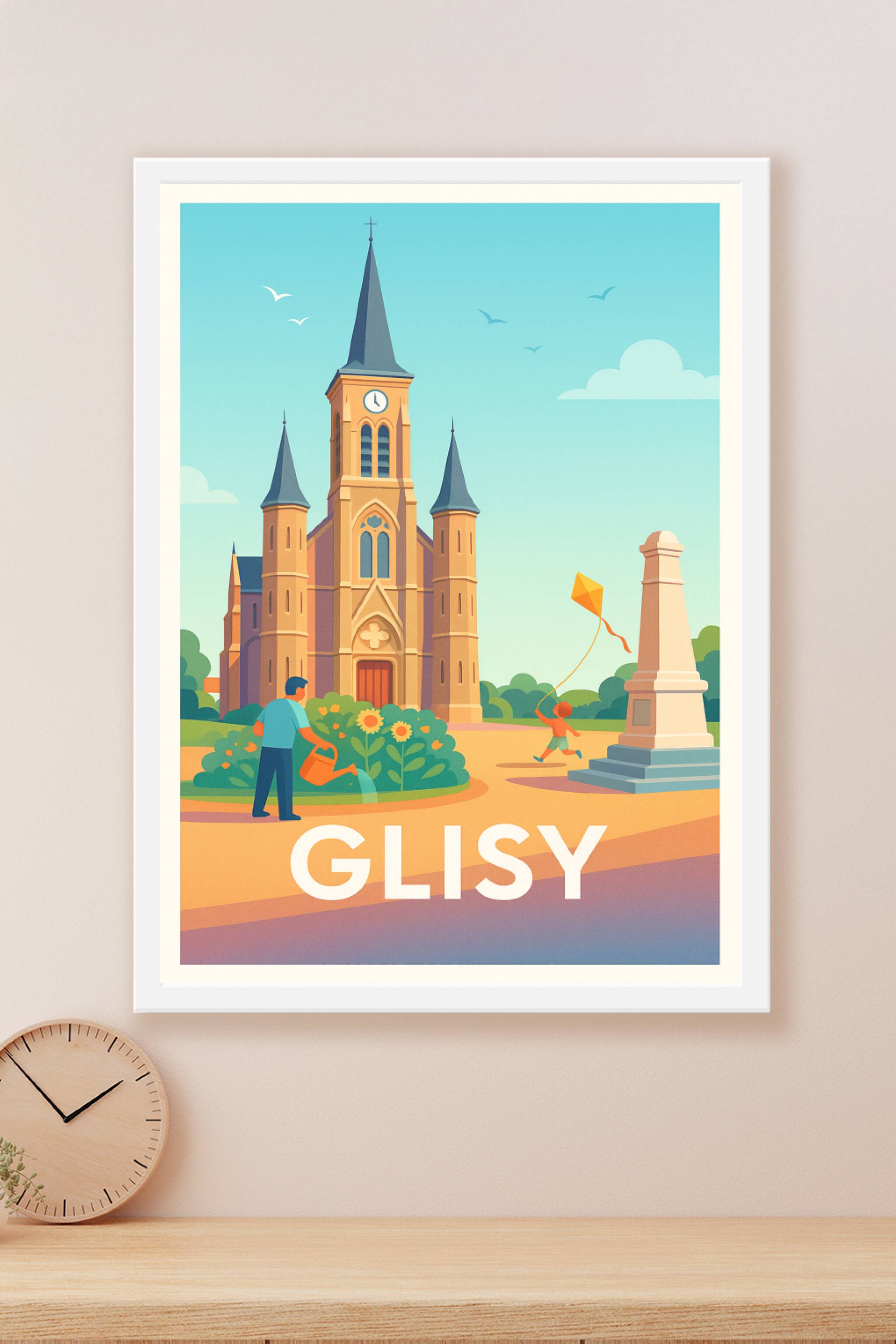 Découvrez la douceur de vivre du charmant village de Glisy avec cette affiche illustrée mettant en scène son église emblématique et un environnemen...