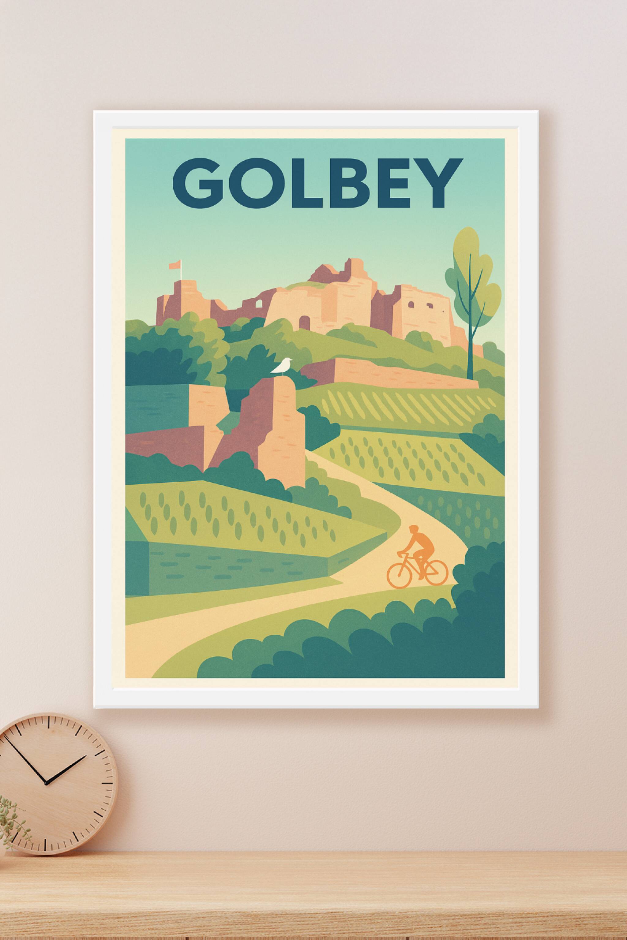 Découvrez le charme paisible de Golbey à travers cette affiche vintage illustrée, mettant en valeur ses paysages verdoyants et ses ruines historiqu...