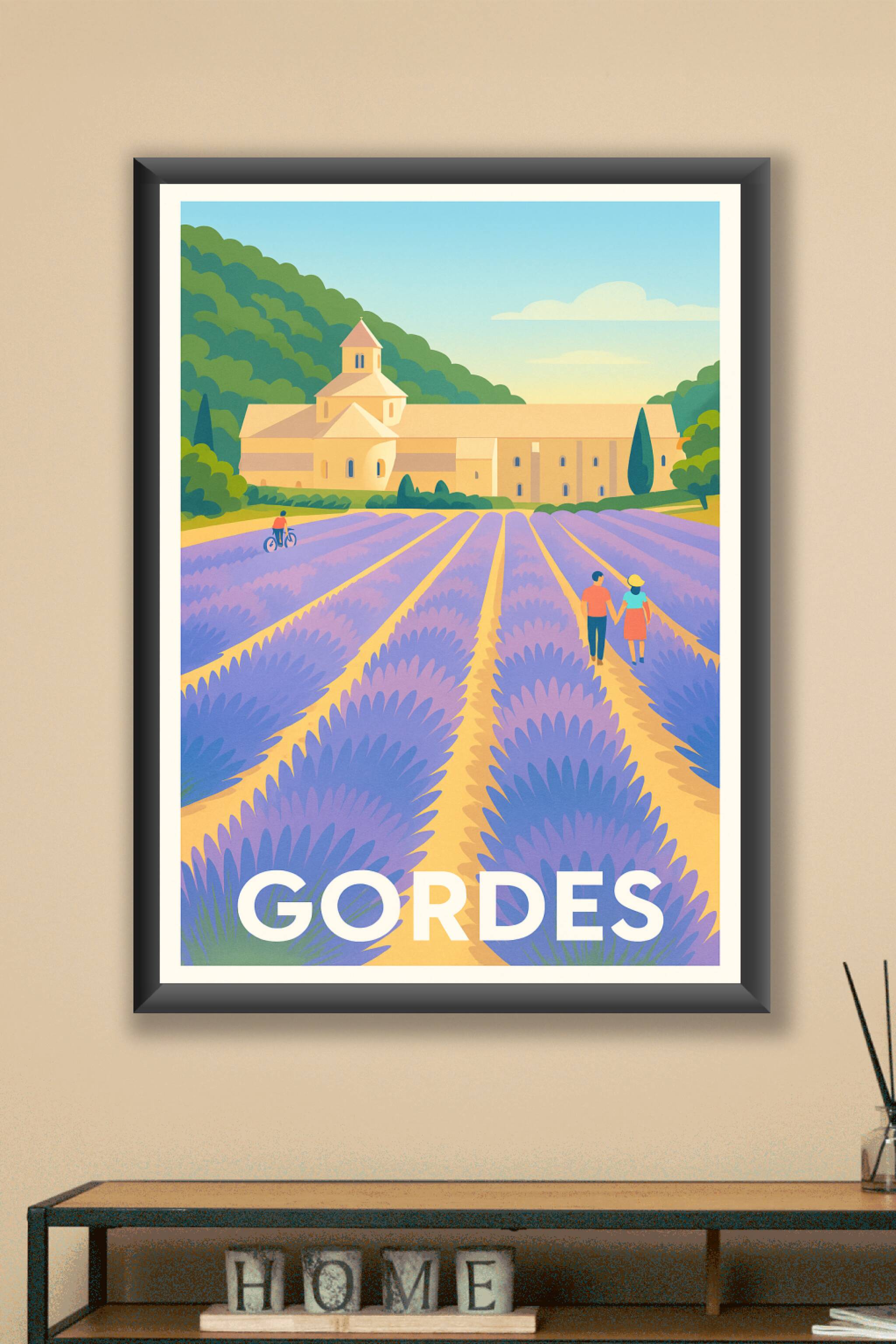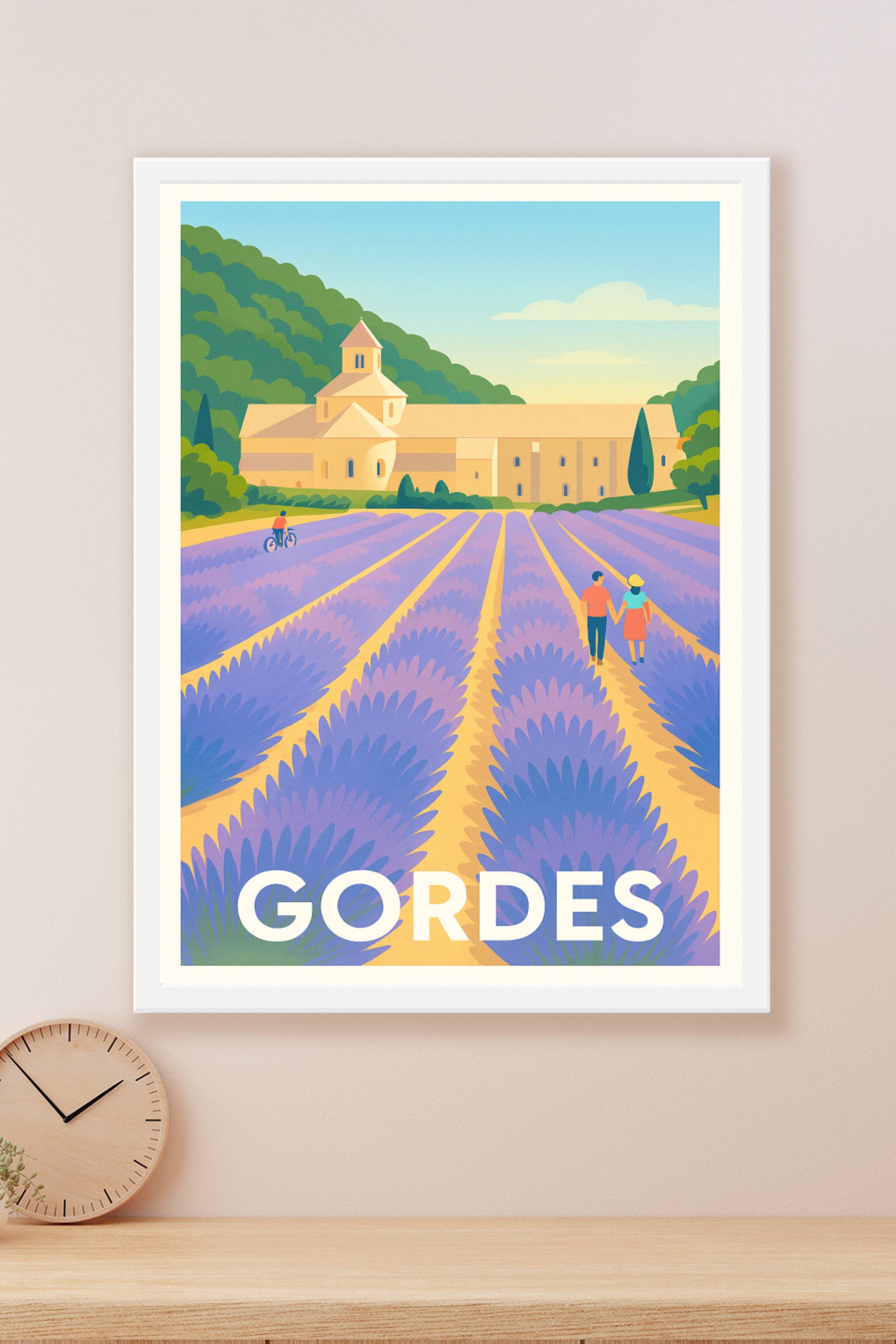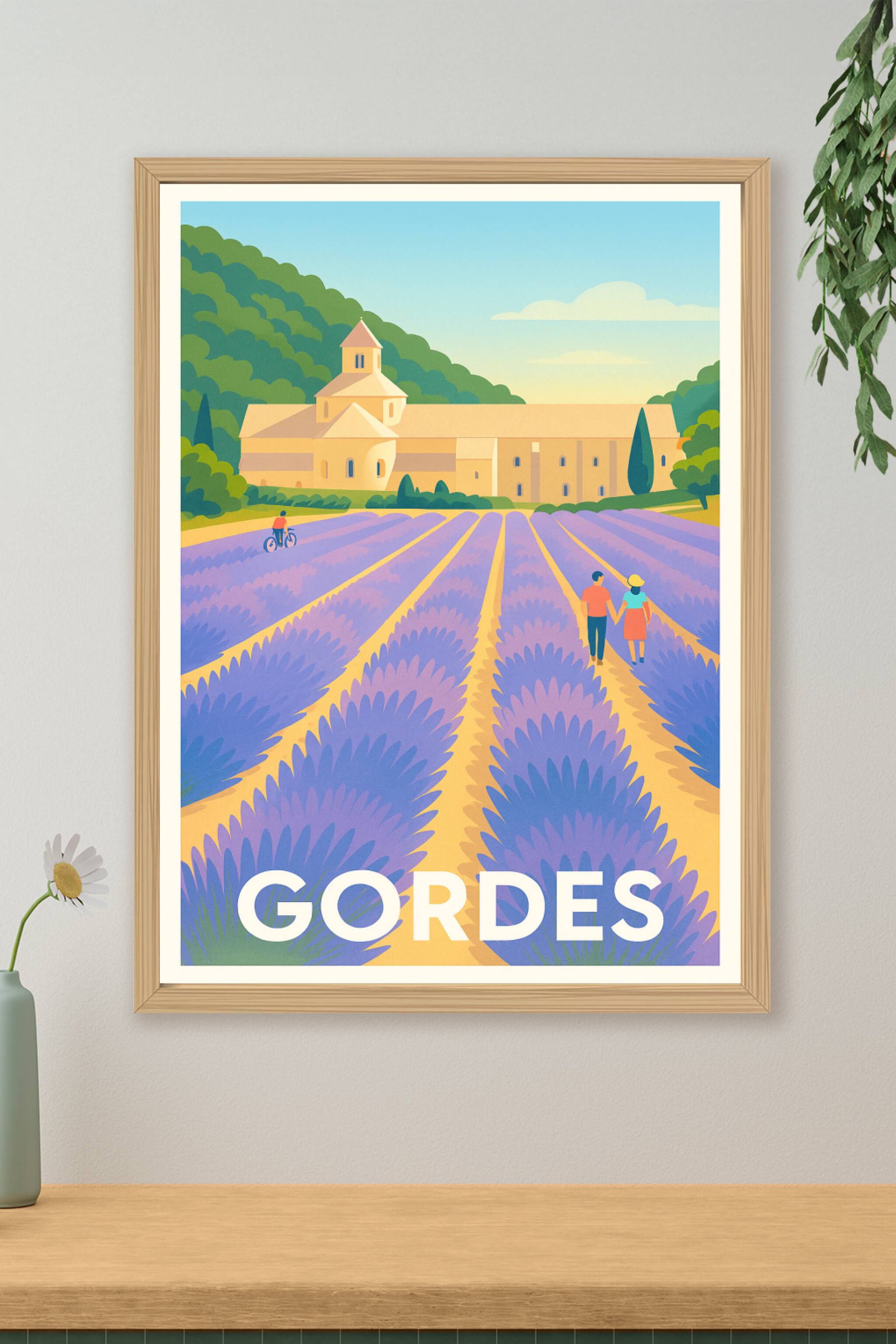 Découvrez la quiétude et le charme authentique de Gordes avec cette affiche illustrée mettant en scène les célèbres champs de lavande et l'abbaye e...