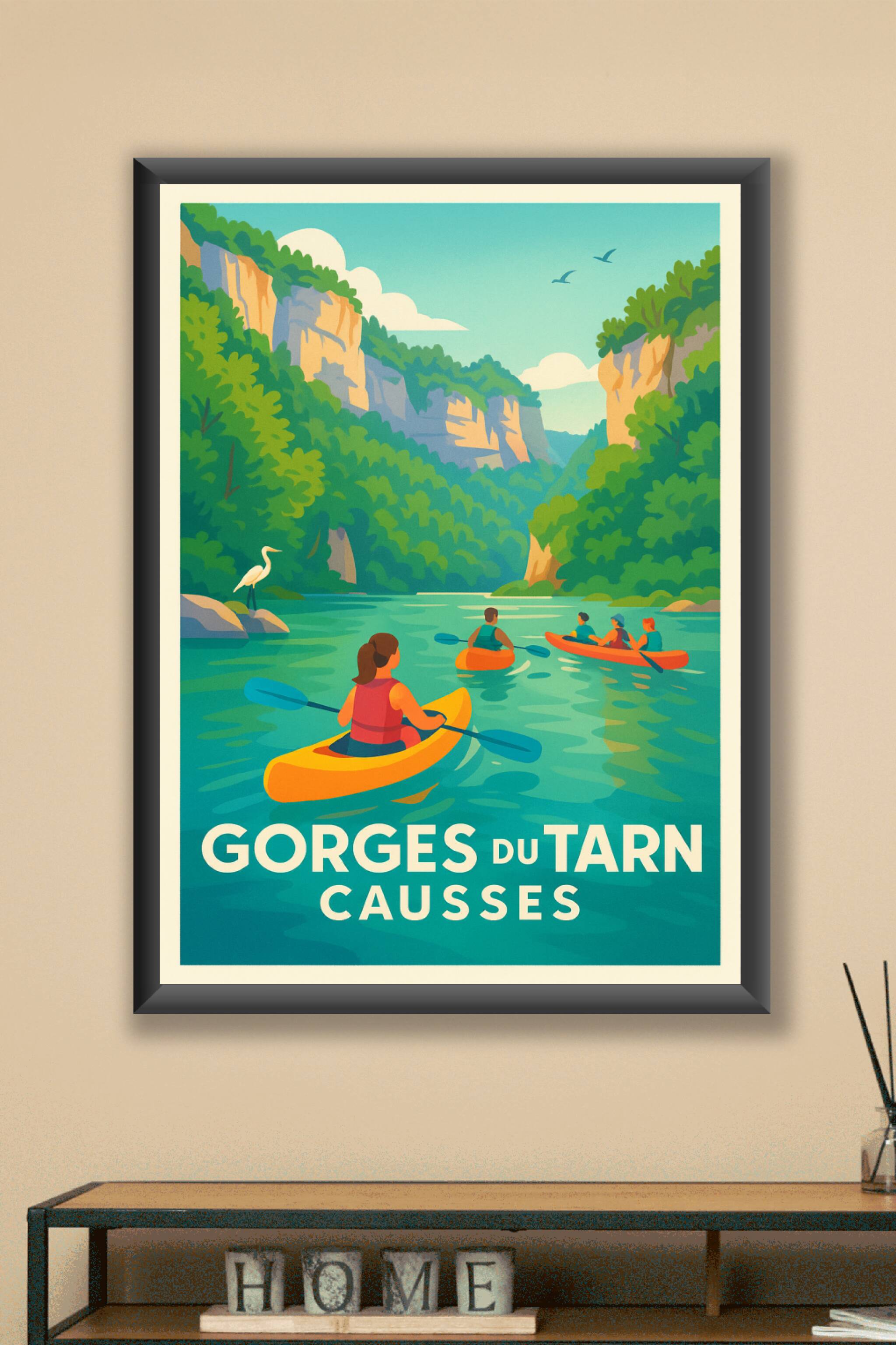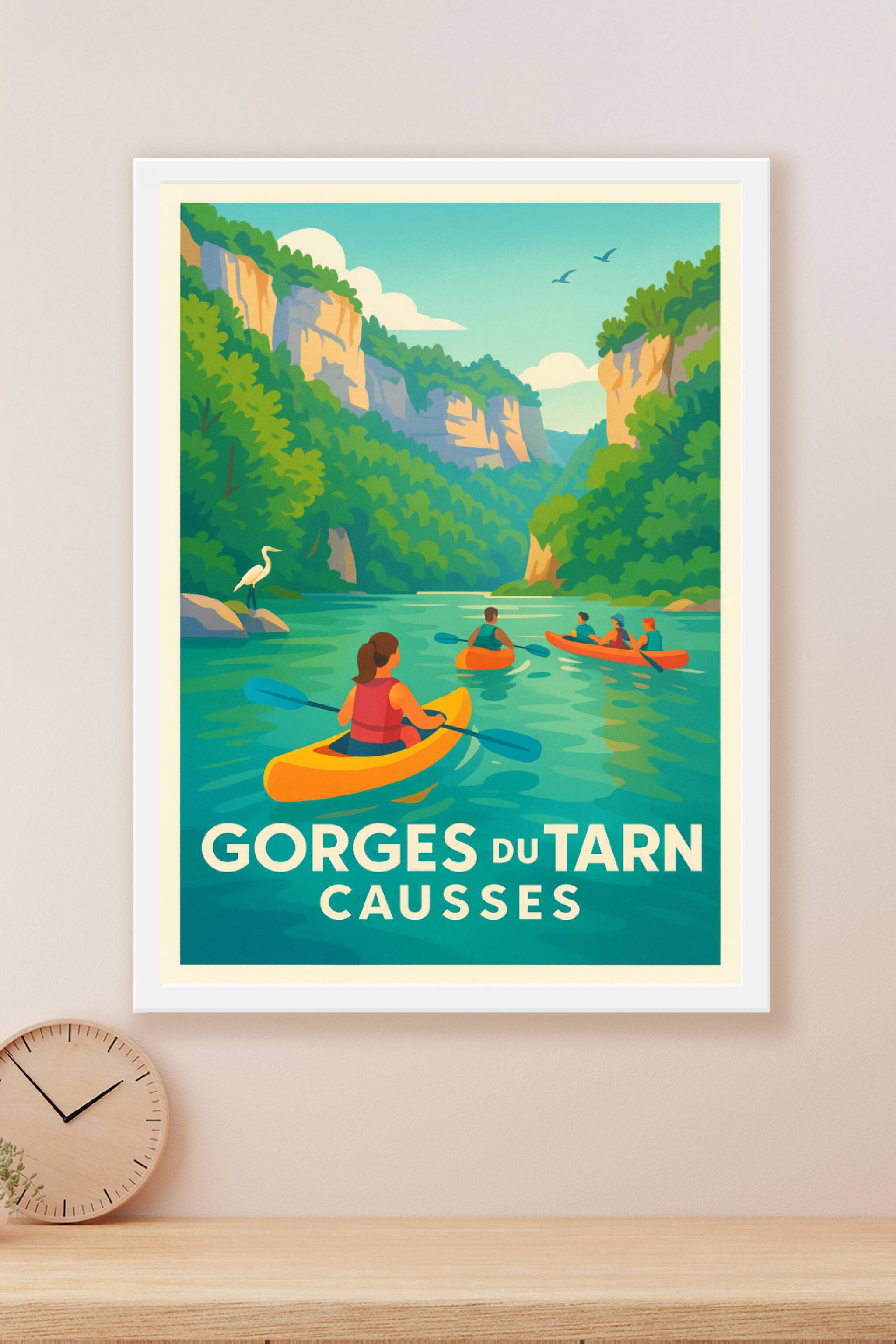 Découvrez la beauté sauvage et apaisante des Gorges du Tarn avec cette affiche illustrée aux couleurs vives et à l'ambiance conviviale de pleine na...
