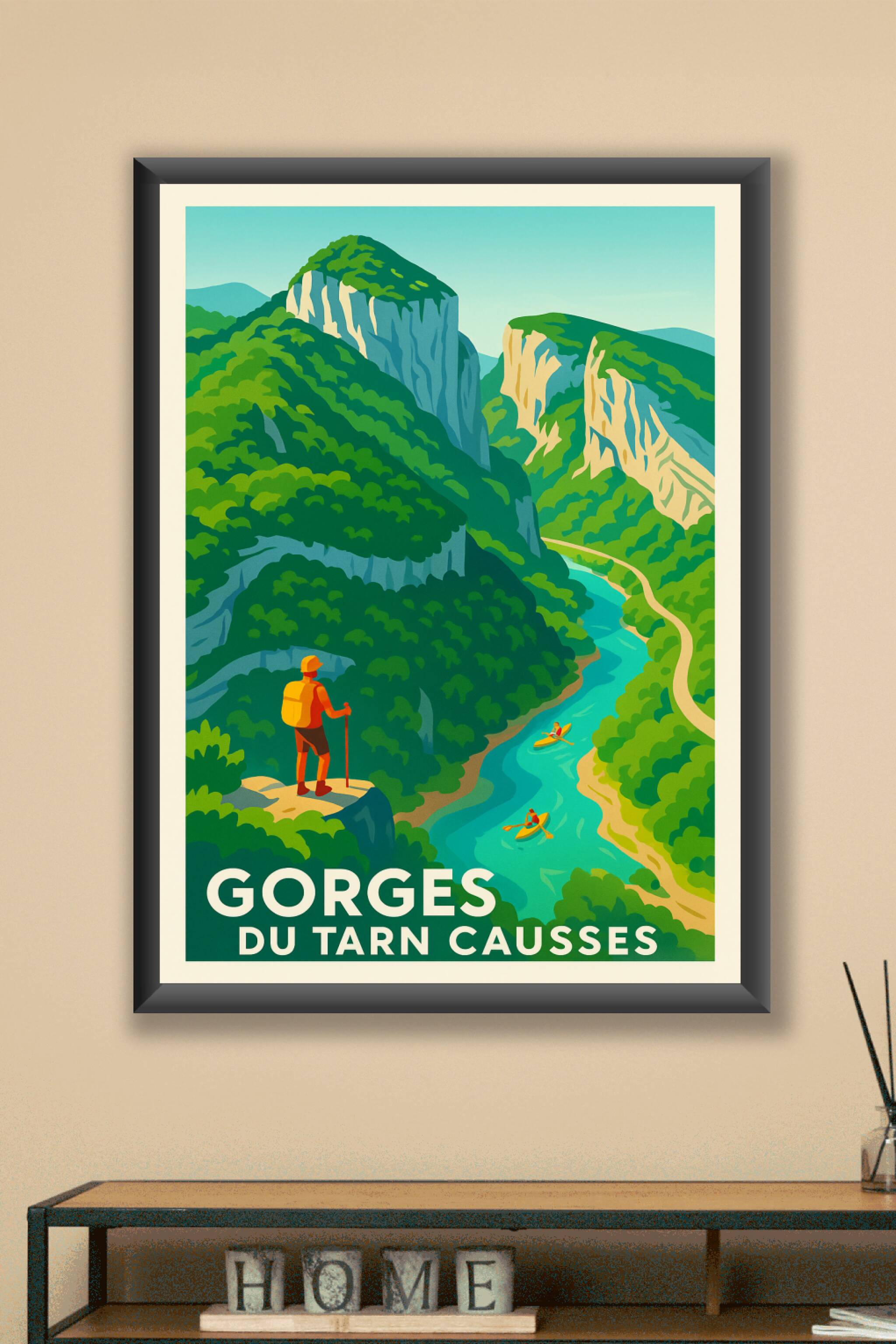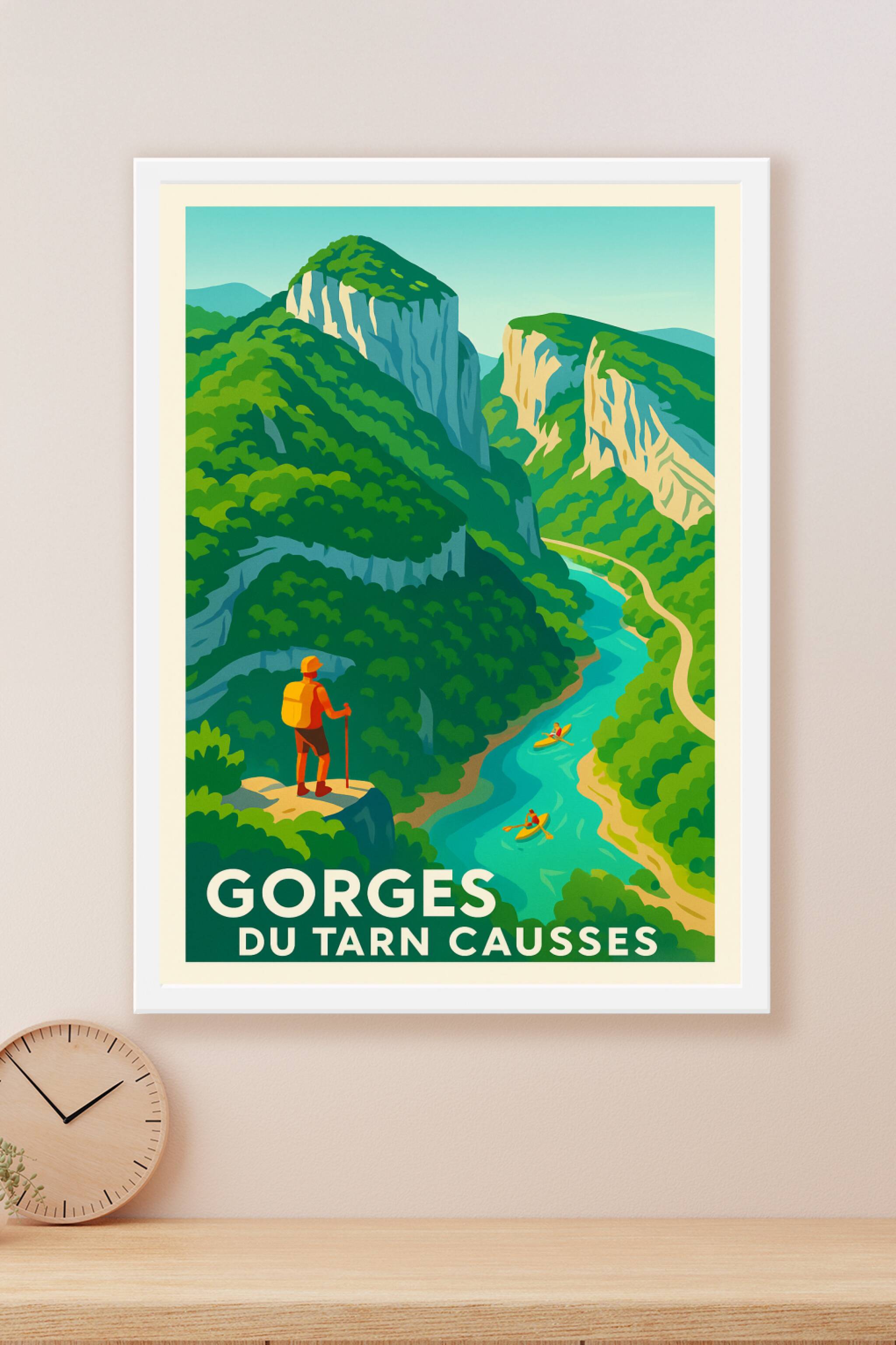 Découvrez la beauté sauvage et préservée des Gorges du Tarn Causses avec cette affiche illustrée qui capture l'essence d'une aventure en pleine nat...