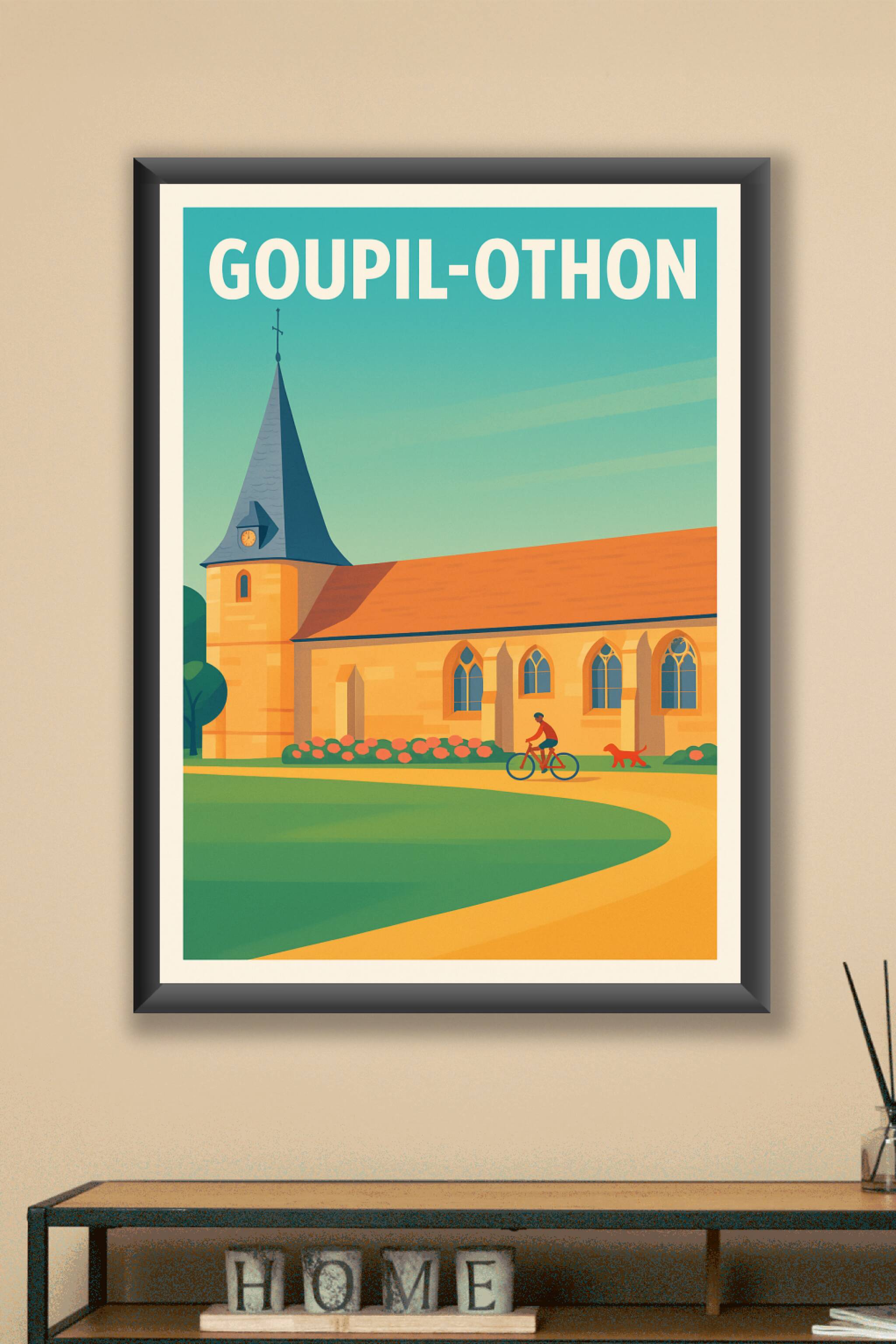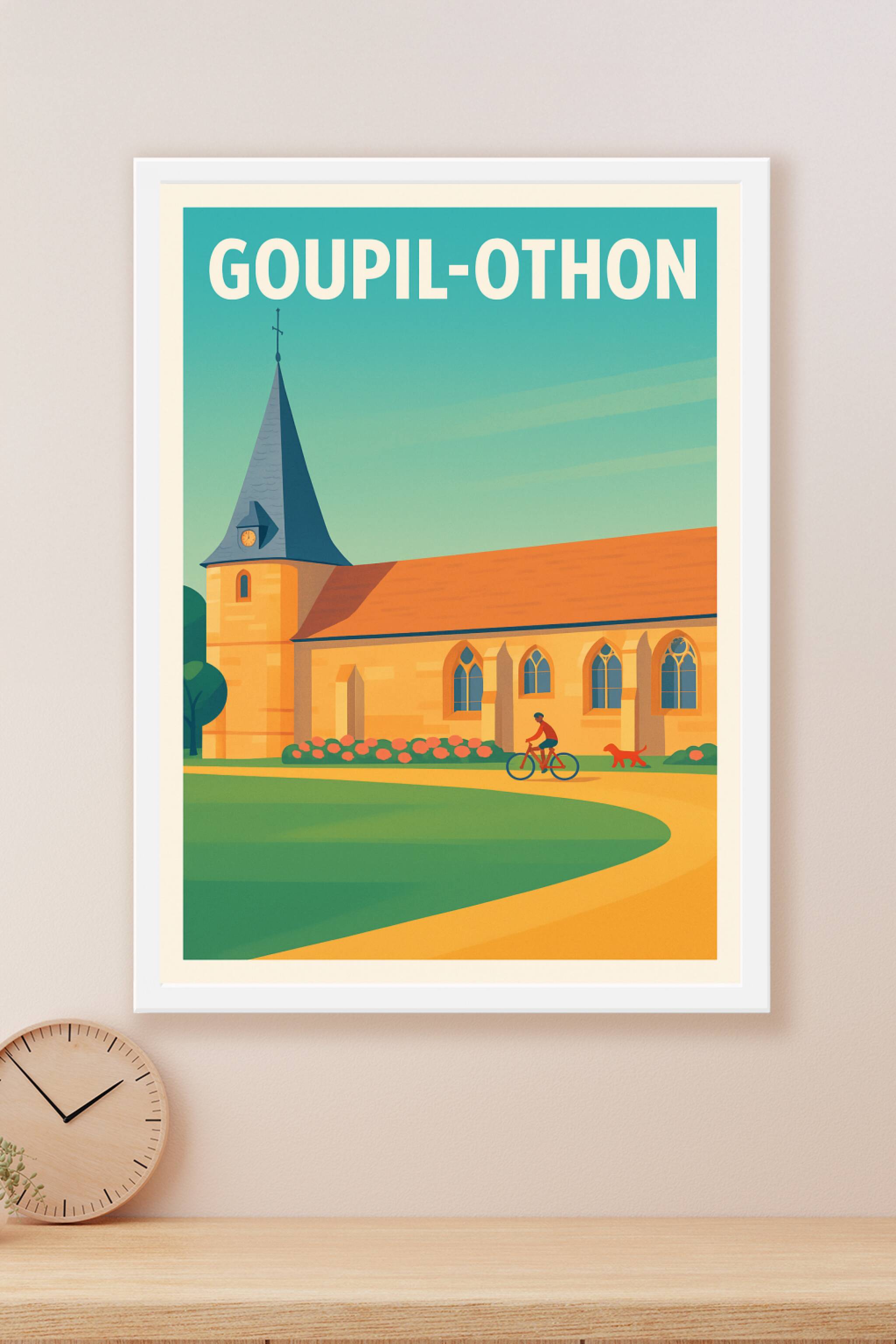 Découvrez l'atmosphère paisible et champêtre de Goupil-Othon à travers cette affiche illustrée avec des couleurs douces et un style rétro. Représentant une scène tranquille devant l'église du village, ce poster évoque la sérénité et l'authenticité de la vie à la campagne. Disponible en tirage "Fine Art" sur papier 305g coton, cette affiche offre une qualité d'impression exceptionnelle et des couleurs vibrantes qui dureront dans le temps. Choisissez votre format préféré parmi les dimensions A1 à A4, avec ou sans cadre, pour apporter une touche chaleureuse et élégante à votre décoration intérieure ou offrir un souvenir unique de cette charmante commune.