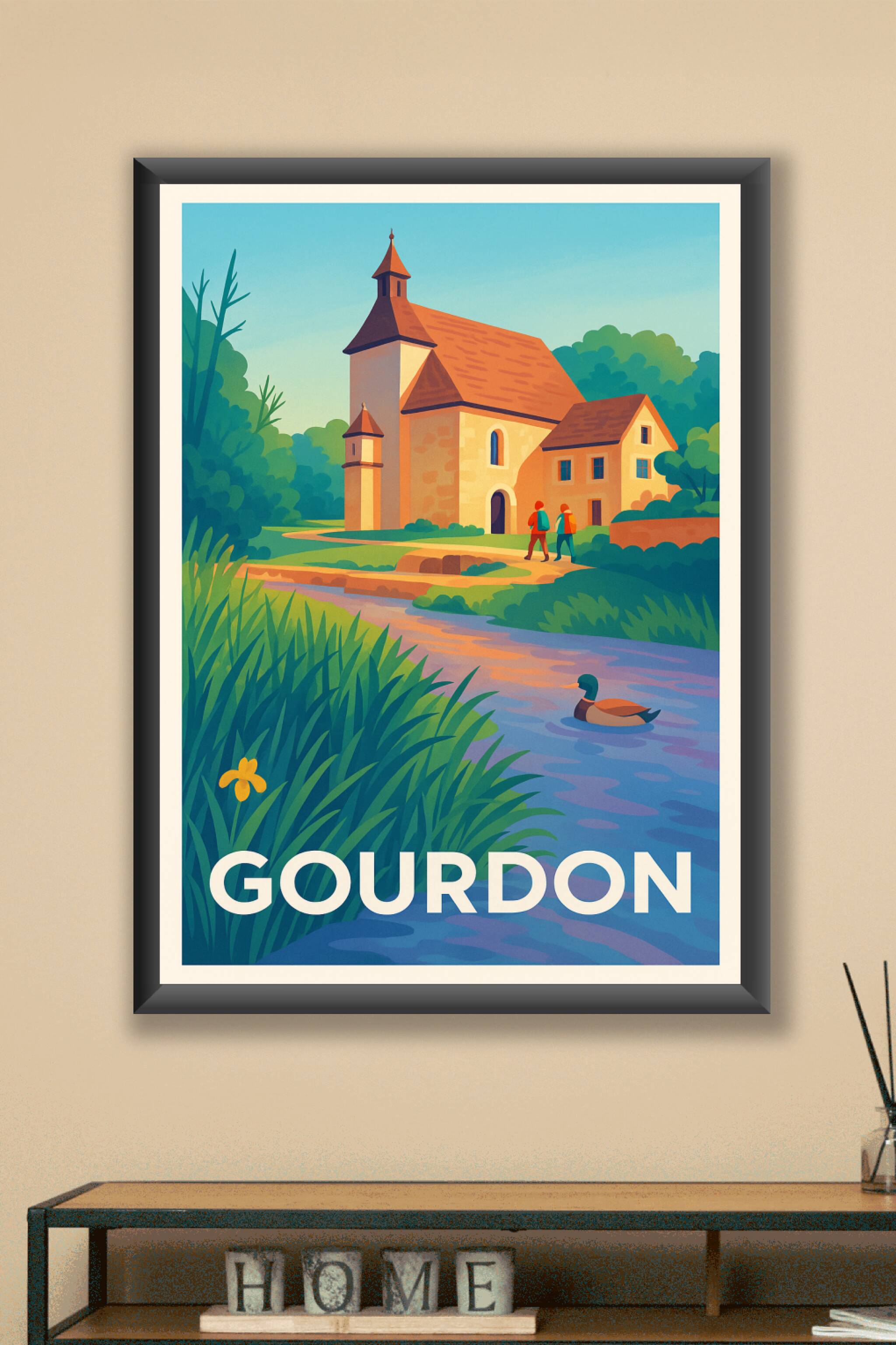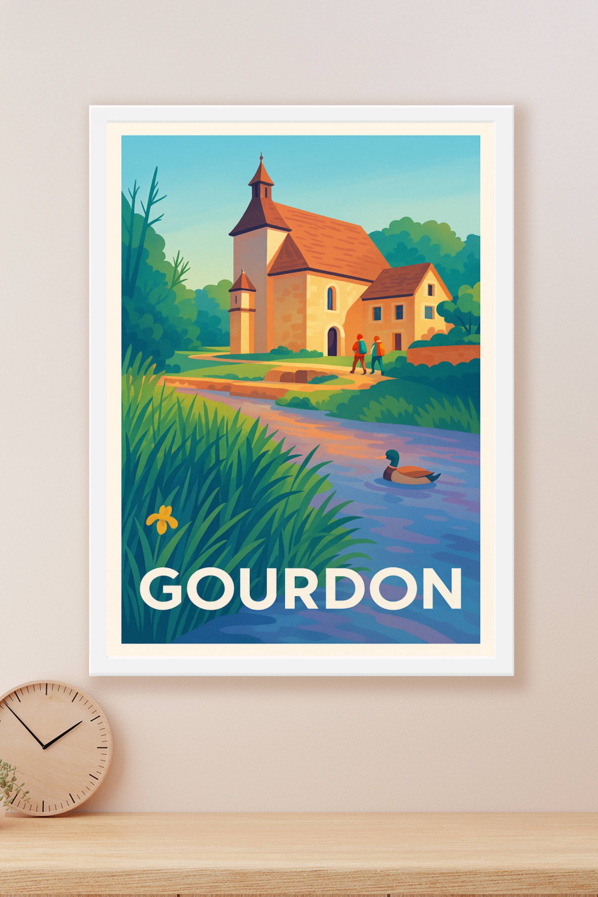 Découvrez la sérénité de Gourdon à travers cette affiche illustrée au charme champêtre, mettant en scène ses bâtisses traditionnelles au bord de l'...