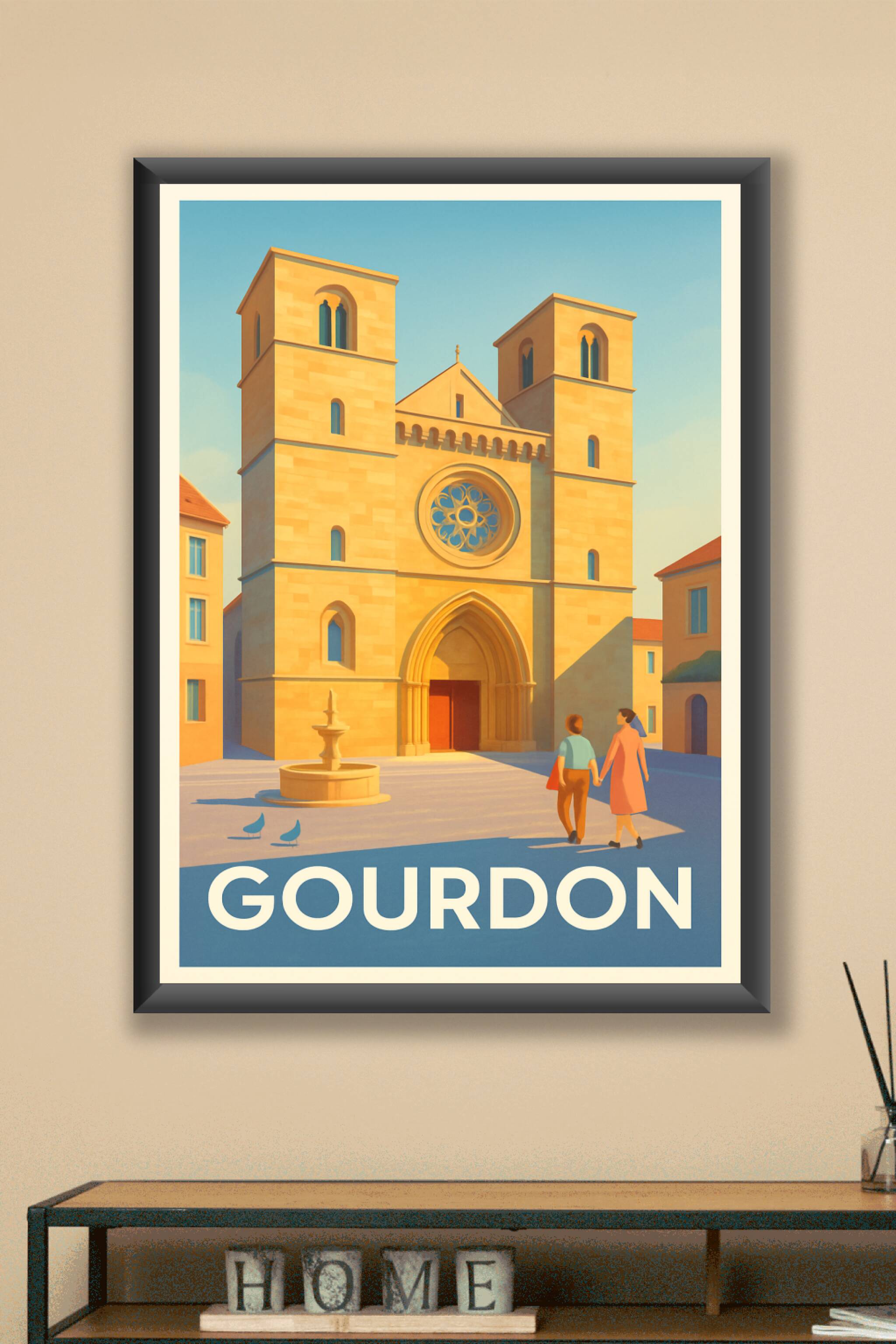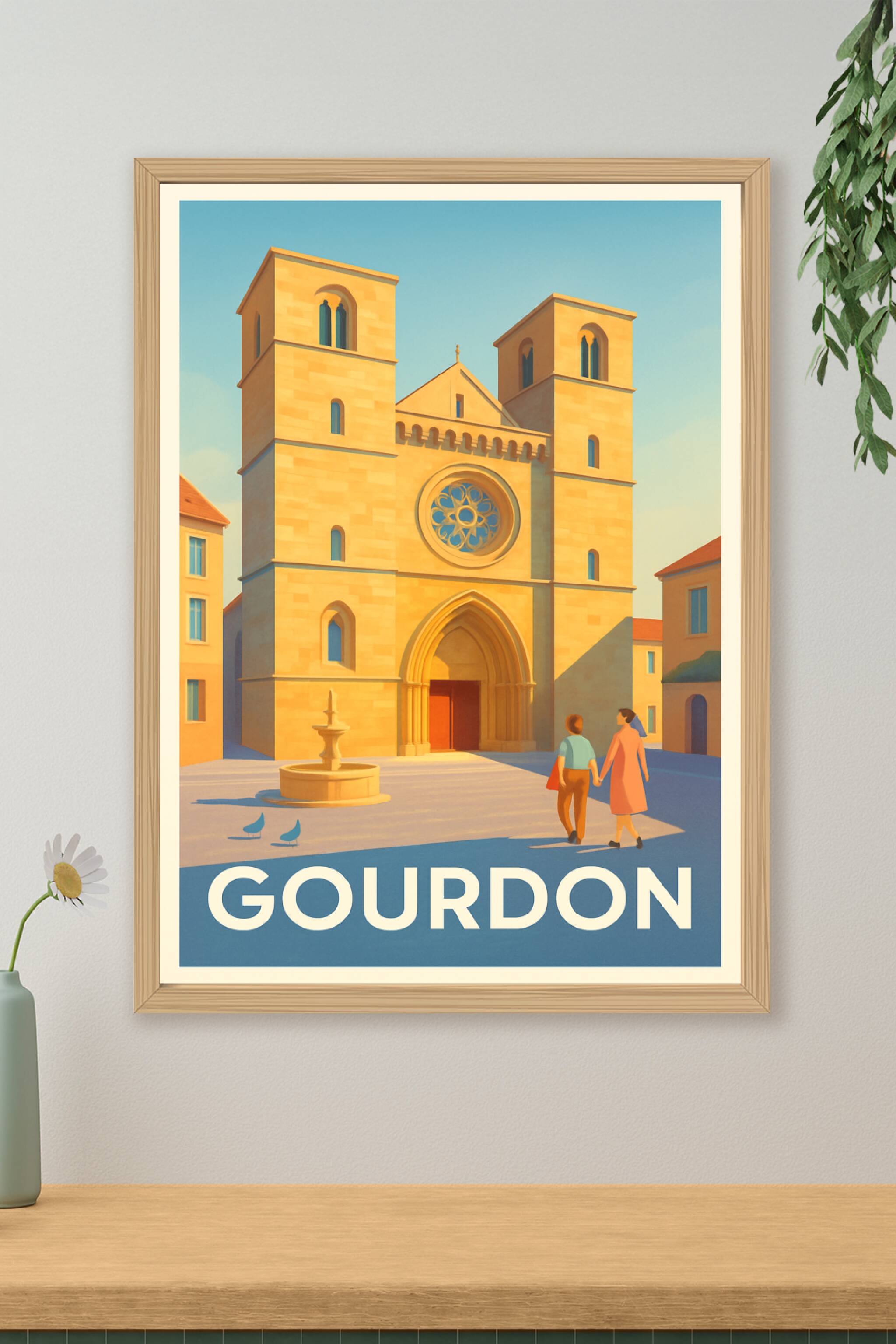 Découvrez l'atmosphère paisible de Gourdon avec cette affiche illustrée mettant en avant l'emblématique église romane baignée de lumière dorée. Ce ...