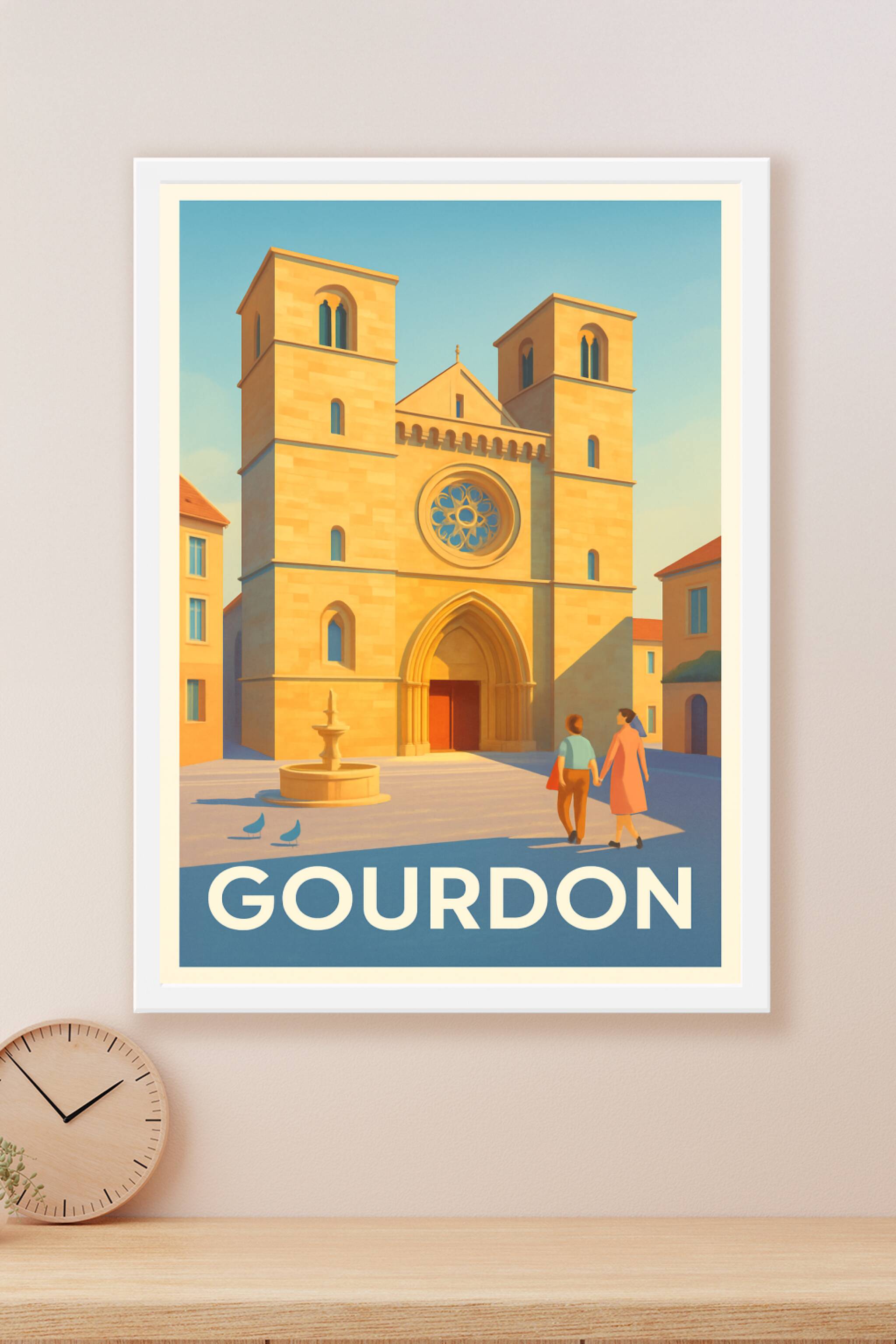 Découvrez l'atmosphère paisible de Gourdon avec cette affiche illustrée mettant en avant l'emblématique église romane baignée de lumière dorée. Ce poster capte la douceur d'un après-midi ensoleillé au cœur du village, avec ses ruelles calmes et ses habitants se promenant tranquillement. Imprimée en tirage "Fine Art" sur papier 305g coton, cette affiche offre une qualité exceptionnelle et des détails précis qui sublimeront votre décoration intérieure. Disponible en formats A1 à A4, avec ou sans cadre, cette reproduction haut de gamme est idéale pour apporter une touche de charme provençal à votre maison ou pour offrir un cadeau raffiné aux amoureux de la région.