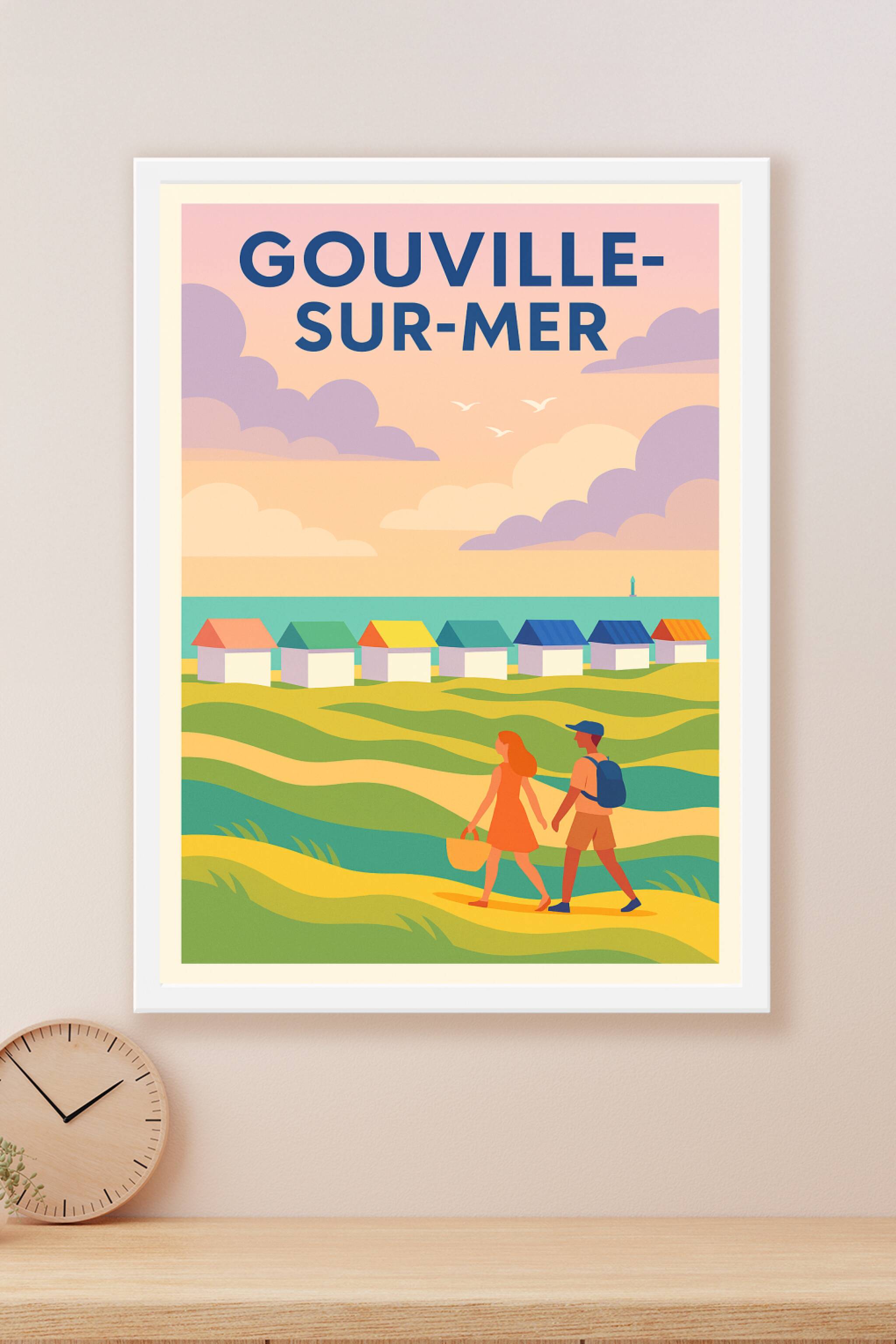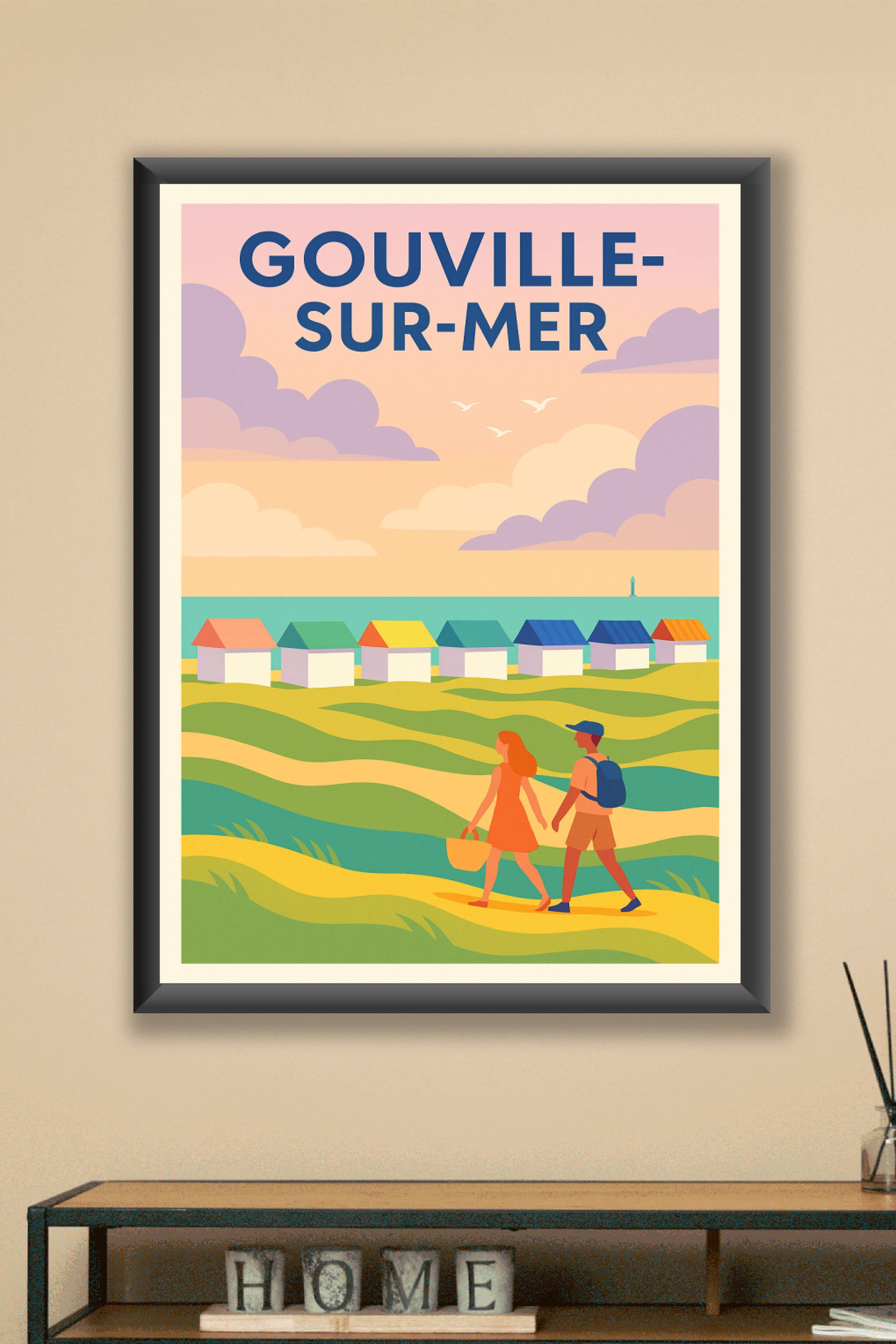 Découvrez la douceur et le charme balnéaire de Gouville-sur-Mer avec cette affiche illustrée aux couleurs pastel et au style rétro. Vous y apercevrez un couple se promenant sur les dunes ondulantes, face à la mer et aux cabines de plage multicolores qui font tout le caractère de cette station normande.Ce poster est un tirage "Fine Art" d'exception imprimé sur un papier 305g coton pour une qualité d'image et un rendu des couleurs remarquables. Disponible en formats A1 à A4, avec ou sans cadre, il s’adapte à tous les intérieurs et apporte une touche de vacances intemporelle à votre décoration.Offrez-vous ou offrez un souvenir élégant et durable, 100% fabriqué en France, idéal pour les amoureux des paysages marins et du patrimoine côtier normand.