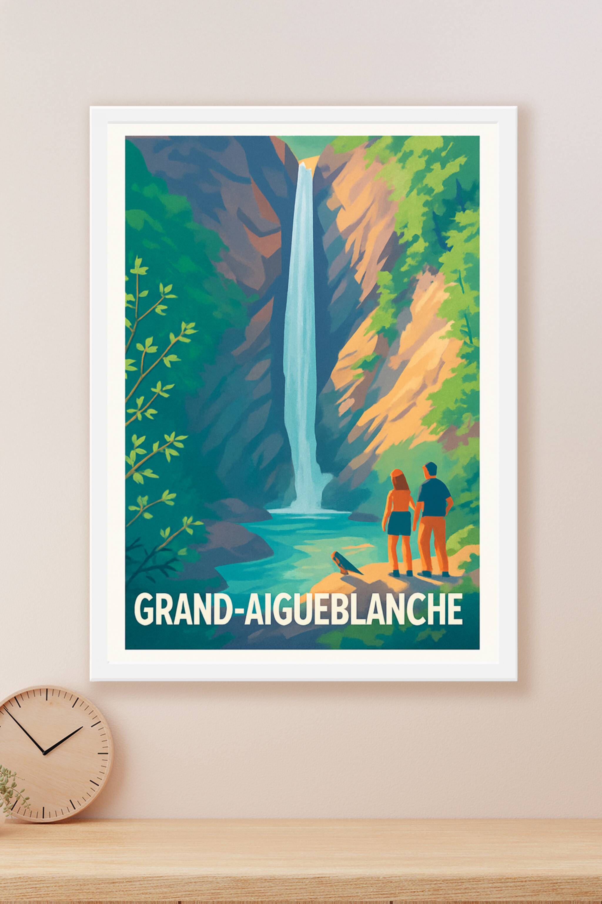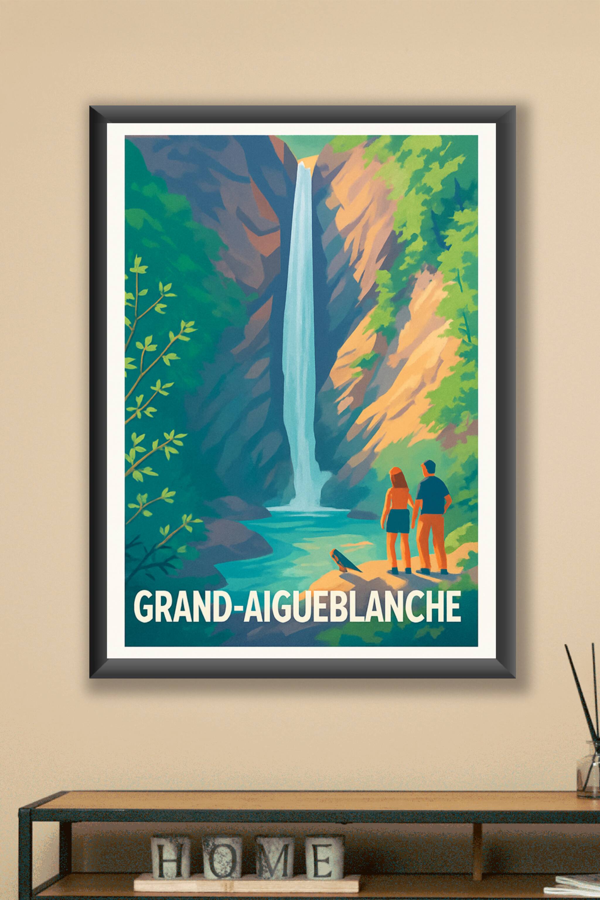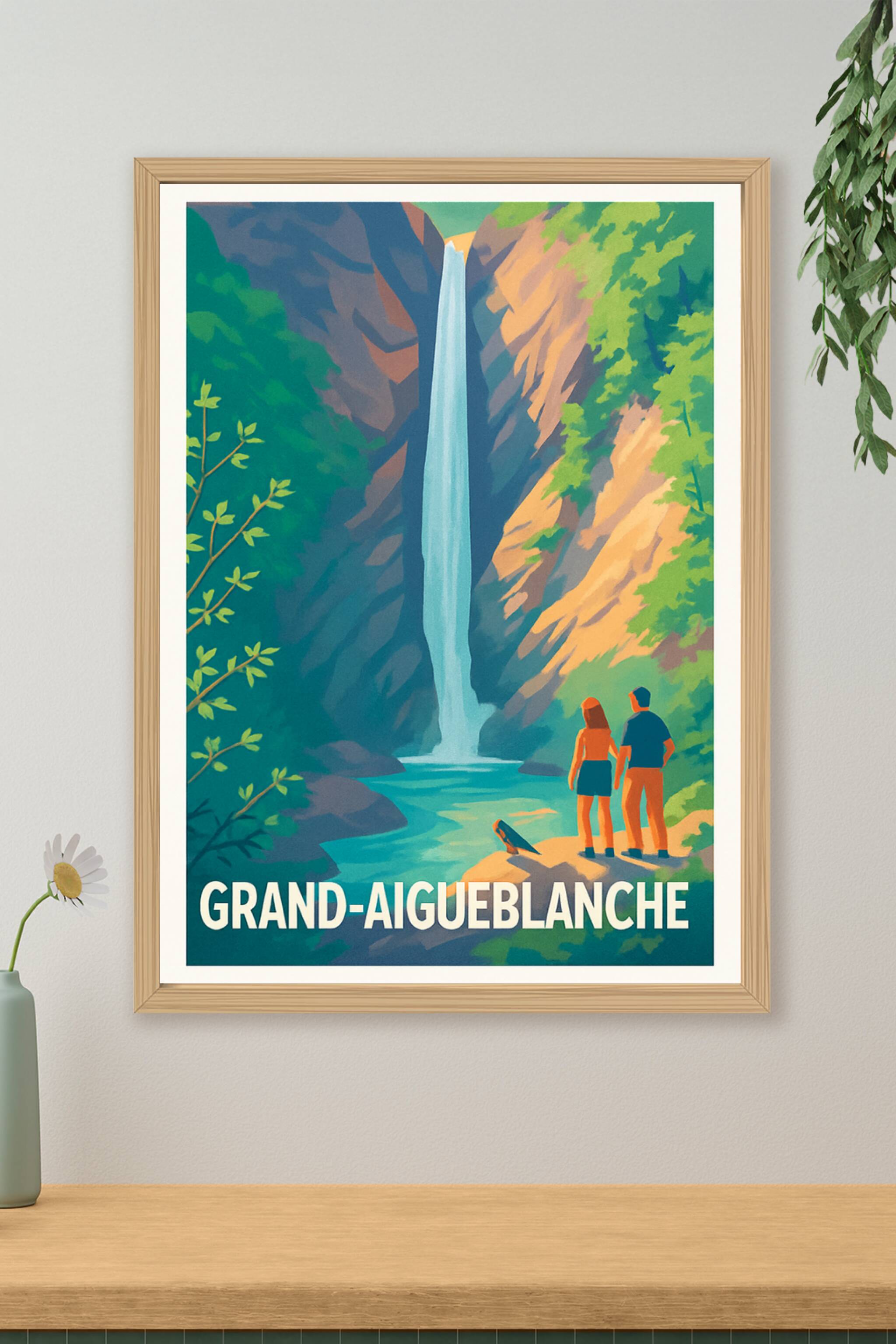 Découvrez la majesté naturelle de Grand-Aigueblanche avec cette affiche illustrée représentant une cascade spectaculaire encadrée par une végétatio...