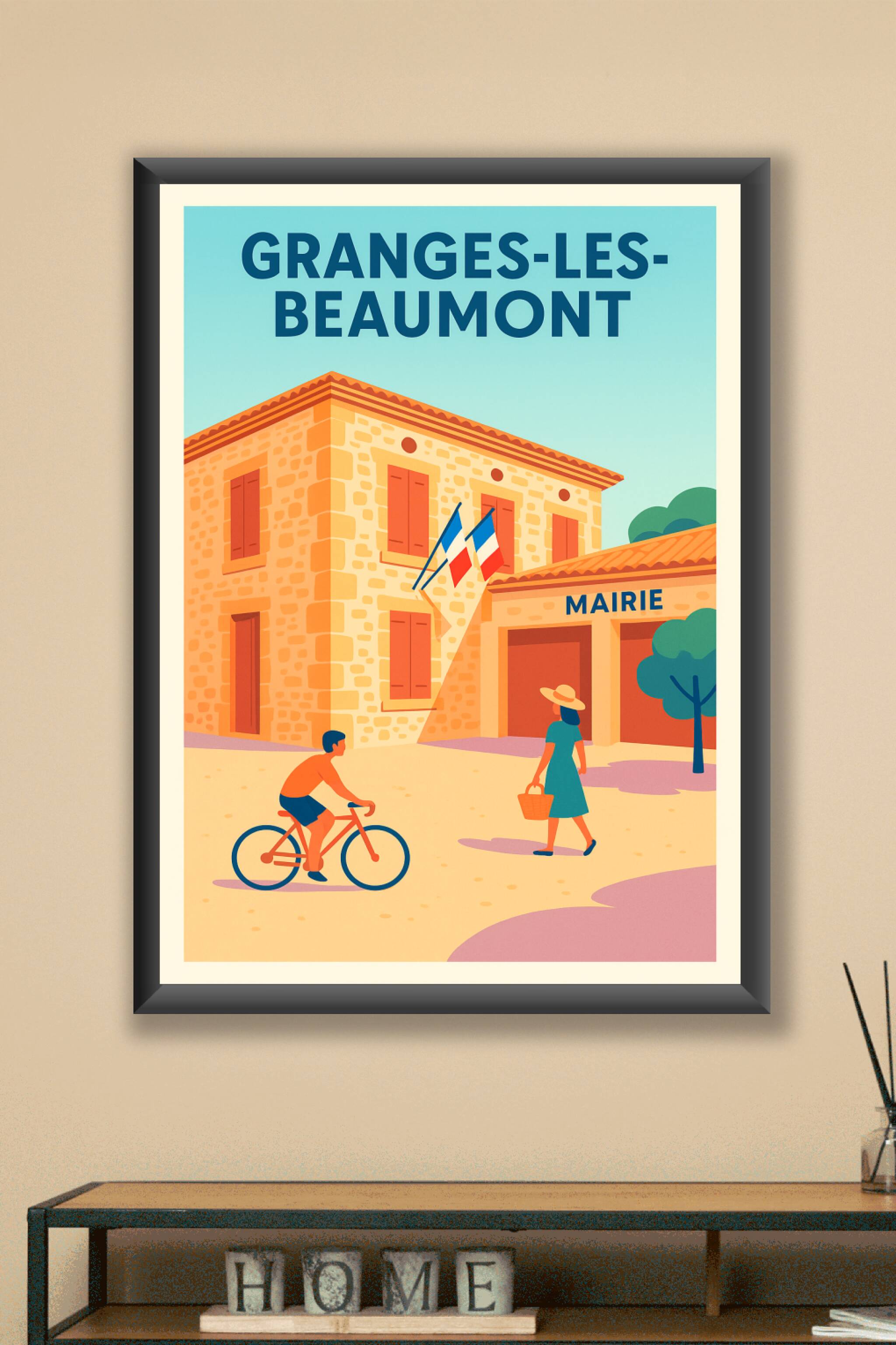 Découvrez cette affiche illustrée qui met en scène la mairie typique de Granges-les-Beaumont sous un ciel azuré, reflétant l'élégance simple et la ...