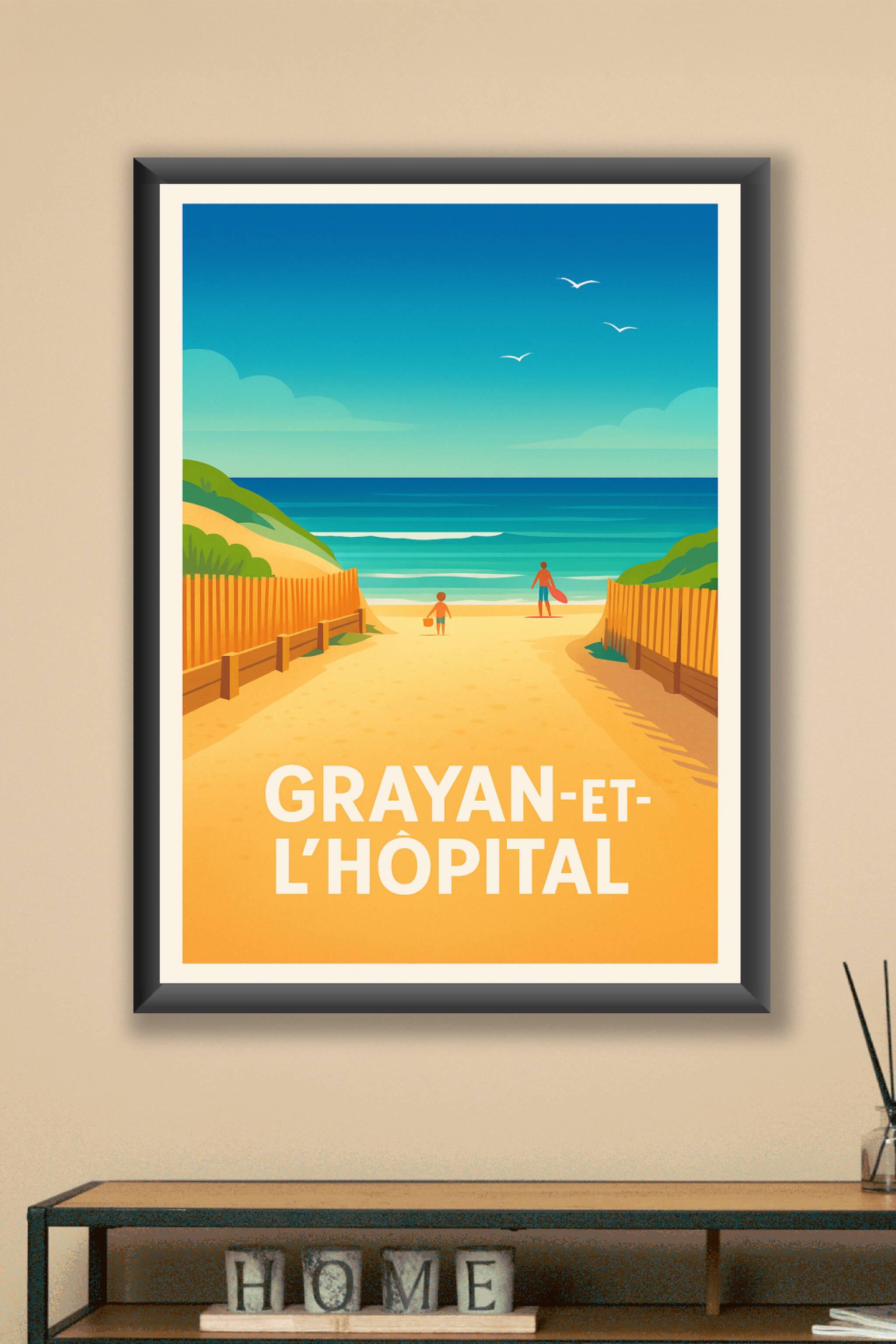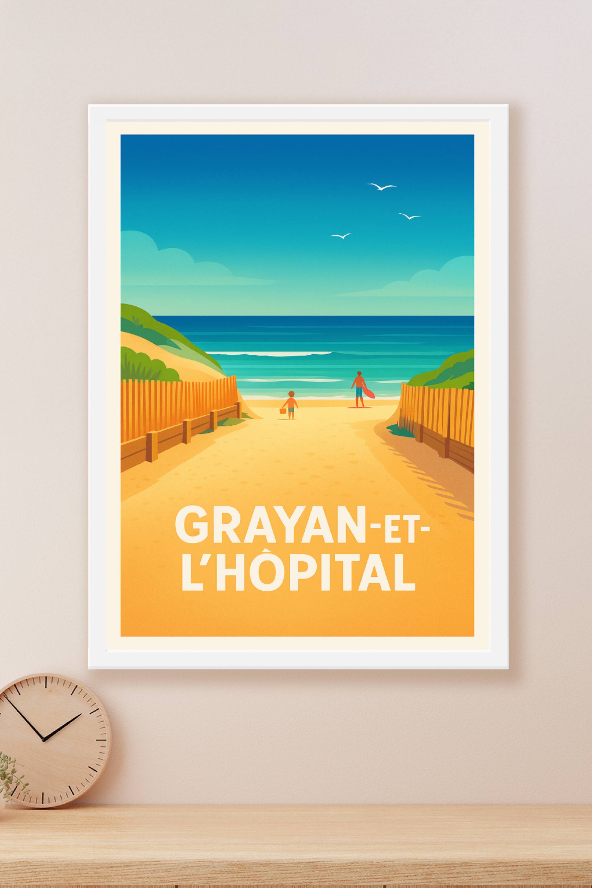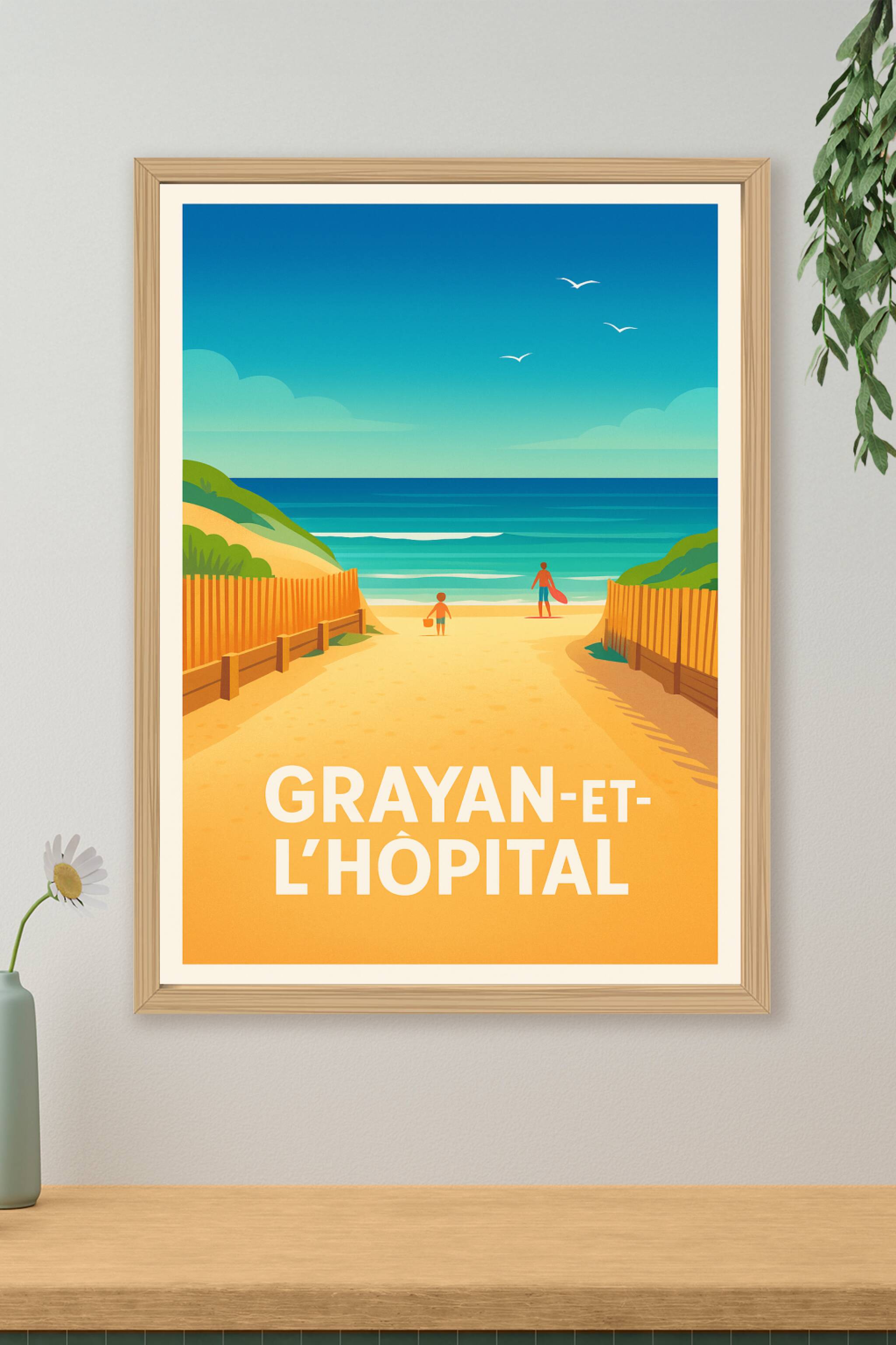 Découvrez le charme apaisant de Grayan-et-l'Hôpital avec cette affiche illustrée qui capture à merveille l'accès pittoresque à la plage, bordée de ...