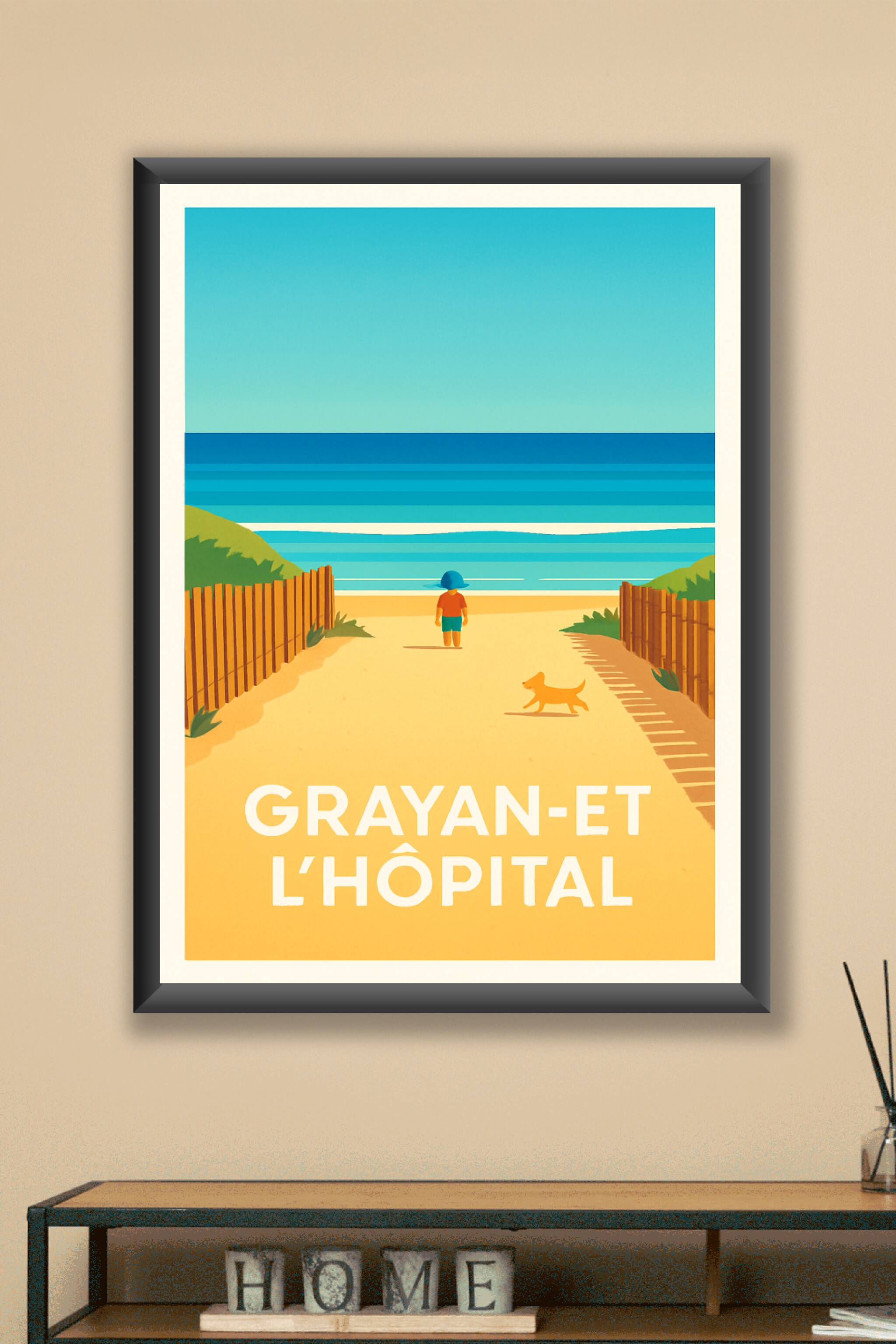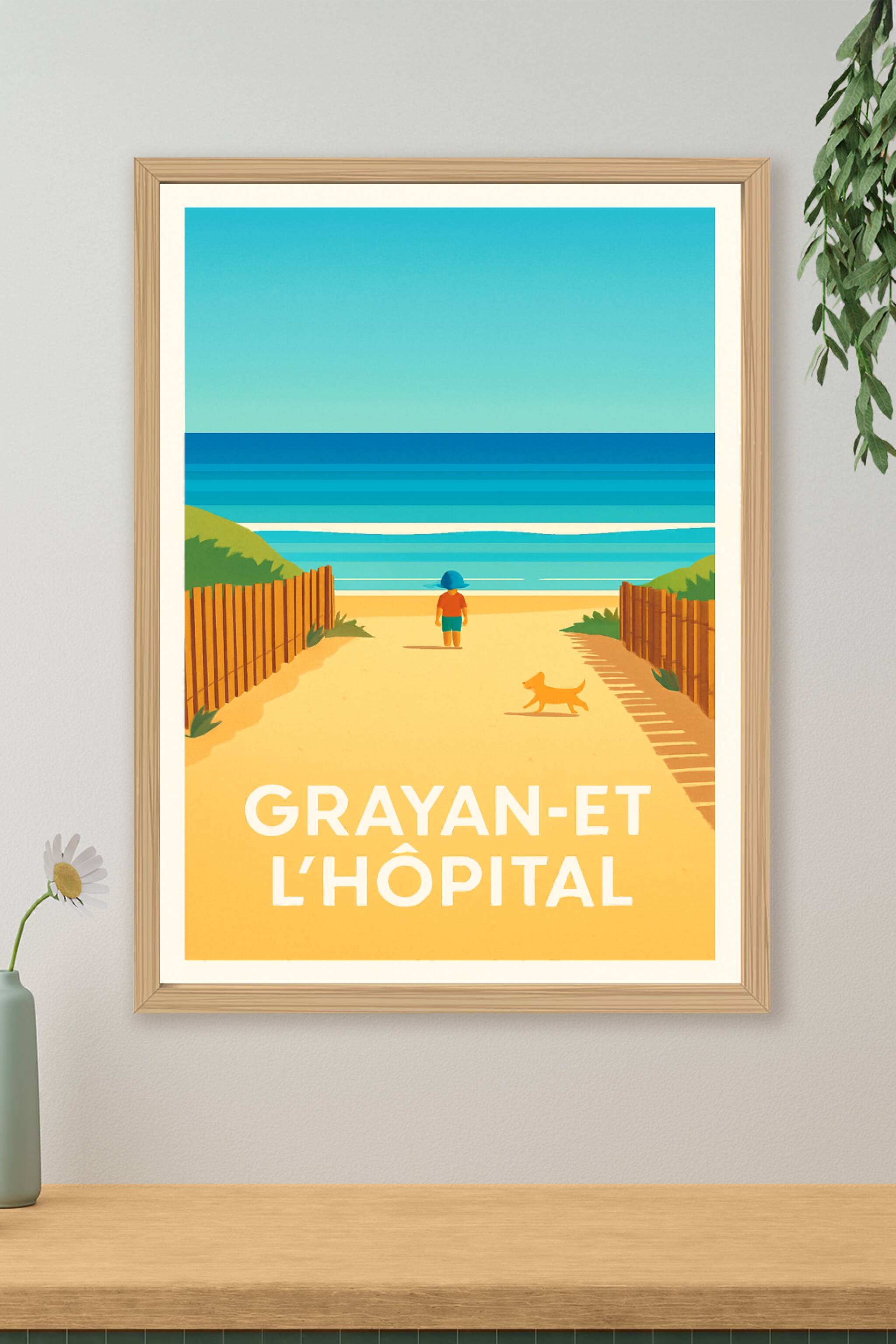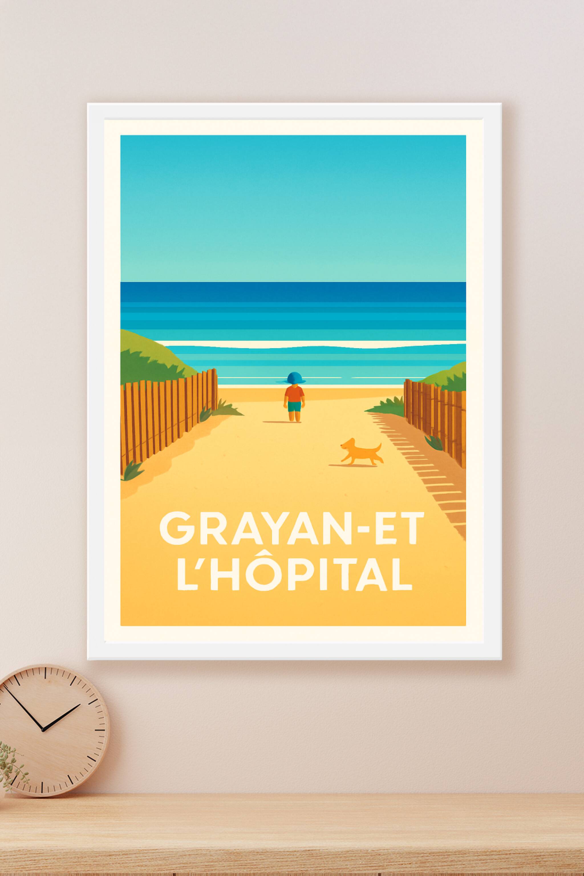 Découvrez la douceur de vivre de Grayan-et-l'Hôpital avec cette affiche au graphisme épuré et aux couleurs vibrantes. Ce poster illustre avec tendr...