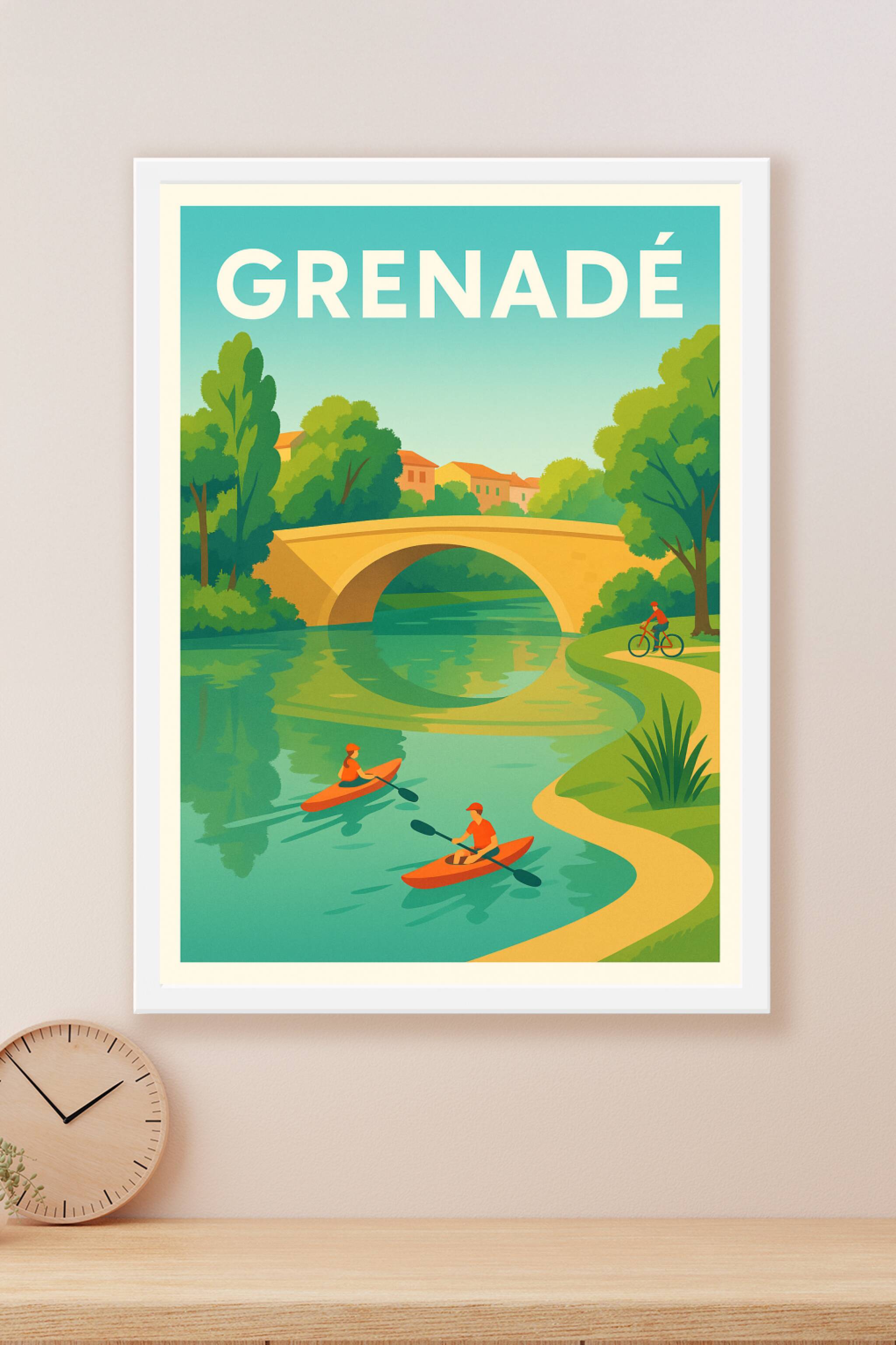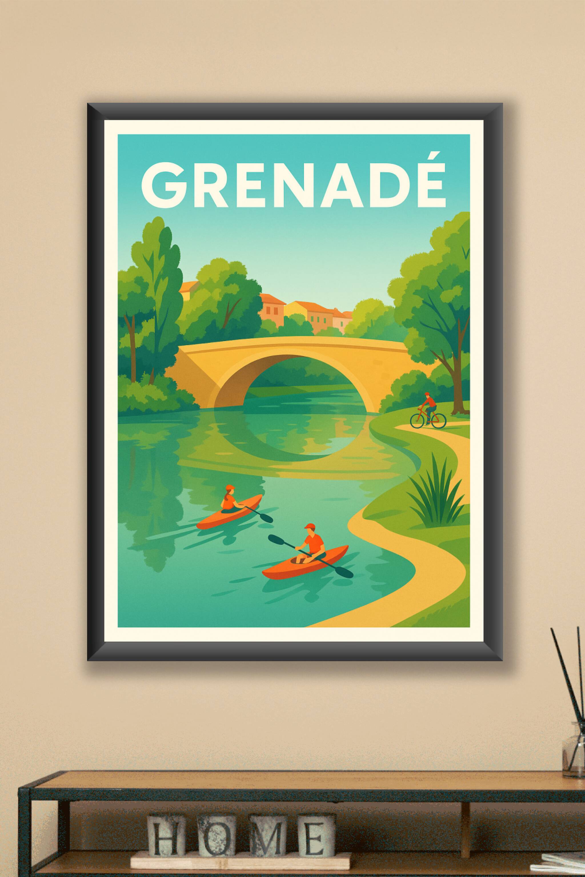 Découvrez l'affiche Grenadé, une invitation à la détente au cœur d'un paysage verdoyant où un pont chargé d'histoire surplombe une rivière paisible. Deux kayakistes glissent doucement sur l'eau tandis qu'un cycliste profite d'une balade en pleine nature. Ce poster au style vintage moderne capture la sérénité et la beauté d'un coin de campagne apaisant, parfait pour apporter une touche de calme à votre décoration intérieure. Imprimée en tirage "Fine Art" sur papier 305g coton de qualité premium, cette affiche bénéficie d'une résolution exceptionnelle et d'une richesse des couleurs remarquables. Disponible en formats A1 à A4, avec ou sans cadre, elle s'adapte parfaitement à tous les espaces, que ce soit au salon, bureau ou chambre. Offrez-vous ce poster unique pour revivre la douceur de Grenadé ou faites-en un cadeau élégant pour les amateurs de paysages inspirants.