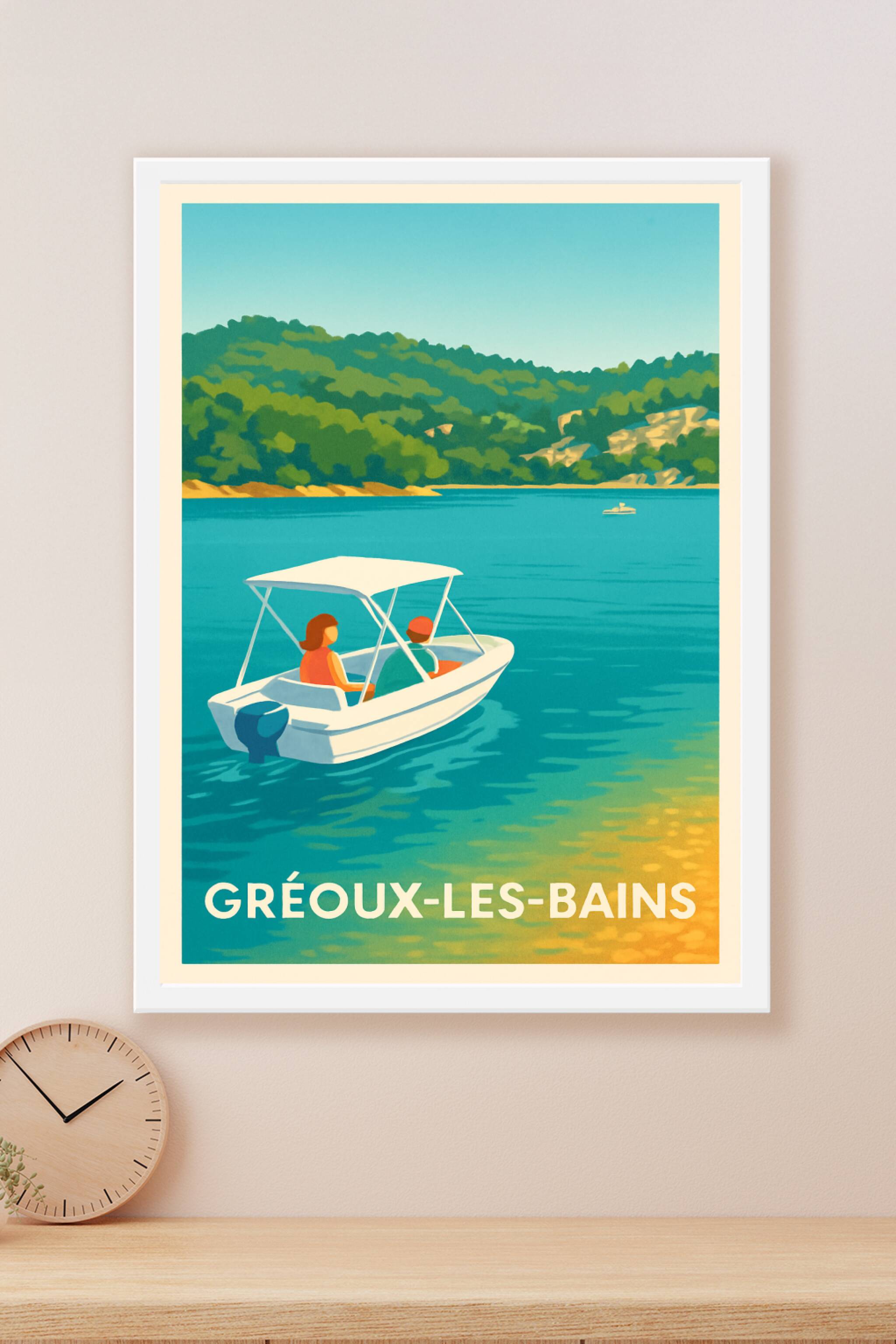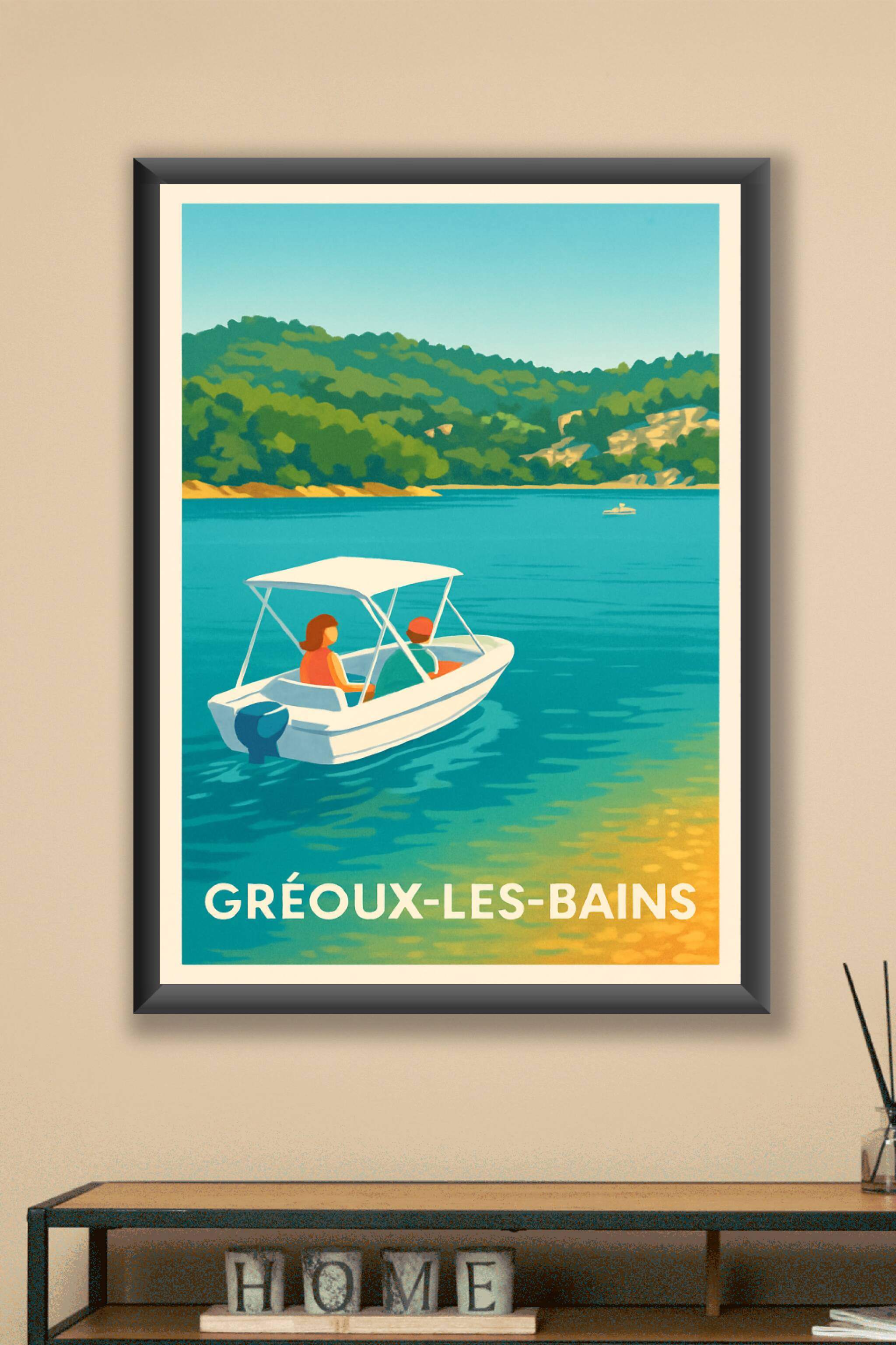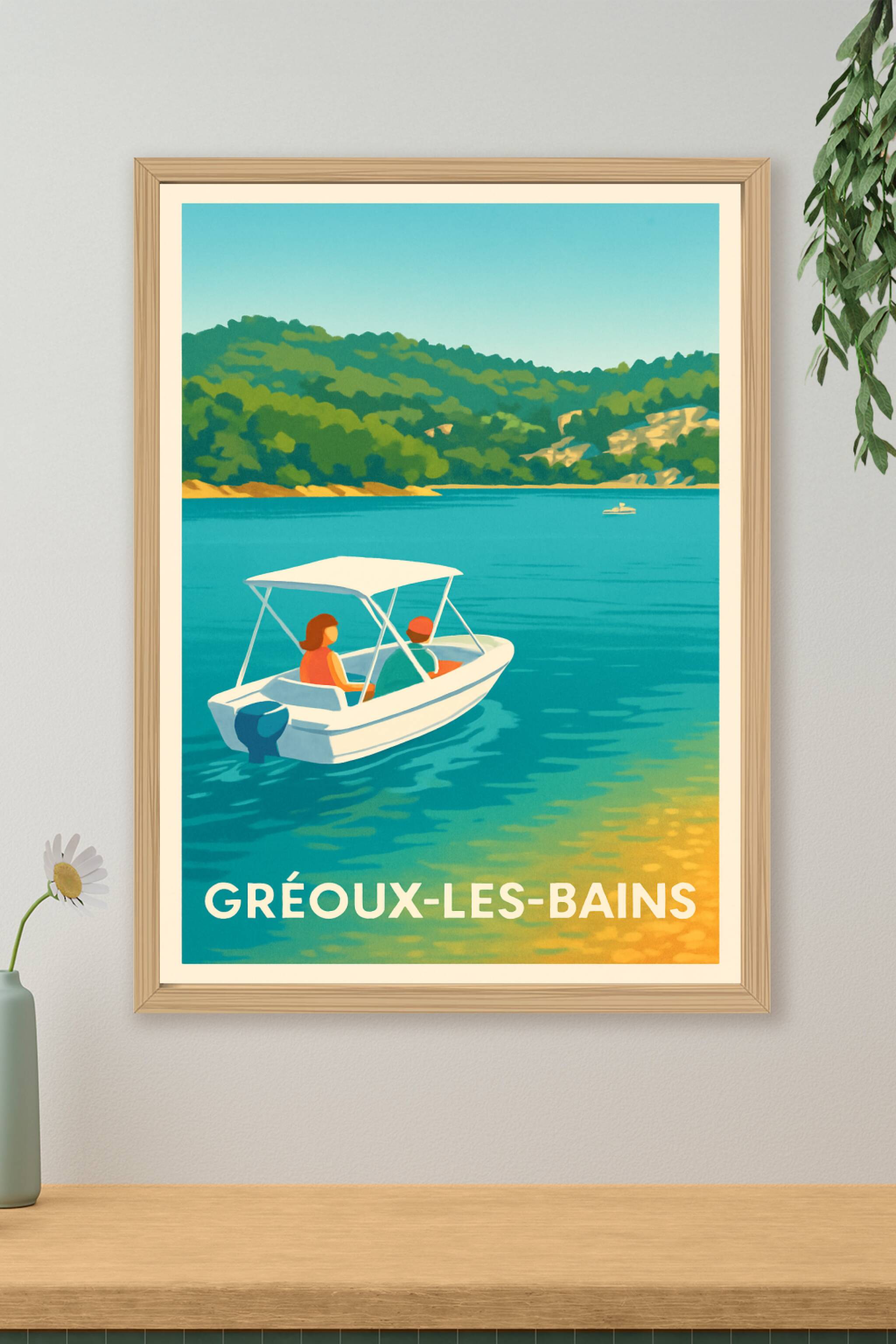 Découvrez la sérénité de Gréoux-les-Bains avec cette affiche illustrée, représentant un moment tranquille sur un bateau au cœur d'un paysage azurée...