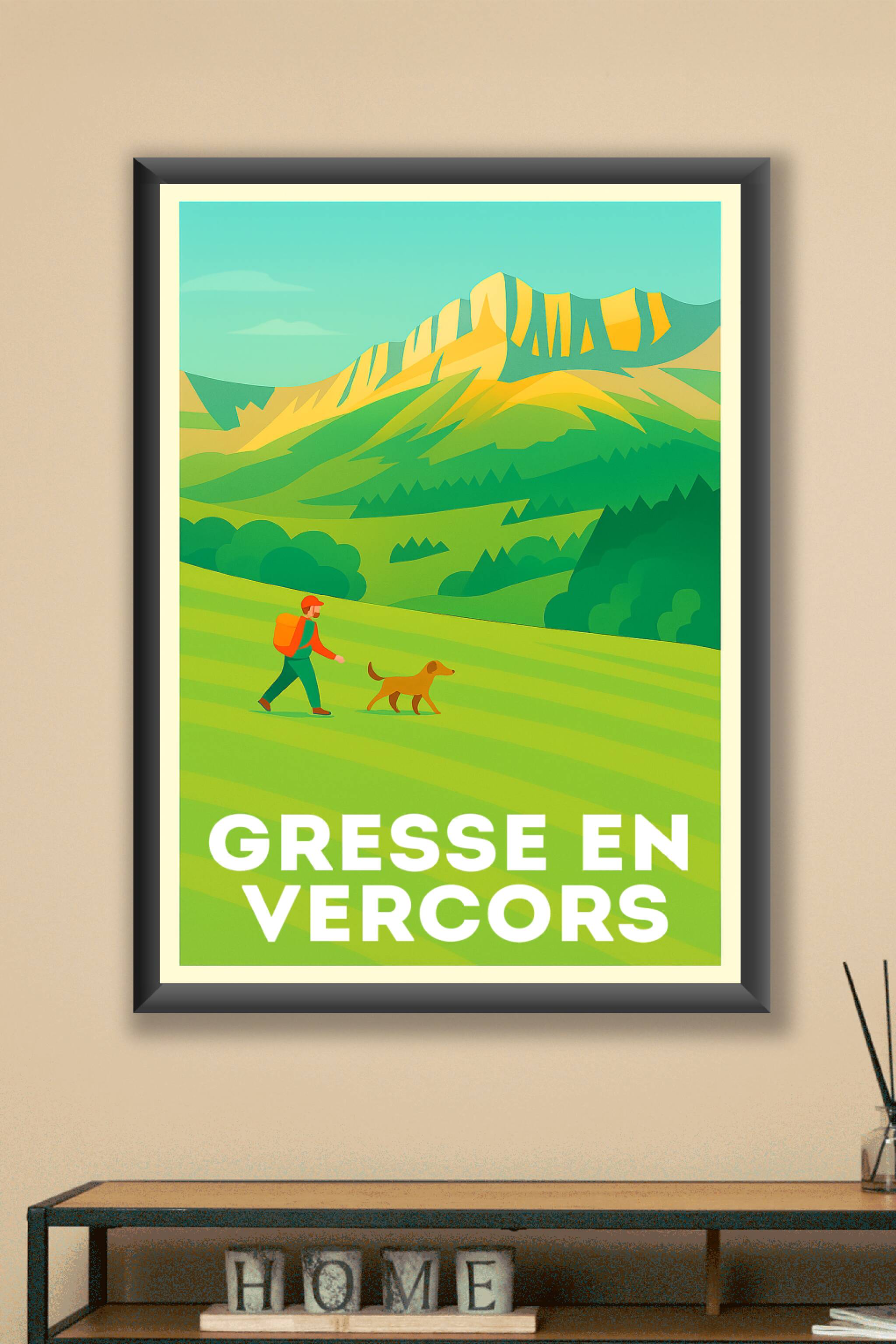 Découvrez l’univers paisible et authentique de Gresse en Vercors avec cette superbe affiche illustrée aux couleurs douces et naturelles. Ce poster met en avant les paysages majestueux de la montagne et la richesse de la nature environnante, illustrant parfaitement un moment d’évasion et de sérénité, accompagné d’un randonneur et de son chien. Disponible en tirage "Fine Art" sur papier 305g coton pour une qualité d’impression exceptionnelle, cette affiche est déclinée en formats A1 à A4 pour s’adapter à tous les espaces. Vous pouvez choisir ce poster avec ou sans cadre pour une décoration intérieure qui invite à la promenade et à la découverte. Apportez une touche de calme et de beauté alpine à votre intérieur grâce à une impression premium 100% fabriquée en France.