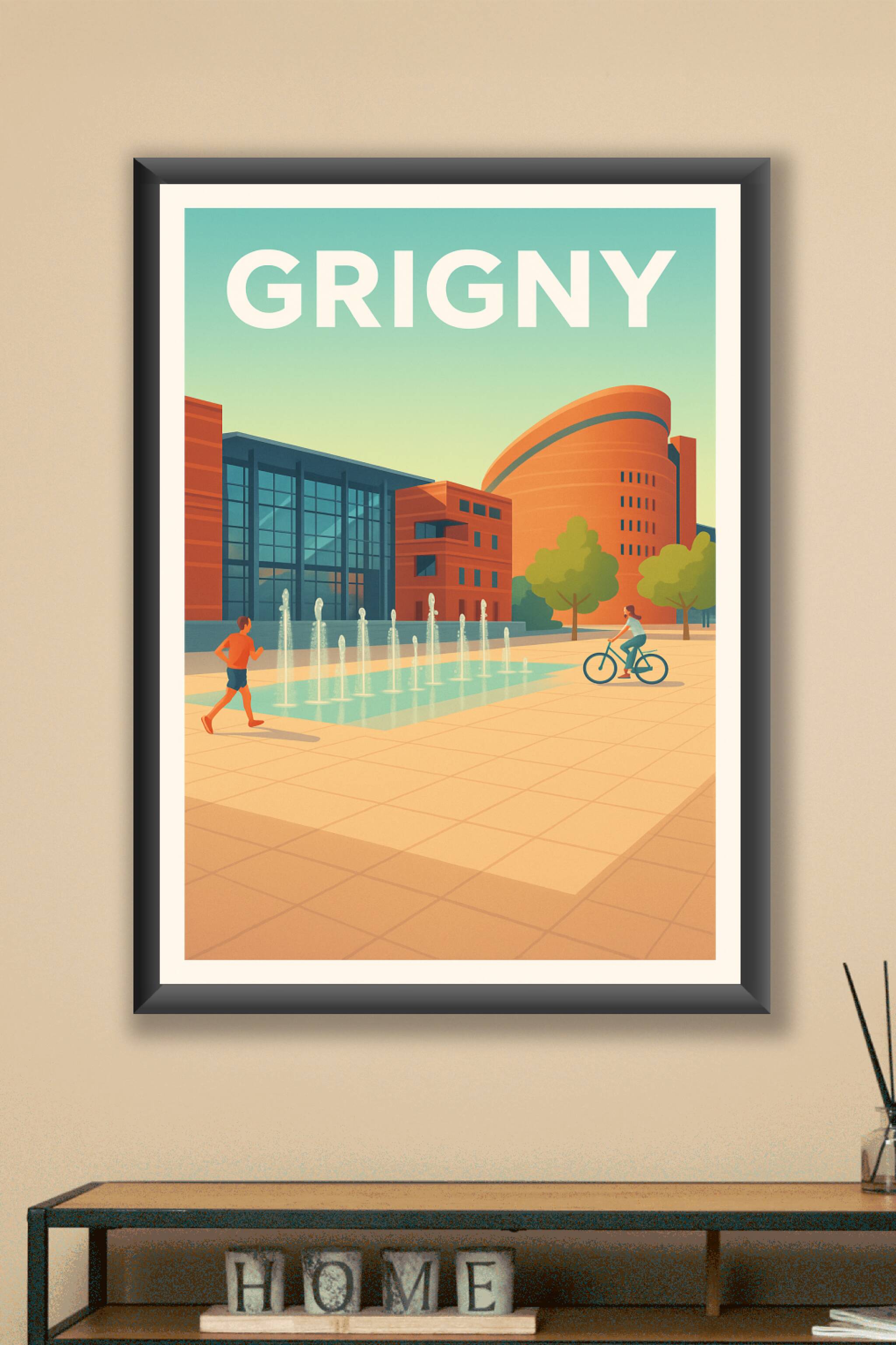 Découvrez l'esprit moderne et apaisant de Grigny avec cette affiche illustrée mettant en scène une scène urbaine où se mêlent architecture contempo...