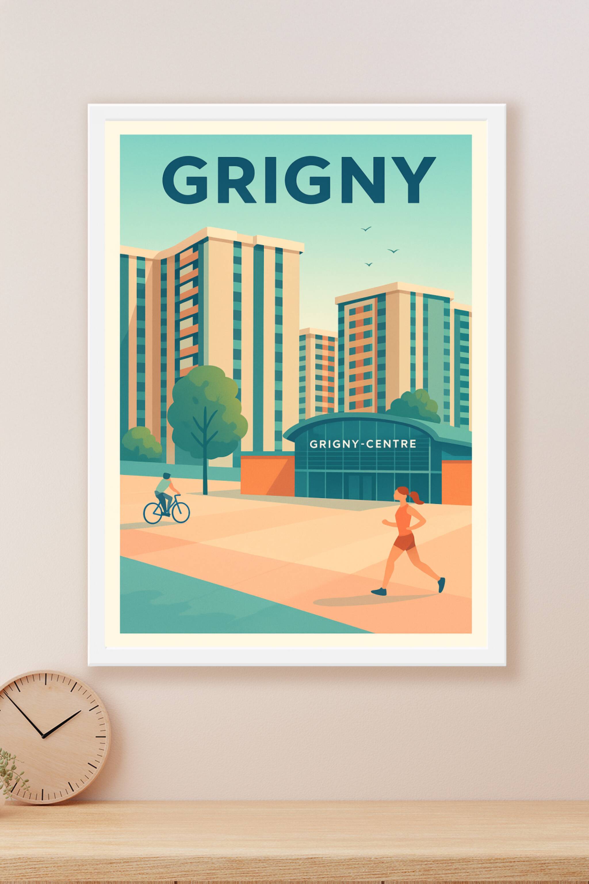 Découvrez l'ambiance dynamique de Grigny à travers cette affiche moderne illustrant son centre urbain et ses bâtiments emblématiques. Le poster cap...