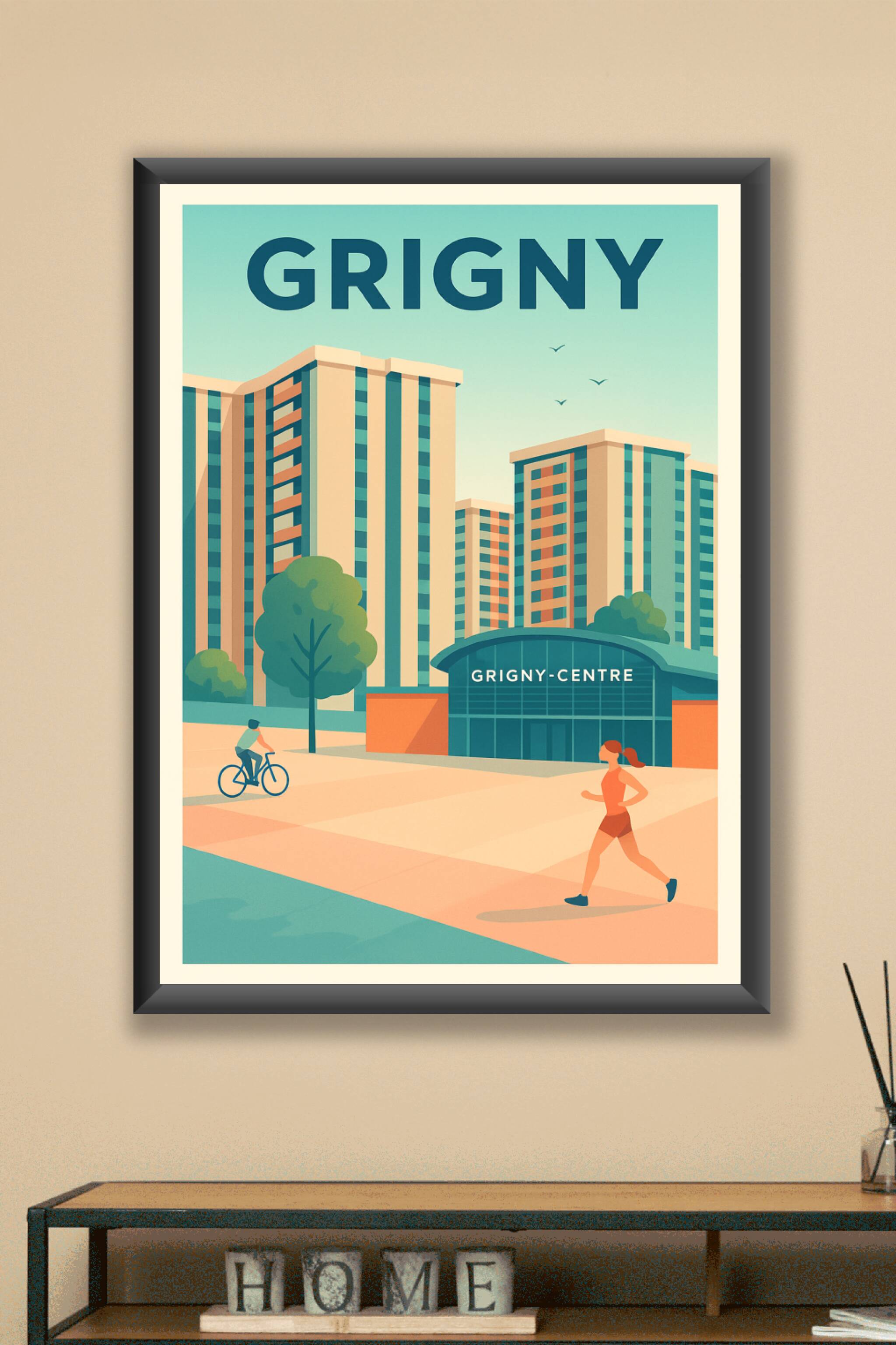 Découvrez l'ambiance dynamique de Grigny à travers cette affiche moderne illustrant son centre urbain et ses bâtiments emblématiques. Le poster capture une scène de vie active avec un coureur et un cycliste, symbolisant le dynamisme et la vitalité de la ville.Ce poster est disponible en tirage "Fine Art" imprimé sur papier 305g coton, garantissant une qualité d'impression exceptionnelle et des couleurs vibrantes. Disponible en formats A1 à A4, vous pouvez choisir votre taille parfaite avec ou sans cadre pour s'adapter à tous les styles d'intérieur.Apportez une touche contemporaine et urbaine à votre décoration avec cette affiche de Grigny, idéal pour les passionnés de ville et de design graphique, ou comme cadeau raffiné. Impression 100% française assurant une finition premium pour sublimer votre espace.