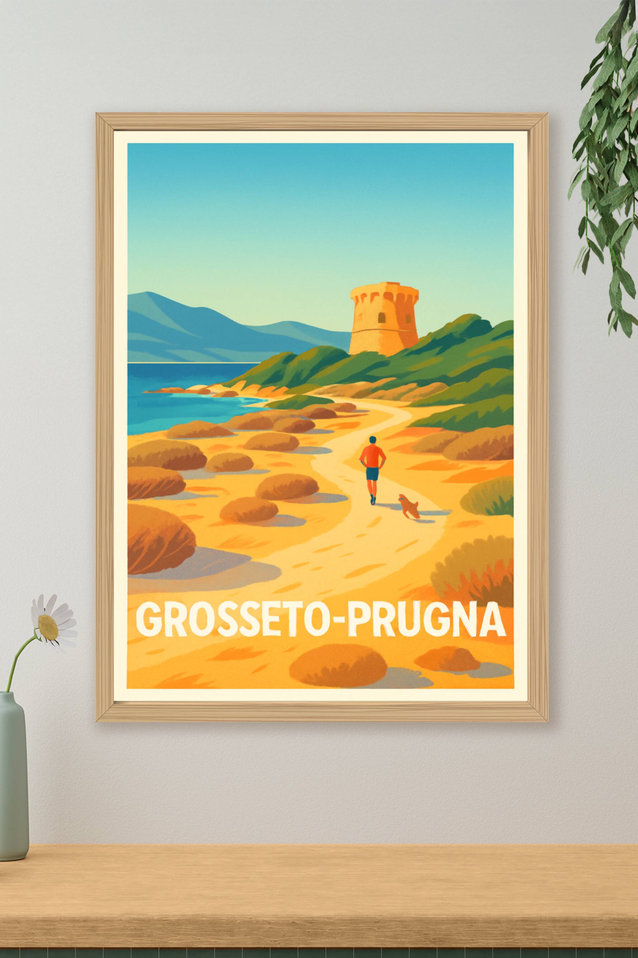 Découvrez la beauté ensoleillée de Grosseto-Prugna avec cette affiche illustrée qui capture une promenade paisible le long de la côte, entre dunes ...