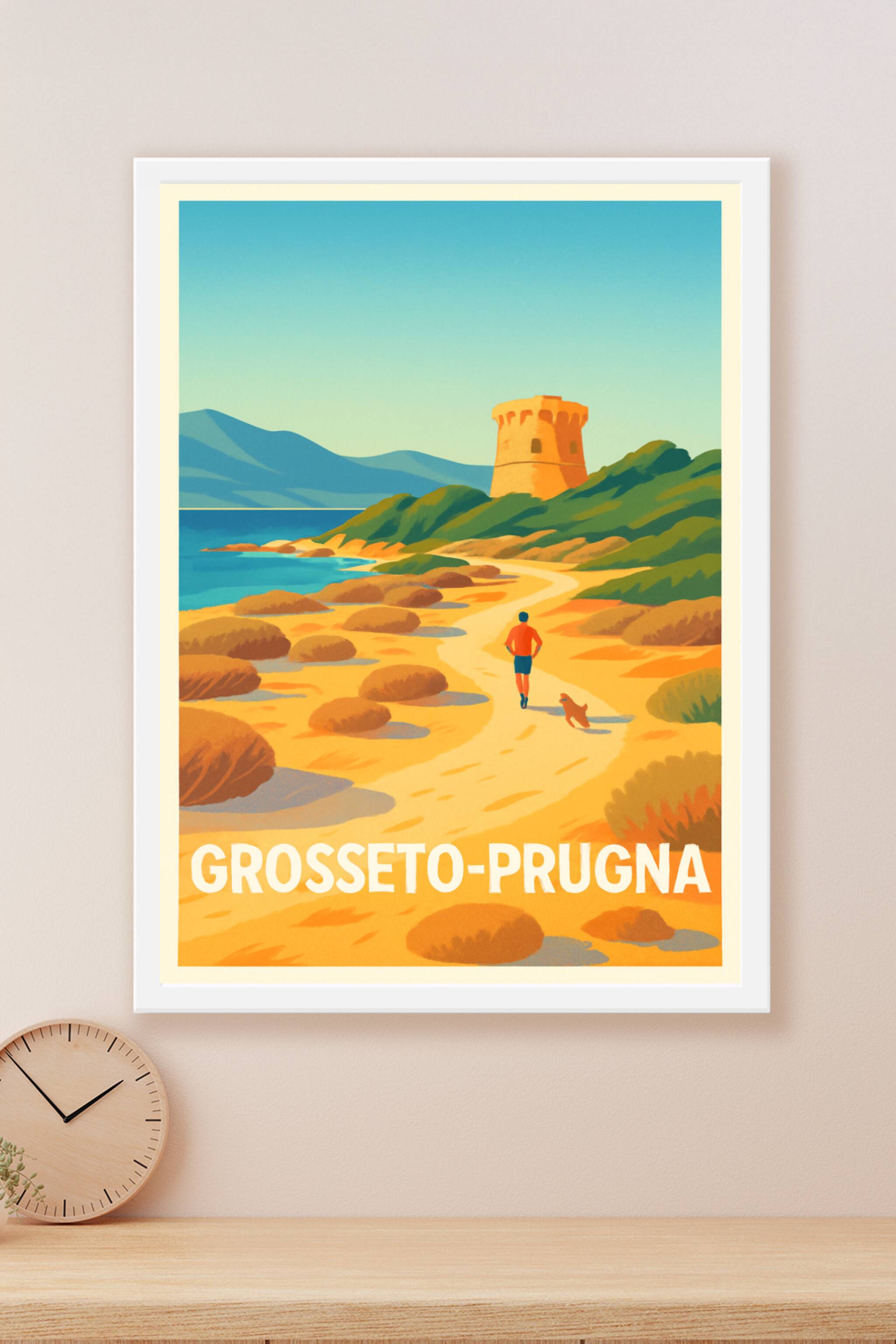 Découvrez la beauté ensoleillée de Grosseto-Prugna avec cette affiche illustrée qui capture une promenade paisible le long de la côte, entre dunes dorées et mer azur. Le poster met en scène un coureur et son chien, avec en toile de fond la tour emblématique, symbole du charme méditerranéen. Imprimée en tirage "Fine Art" sur papier 305g coton, cette affiche vous garantit une qualité d'impression supérieure et des couleurs vibrantes qui sublimeront votre intérieur. Disponible du format A1 à A4, avec ou sans cadre, ce poster s'adapte à toutes les ambiances déco. Offrez-vous un morceau du littoral corse, à la fois poétique et chaleureux, idéal pour enrichir votre collection ou pour un cadeau original.