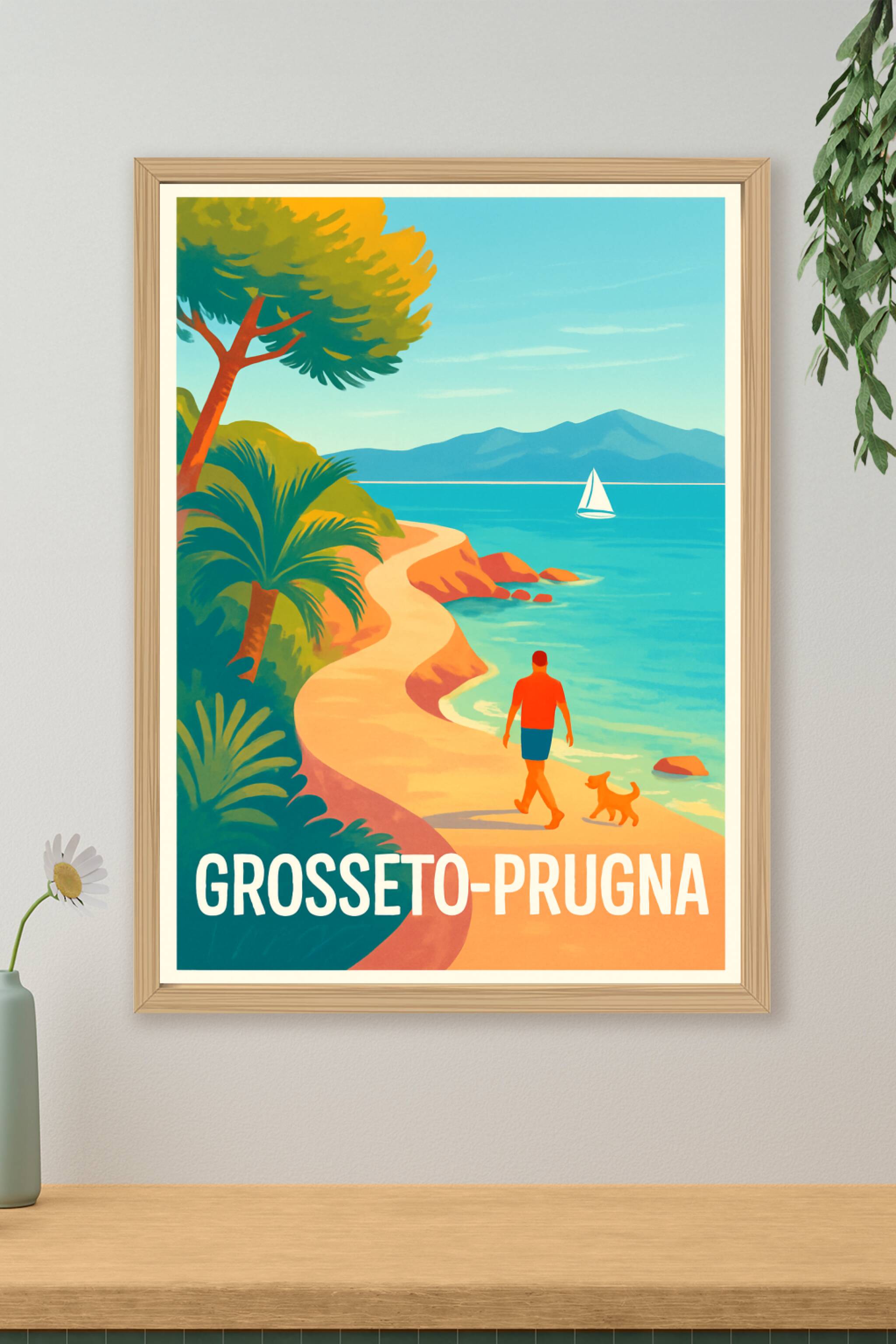 Découvrez la douceur de vivre méditerranéenne avec cette affiche illustrée représentant une promenade paisible le long des côtes de Grosseto-Prugna...