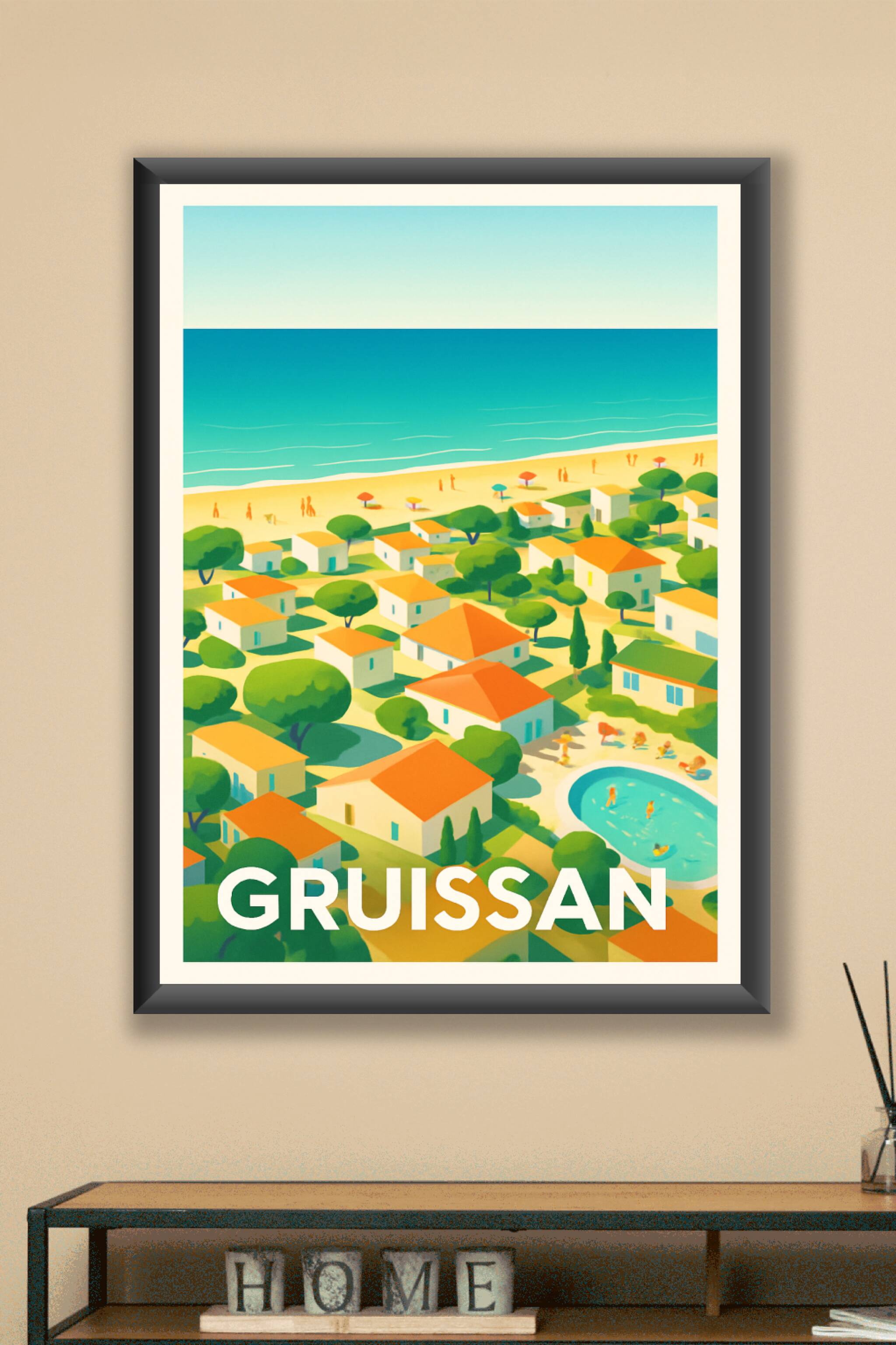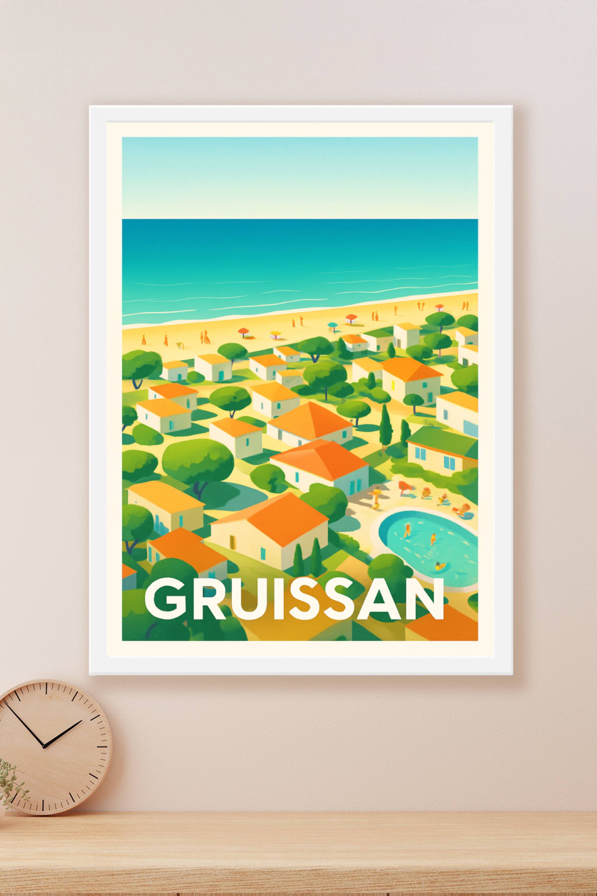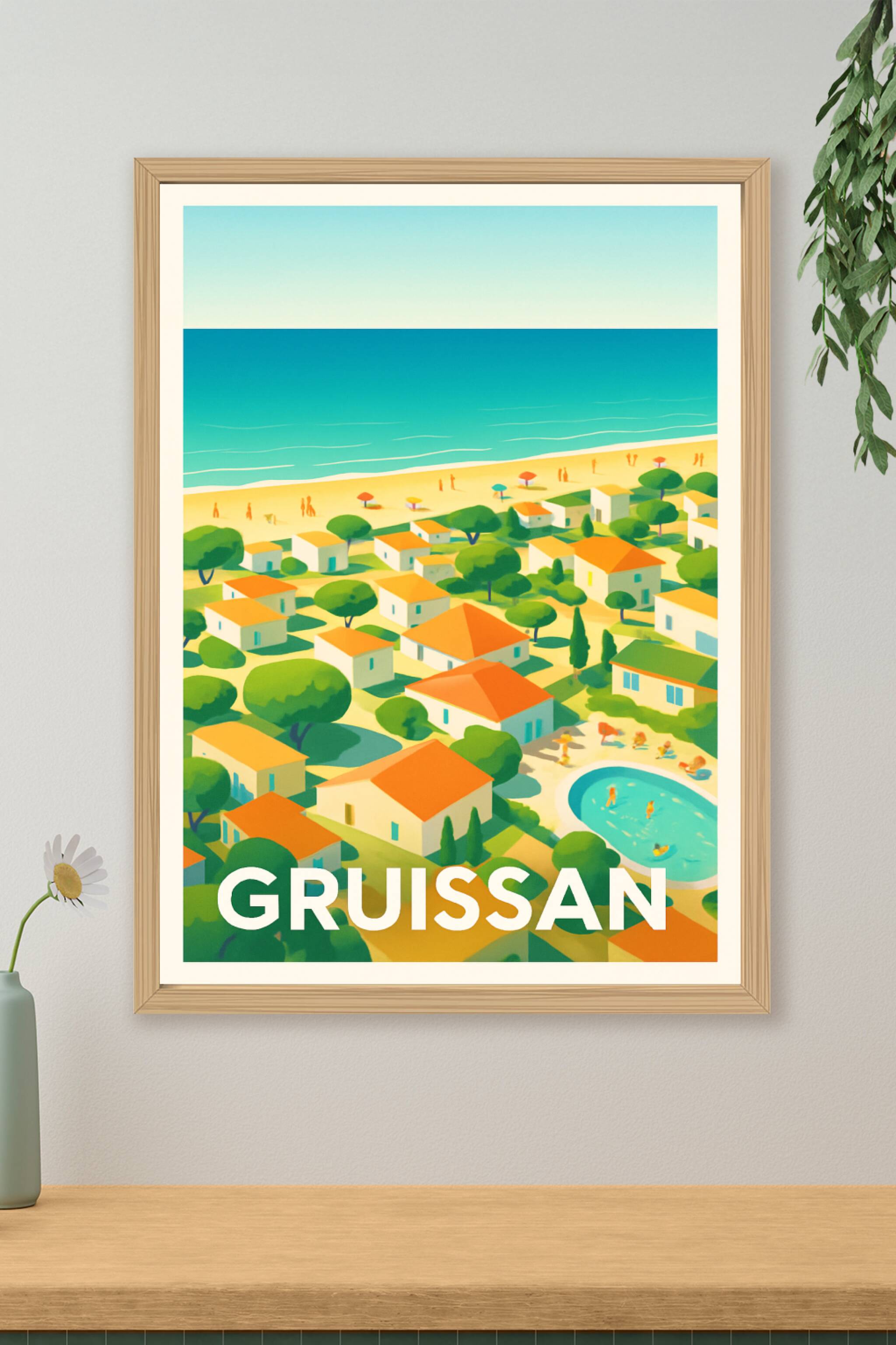 Découvrez l'atmosphère paisible et colorée de Gruissan avec cette affiche illustrée représentant son littoral ensoleillé et ses charmantes maisons ...