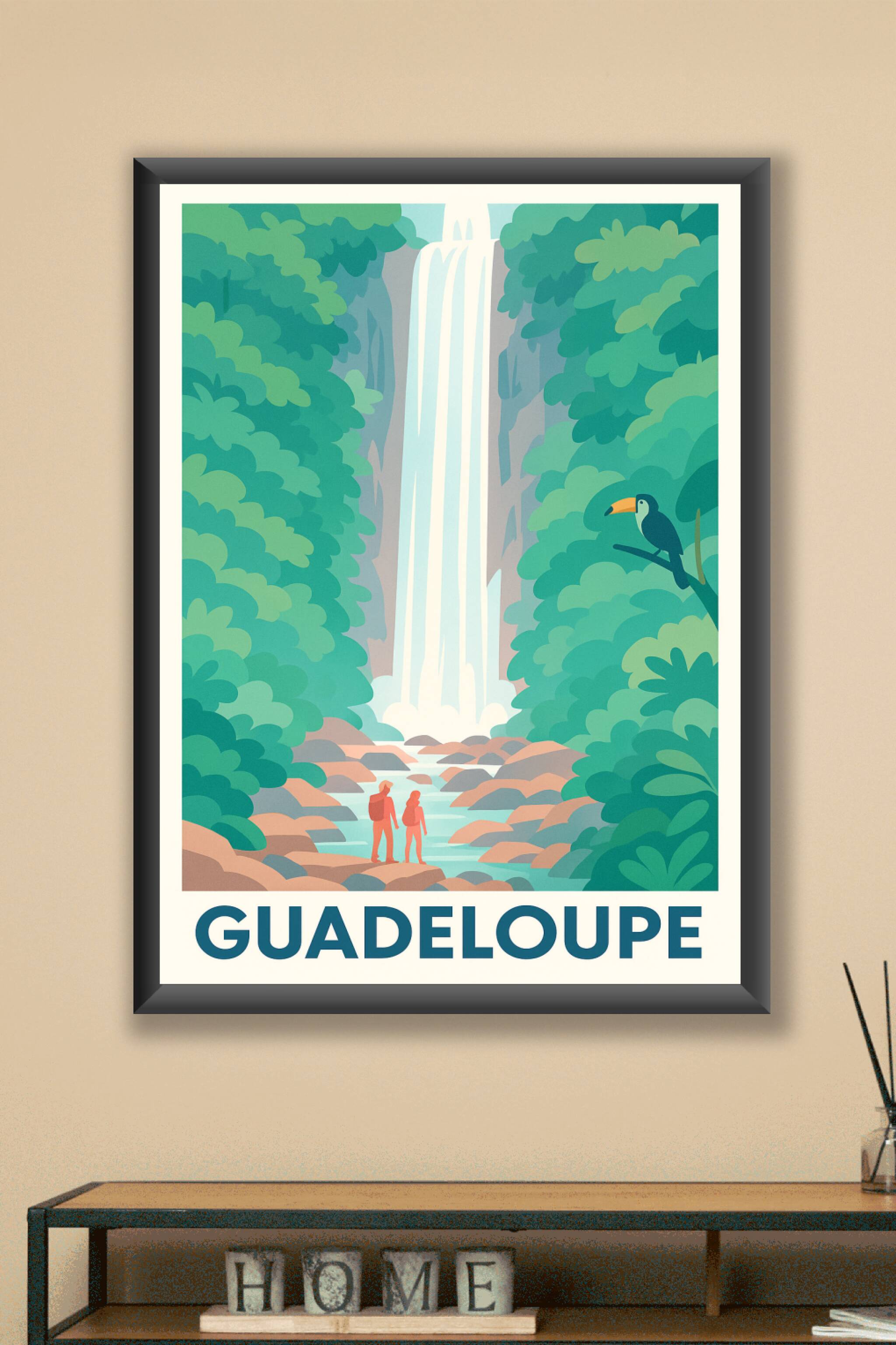 Découvrez la beauté sauvage et apaisante de la Guadeloupe à travers cette affiche illustrée mettant en scène une cascade majestueuse entourée d'une...