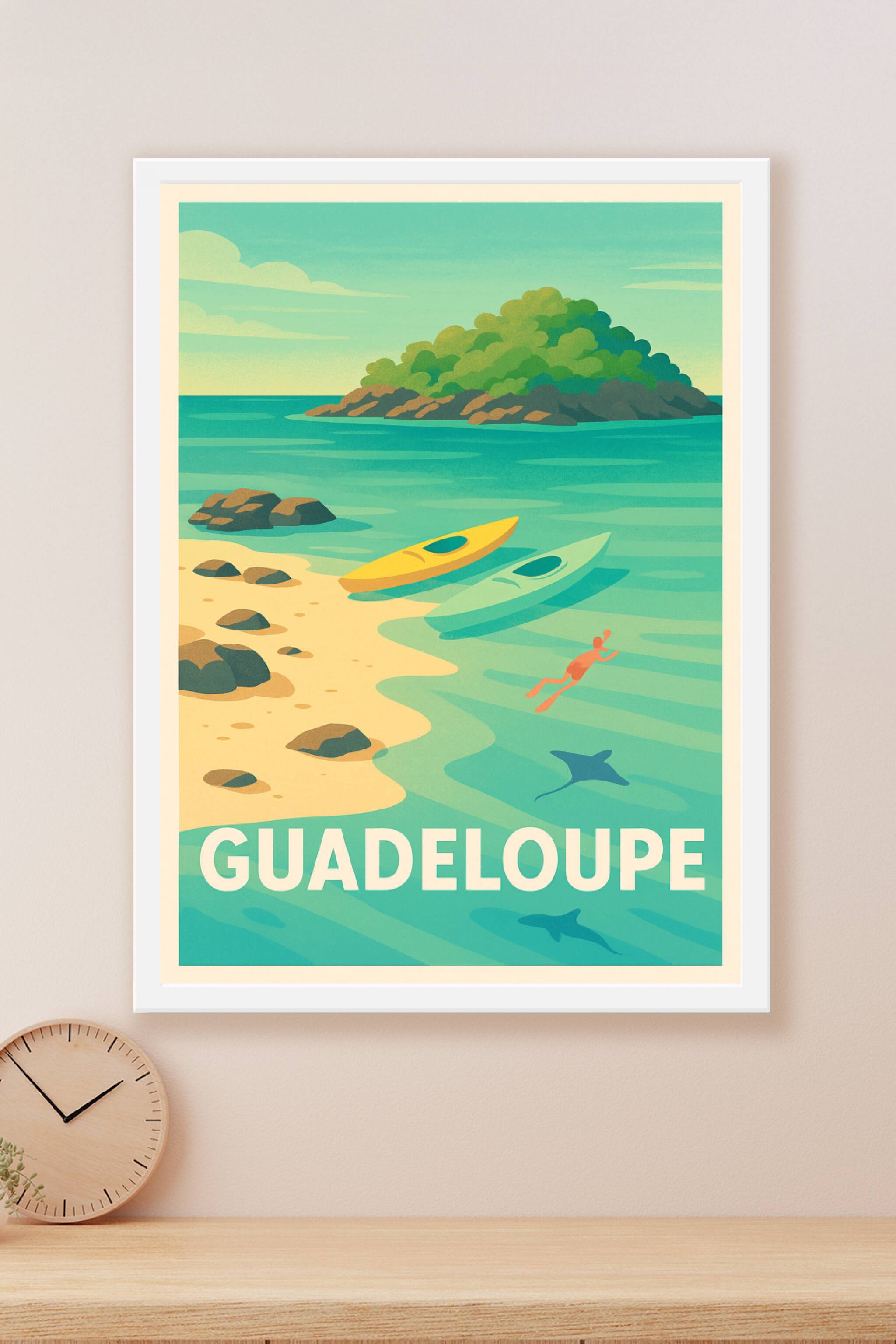 Découvrez le charme paisible de la Guadeloupe avec cette affiche au style rétro illustrant une plage idyllique, deux kayaks colorés et une mer translucide où nage un plongeur parmi les raies. Ce poster représente à merveille la douceur de vivre et les paysages paradisiaques de cette destination emblématique.Caractérisée par une impression « Fine Art » sur papier 305g coton, cette affiche garantit une qualité de rendu exceptionnelle, des couleurs vibrantes et un toucher velouté. Disponible en plusieurs formats, du A4 idéal pour un petit espace au spectaculaire A1 pour une décoration murale impactante, elle est proposée avec ou sans cadre afin de s'adapter à tous les intérieurs.Offrez-vous un voyage visuel à la Guadeloupe tout en enrichissant votre décoration avec ce poster haut de gamme, 100% fabriqué en France pour une finition premium et durable.
