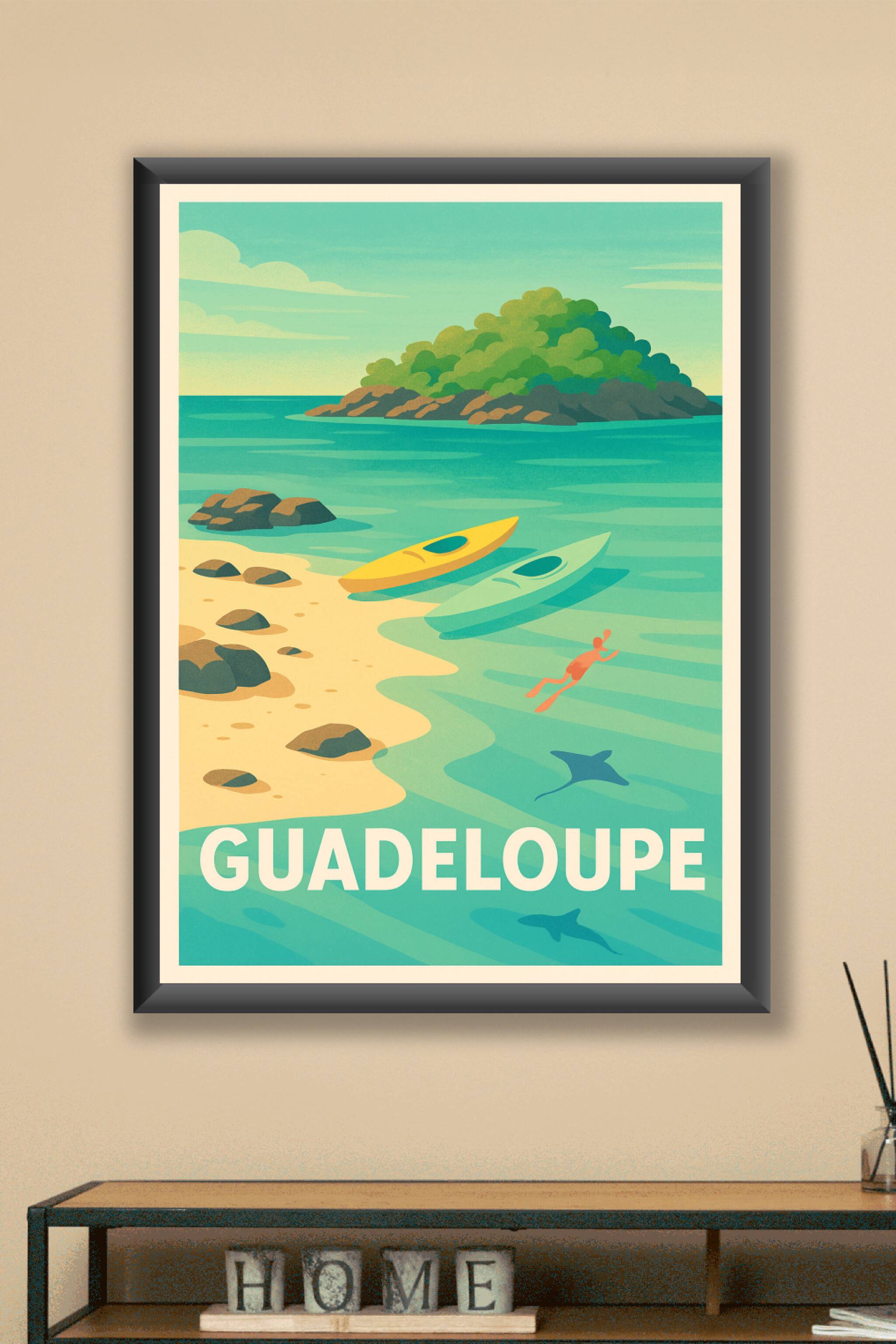 Découvrez le charme paisible de la Guadeloupe avec cette affiche au style rétro illustrant une plage idyllique, deux kayaks colorés et une mer tran...