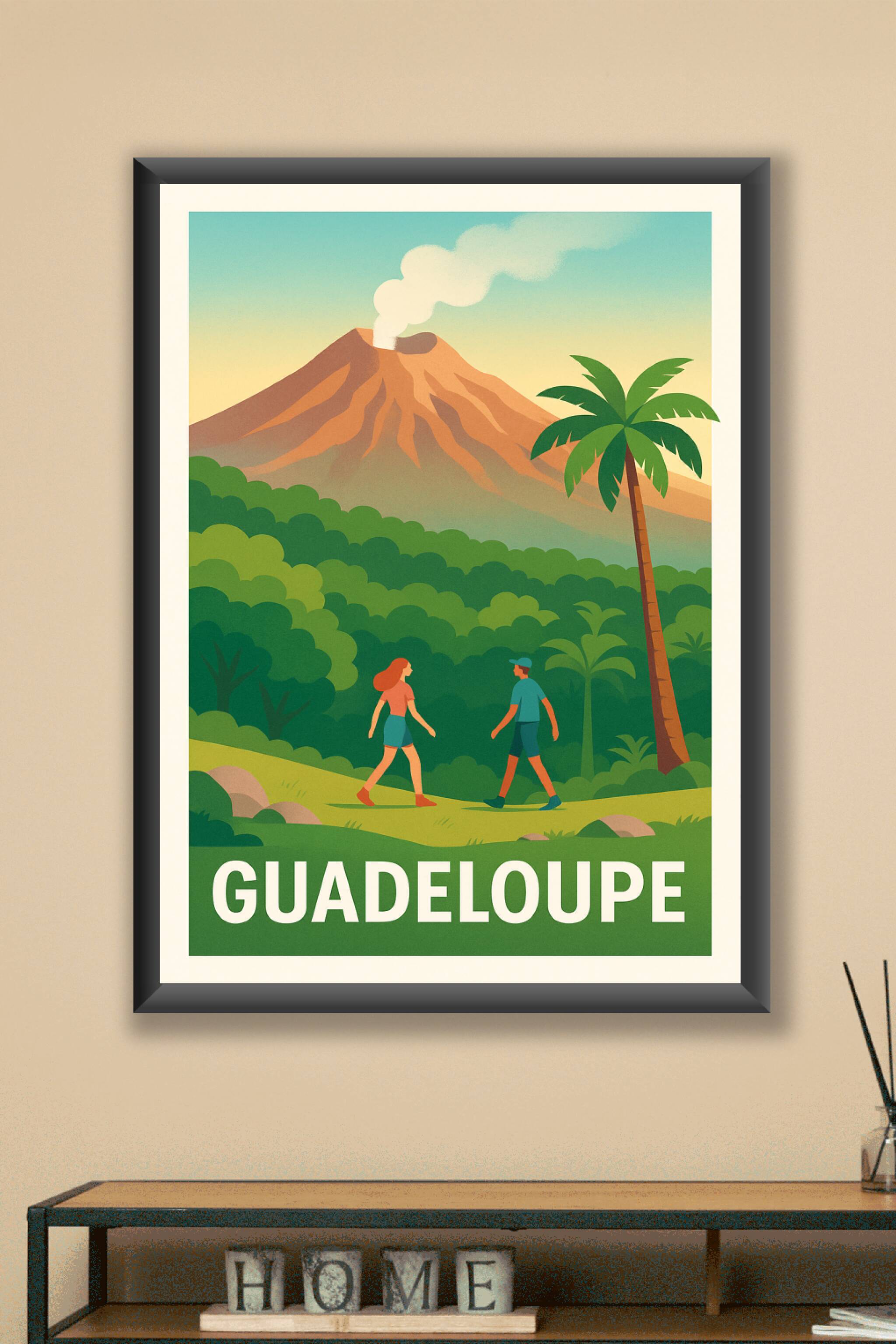 Découvrez la beauté naturelle et sauvage de la Guadeloupe avec cette affiche représentant la majestueuse Soufrière en pleine activité, entourée de sa végétation luxuriante. Ce poster illustre une scène de randonnée en pleine nature, idéale pour les amoureux d'aventure et d'évasion tropicale. Imprimé en tirage "Fine Art" sur papier 305g coton, ce poster offre une qualité d'impression exceptionnelle, fidèle aux couleurs chaudes et vibrantes de l'île. Disponible en formats A1 à A4, avec ou sans cadre, cette affiche est parfaite pour apporter une touche exotique et dynamique à votre décoration intérieure. Profitez d'un produit 100% fabriqué en France pour embellir votre intérieur ou faire un cadeau unique et raffiné.