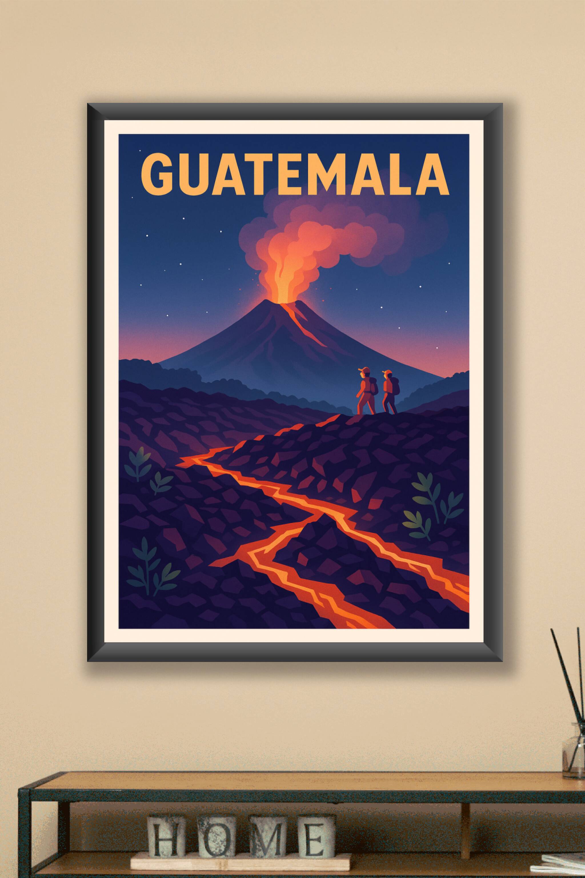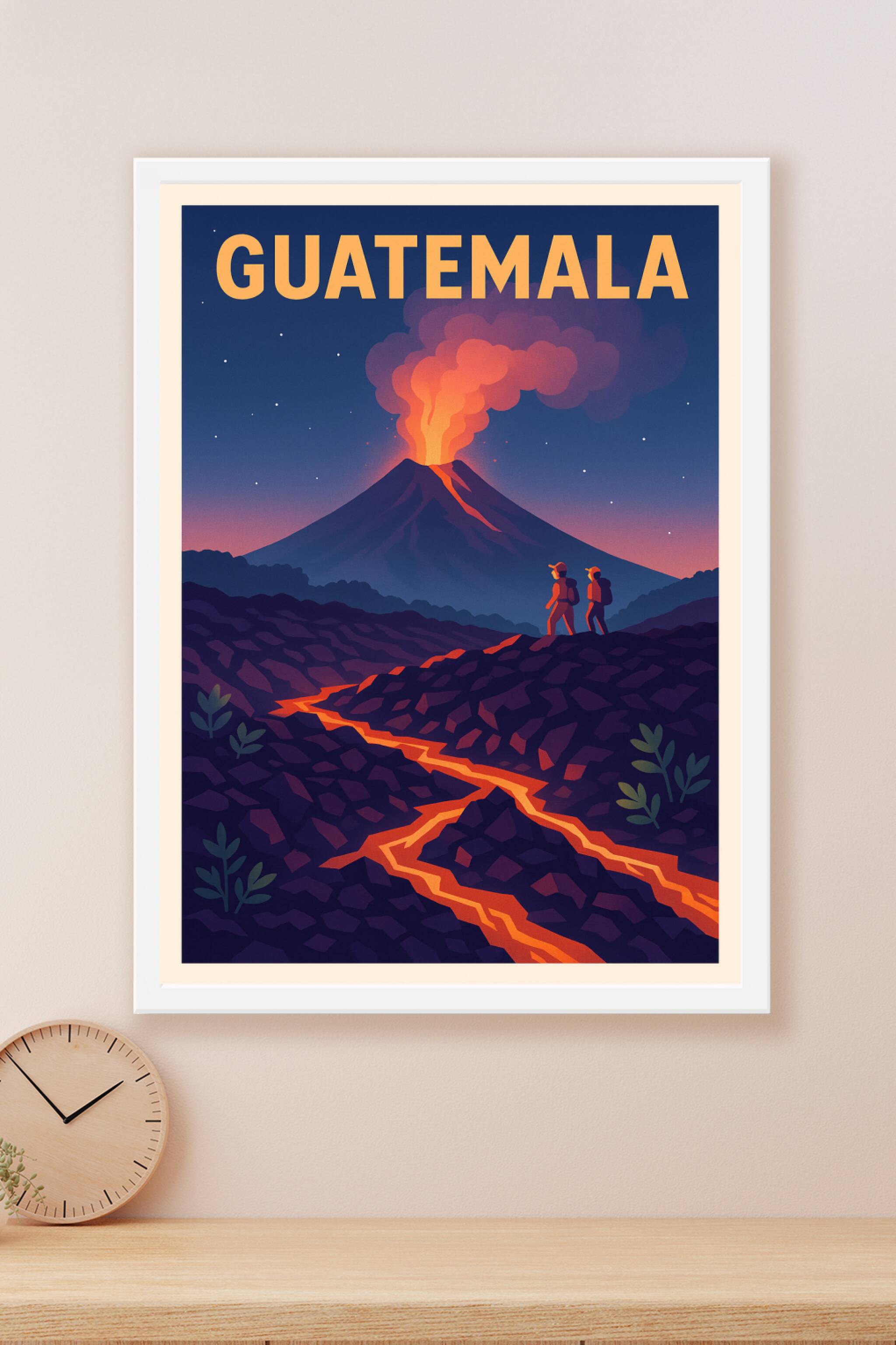 Découvrez la puissance naturelle du Guatemala avec cette affiche illustrant un volcan en pleine éruption sous un ciel étoilé. Ce poster vibrant cap...