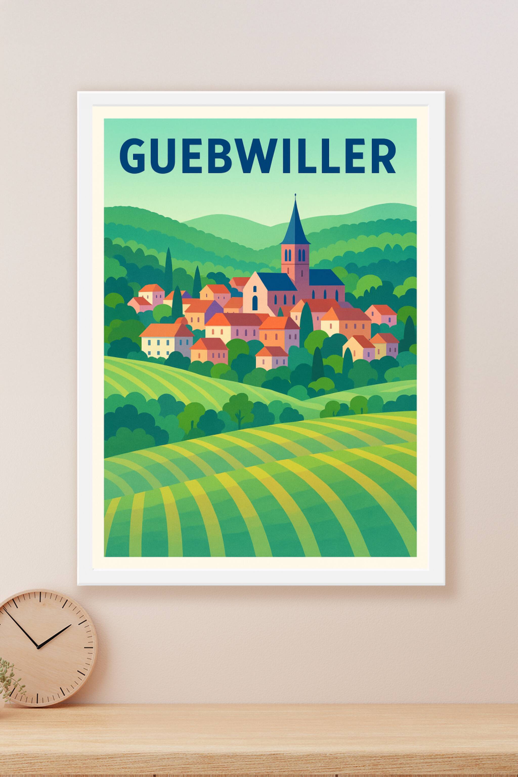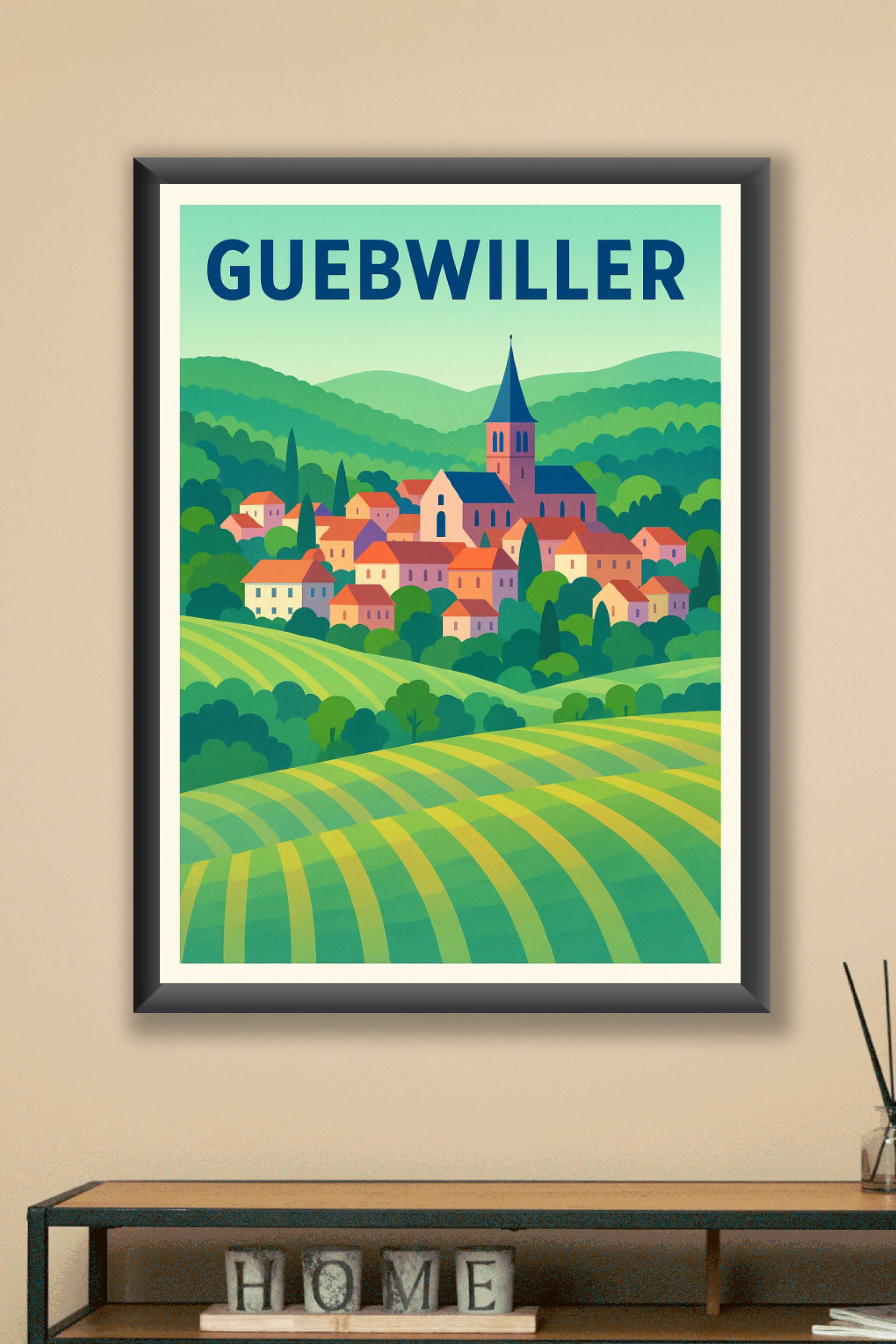 Découvrez l'atmosphère paisible de Guebwiller avec cette affiche illustrée mettant en scène son paysage vallonné et son architecture traditionnelle...