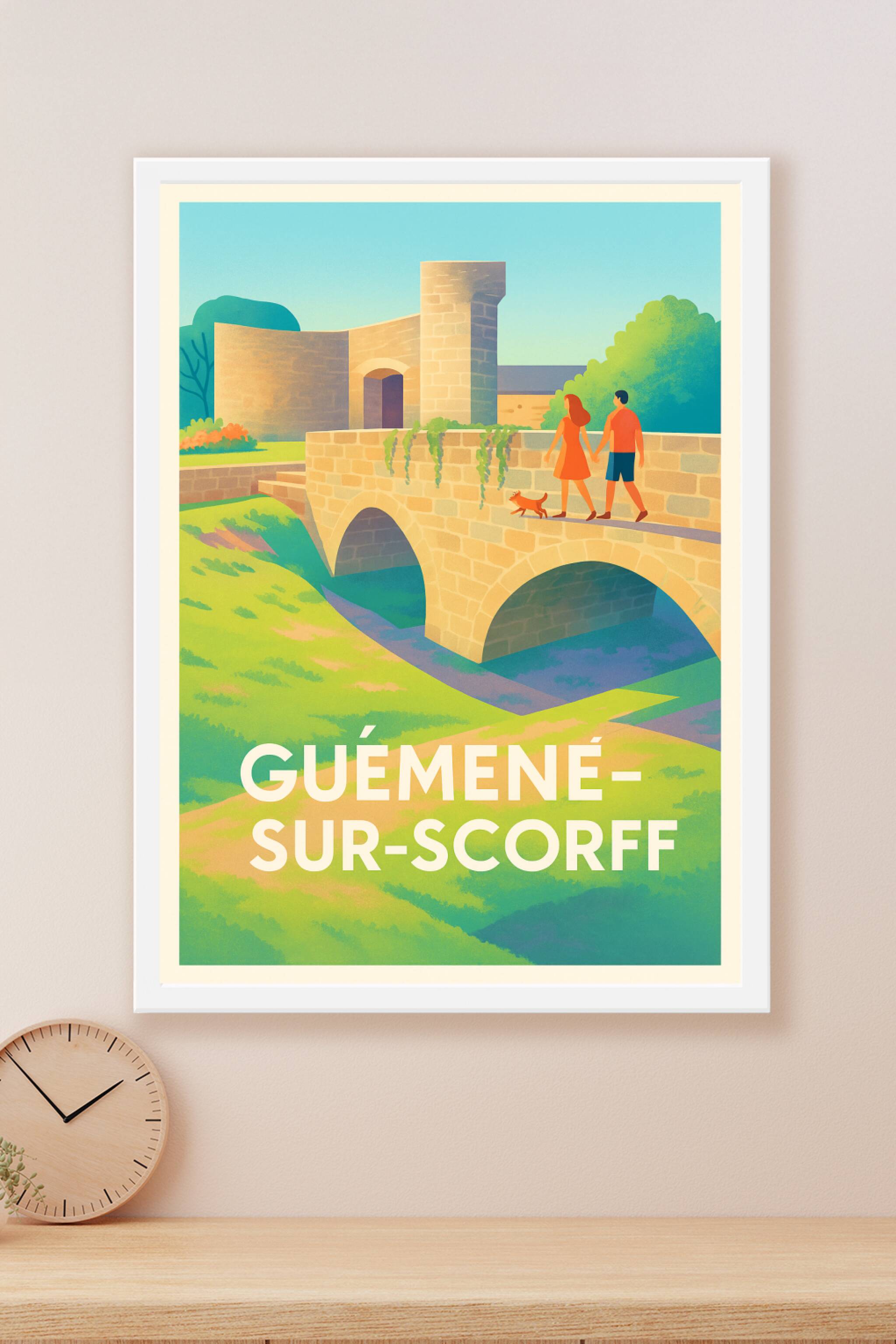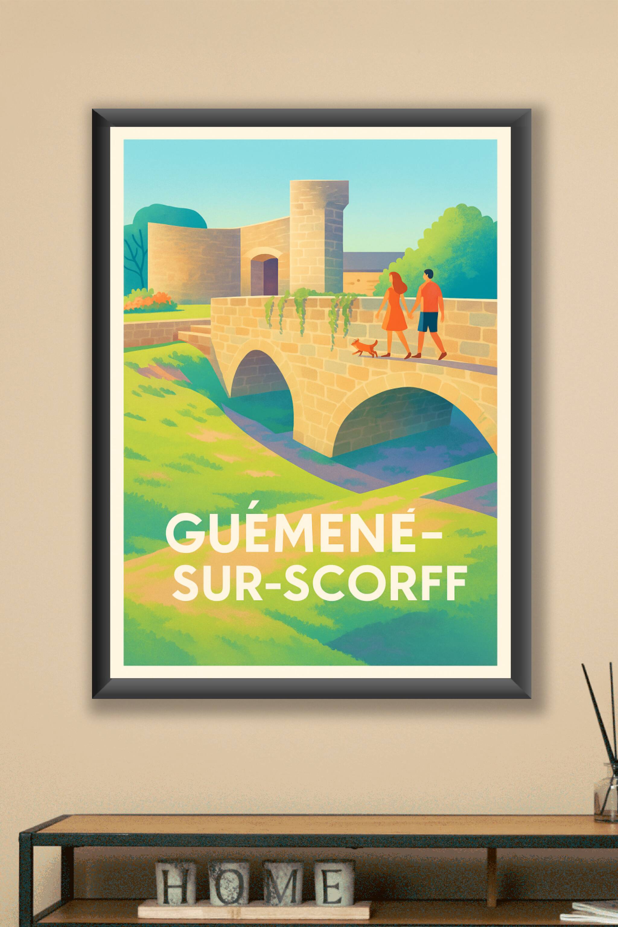 Découvrez la sérénité et le charme pittoresque de Guémené-sur-Scorff à travers cette affiche au style illustratif et coloré. Représentant un couple...
