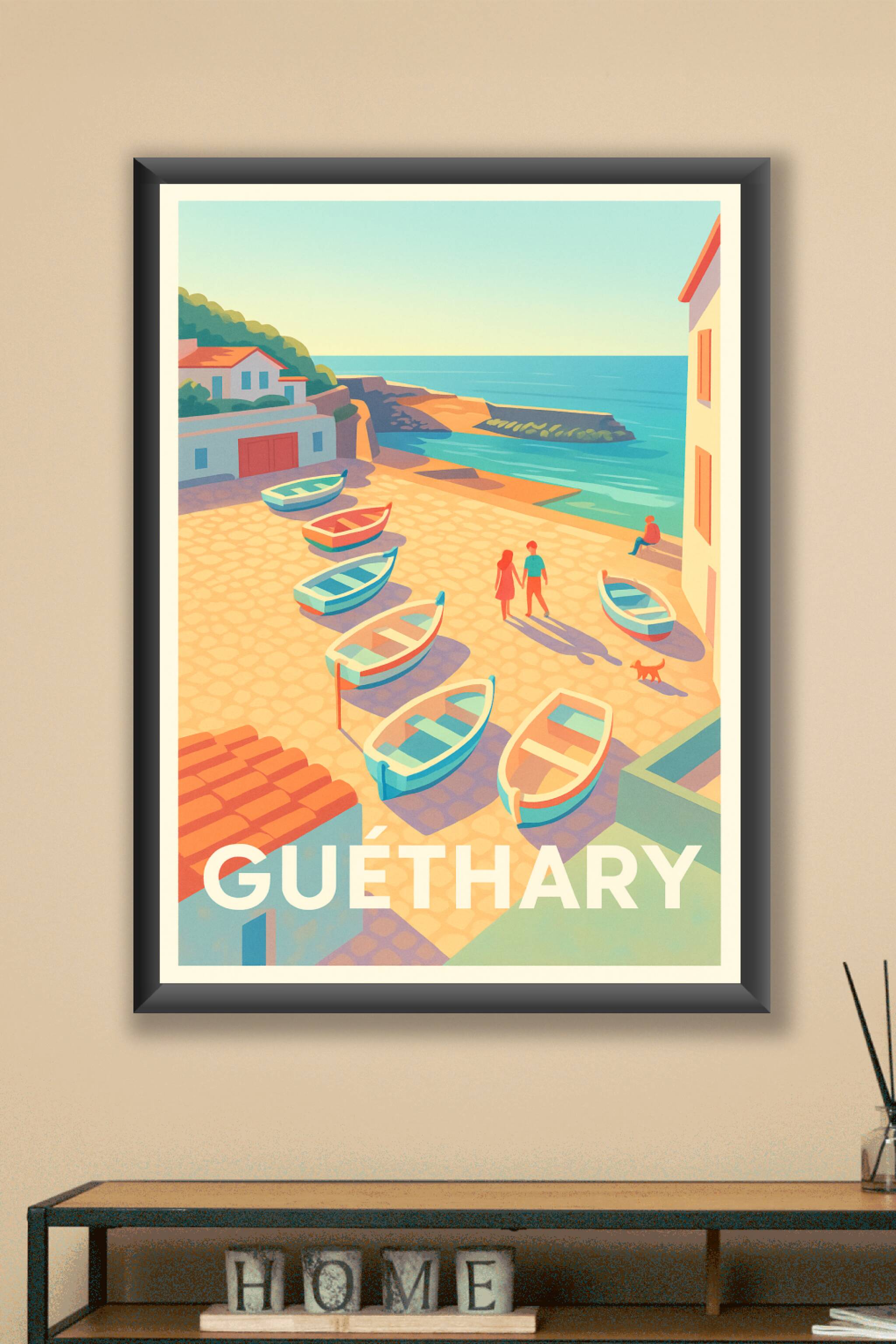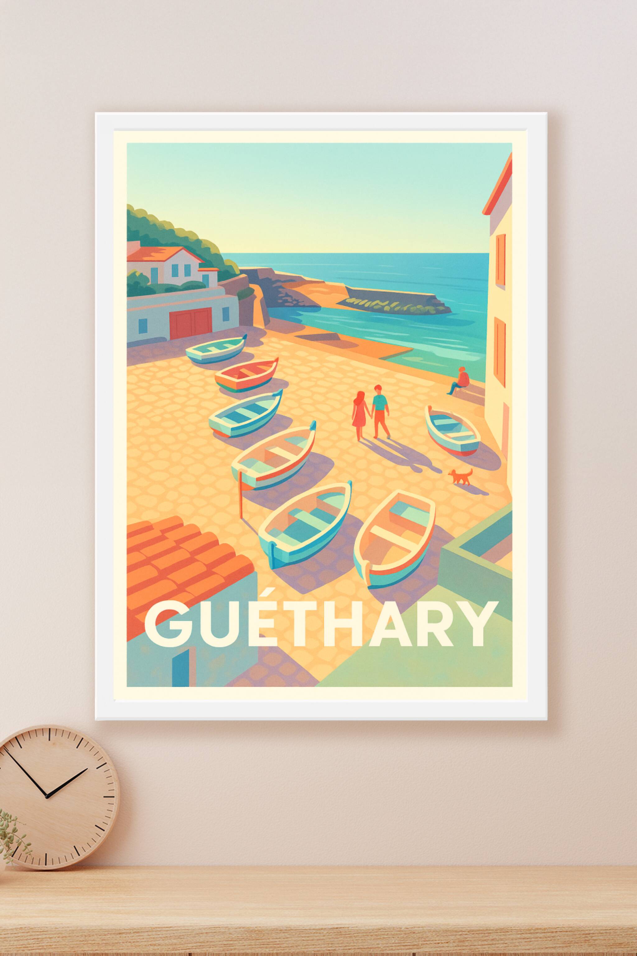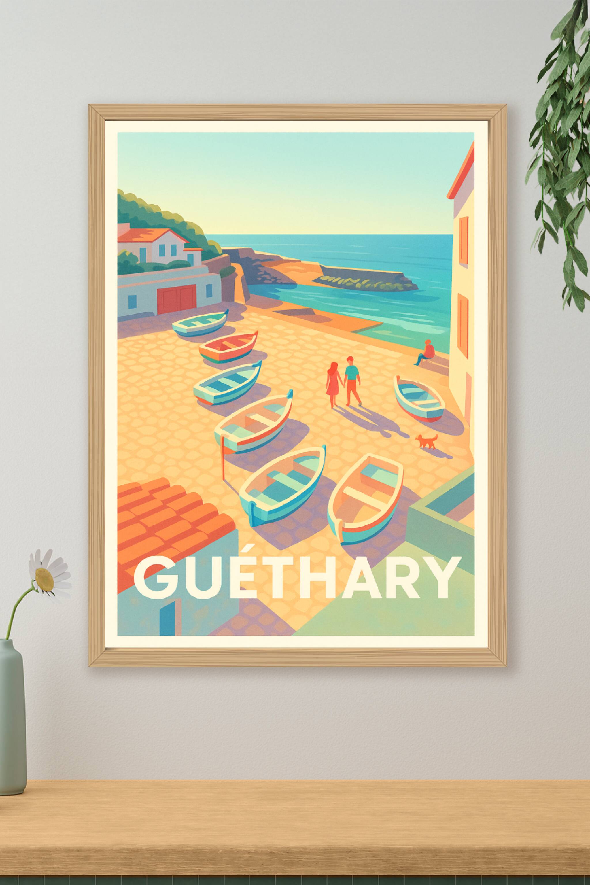 Découvrez l'ambiance paisible et lumineuse de Guéthary avec cette affiche illustrée qui capture un moment idyllique au bord de l'océan. Les petits ...