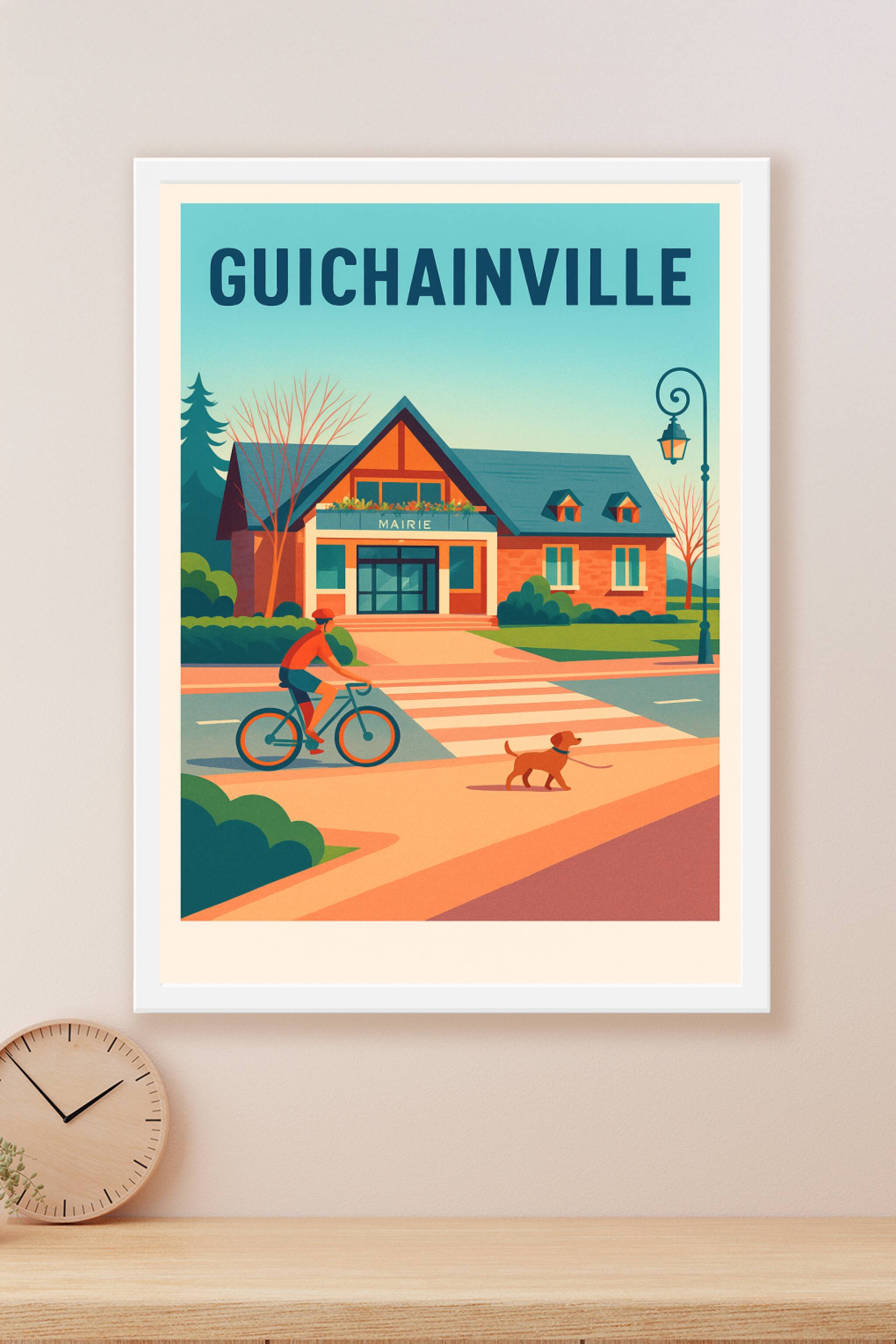 Découvrez le charme tranquille de Guichainville avec cette affiche illustrée mettant en scène la mairie, un symbole local convivial et paisible. La...