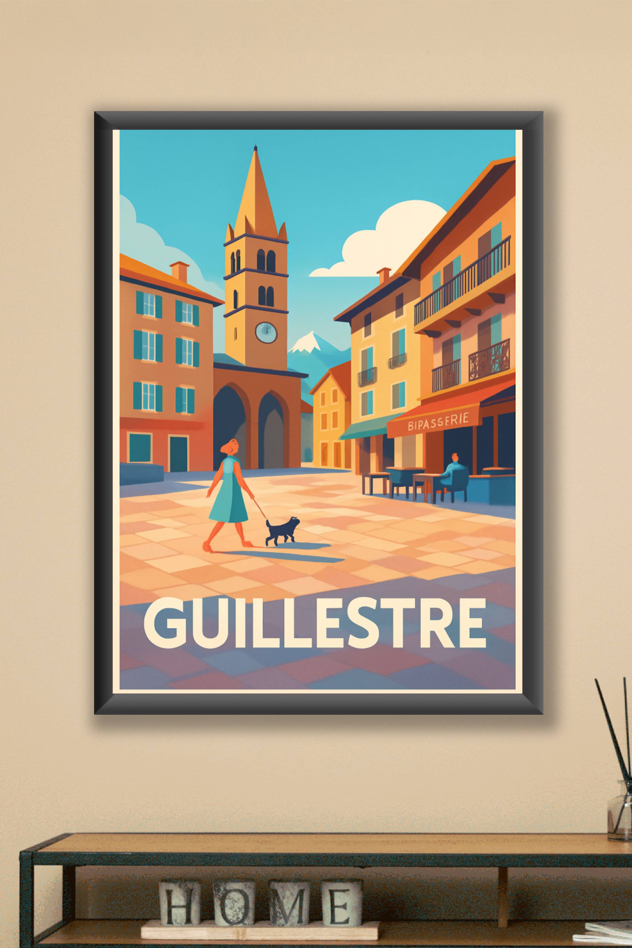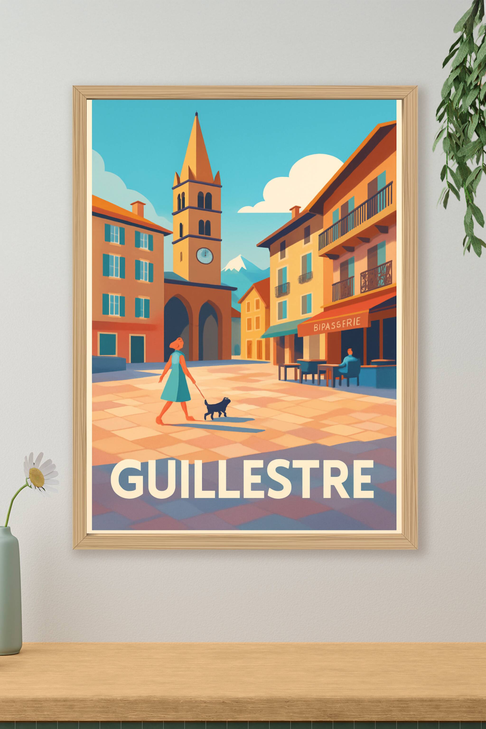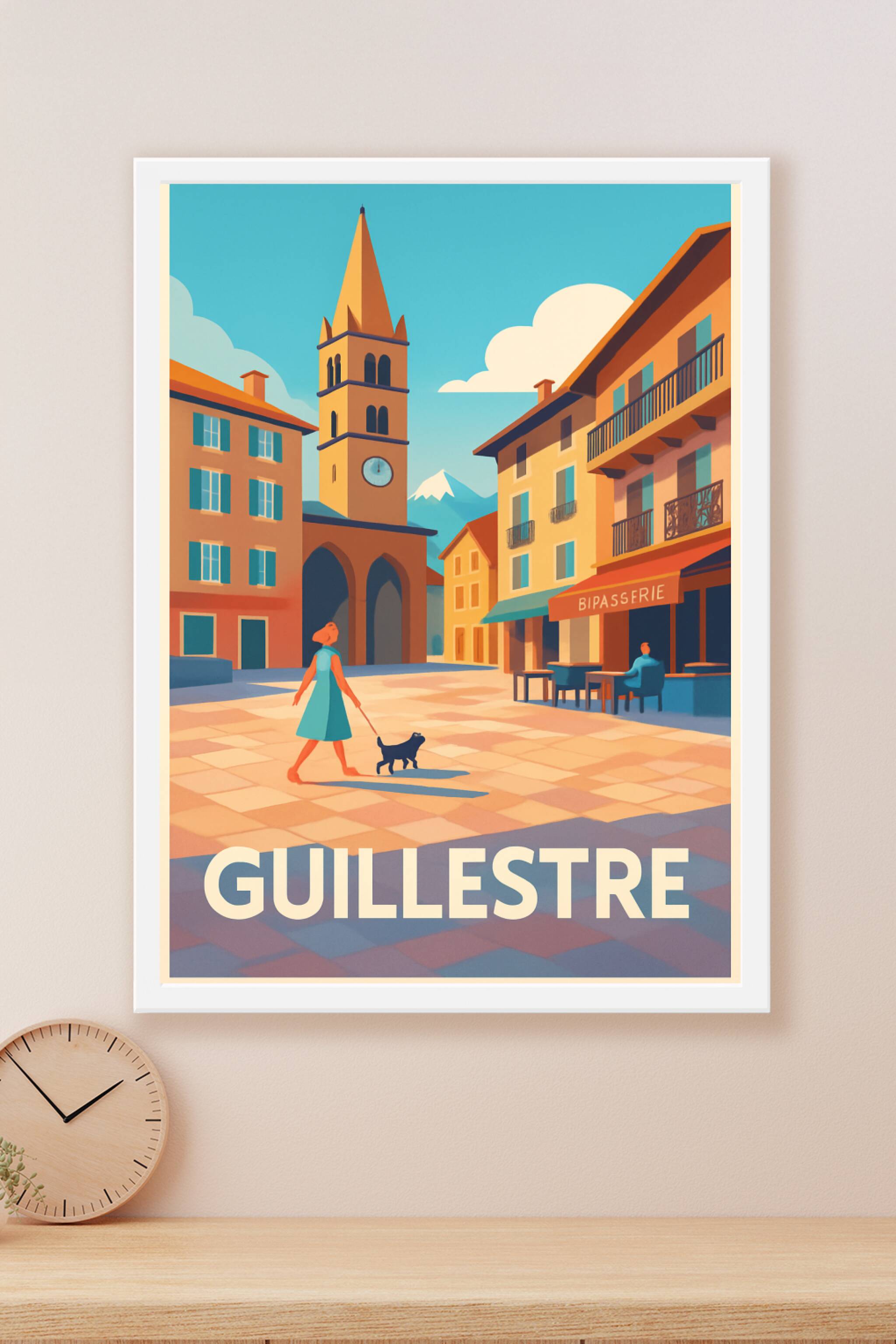 Découvrez l'élégance paisible de Guilestre avec cette affiche au style vintage et coloré, représentant une scène typique de cette ville accueillant...