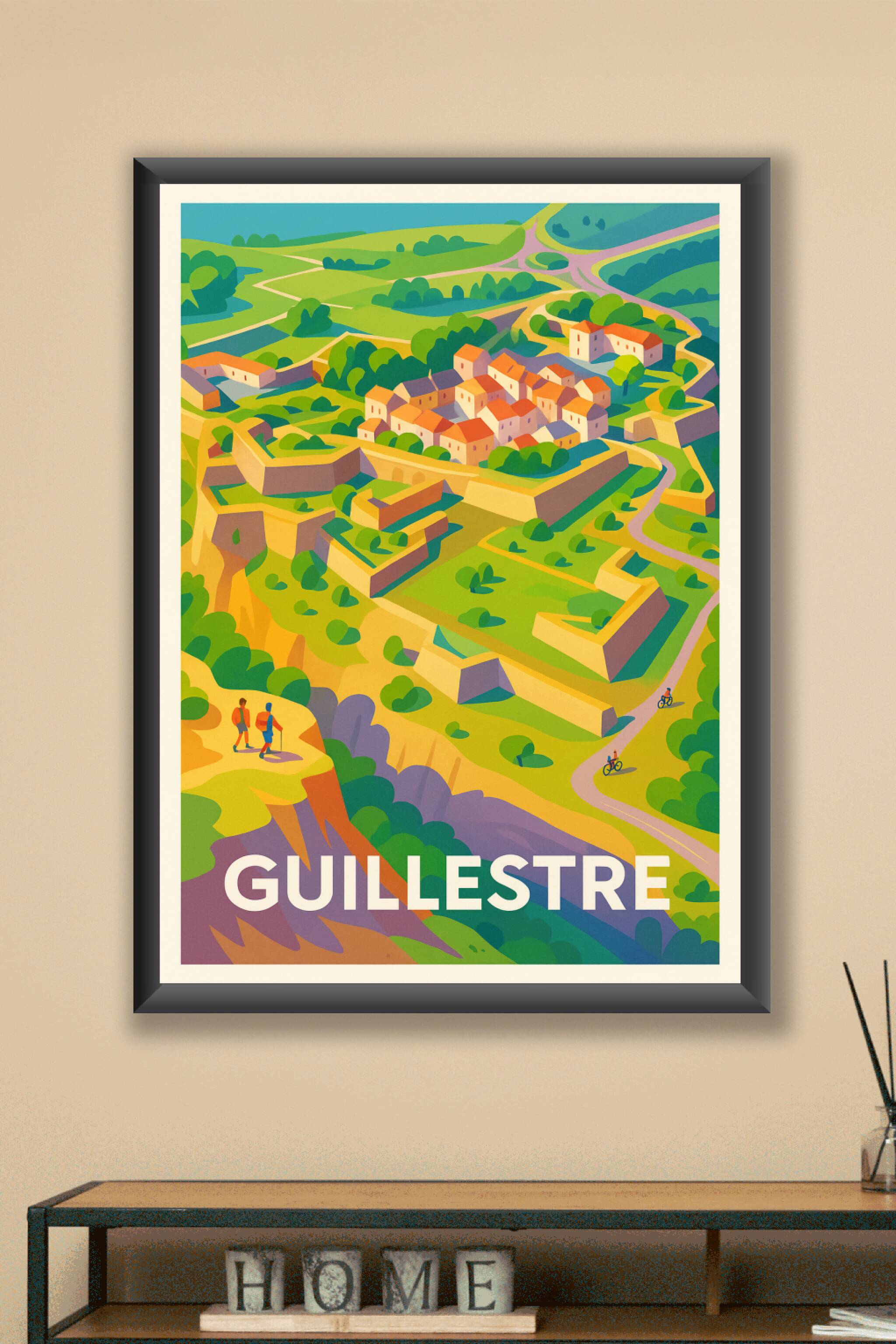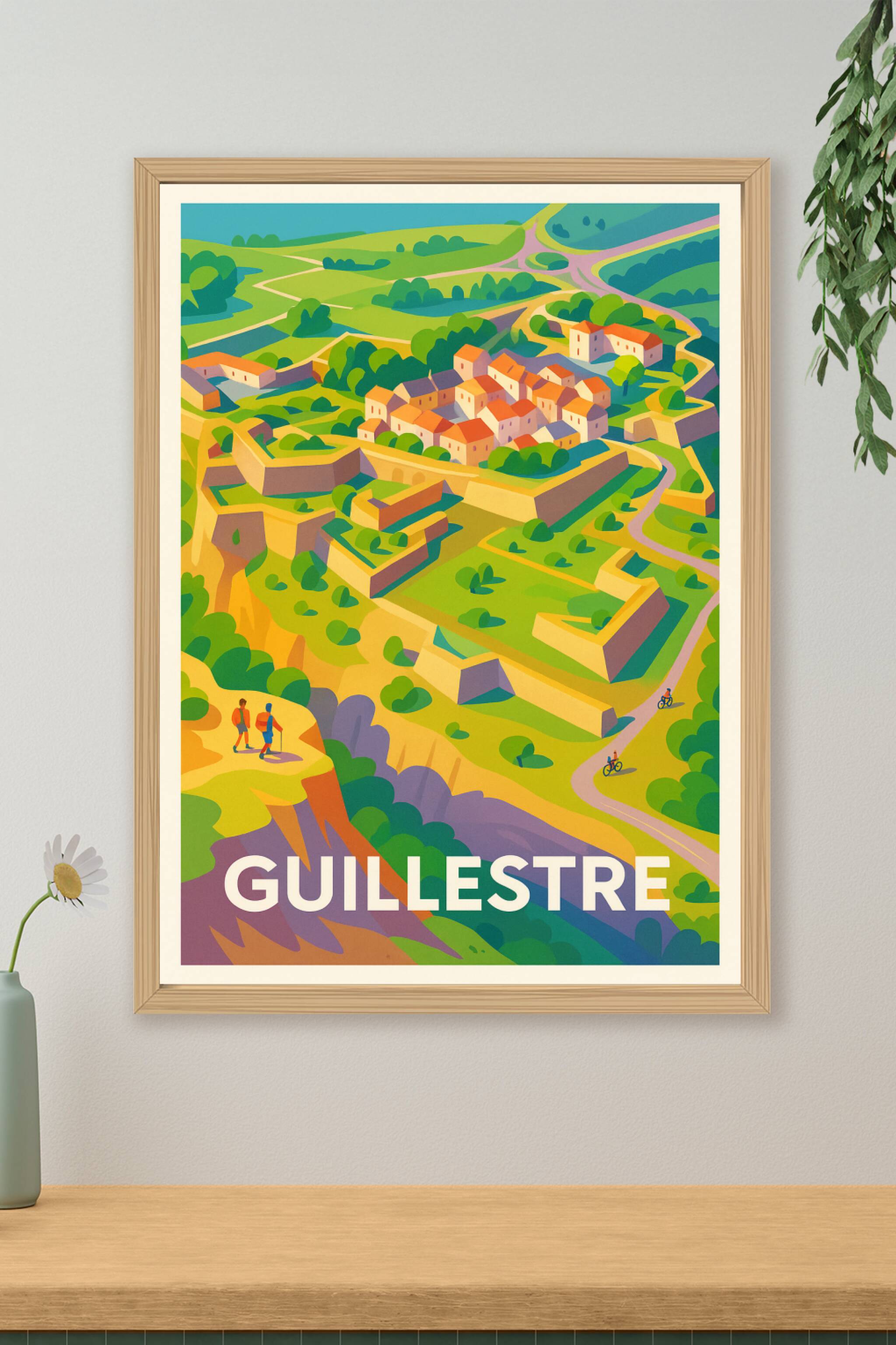 Cette affiche illustrée du village de Guillestre dévoile une vue aérienne colorée et dynamique de ses fortifications impressionnantes et de son pay...