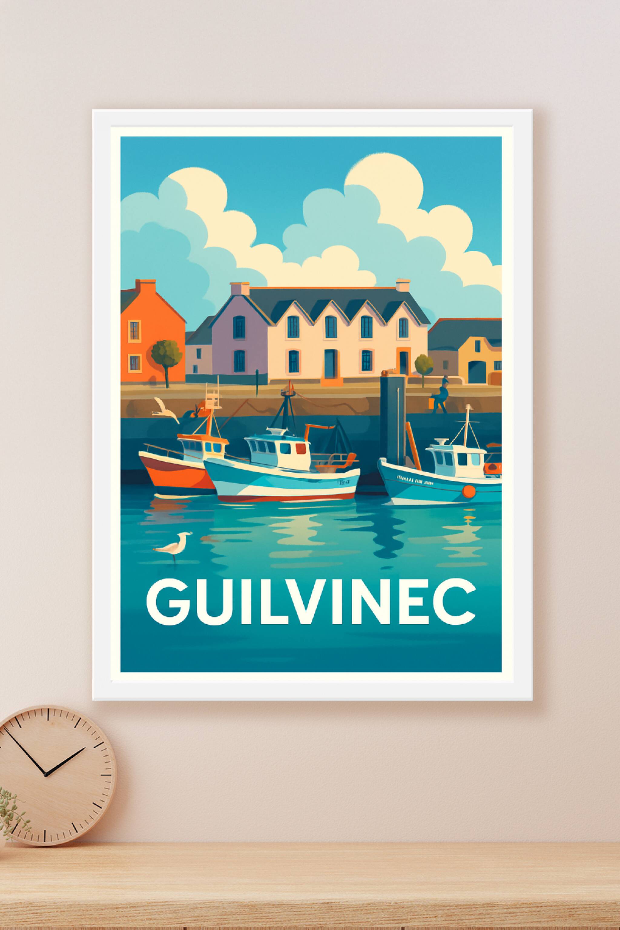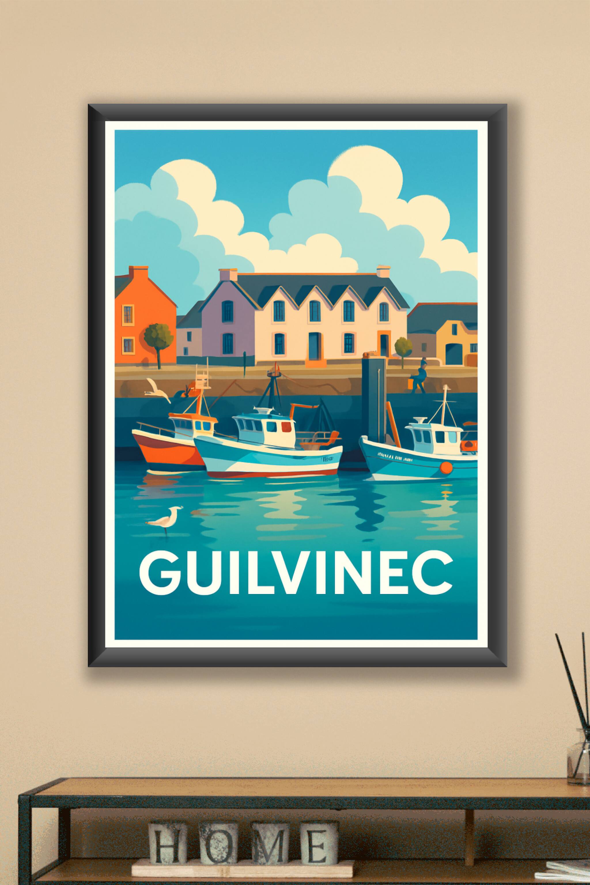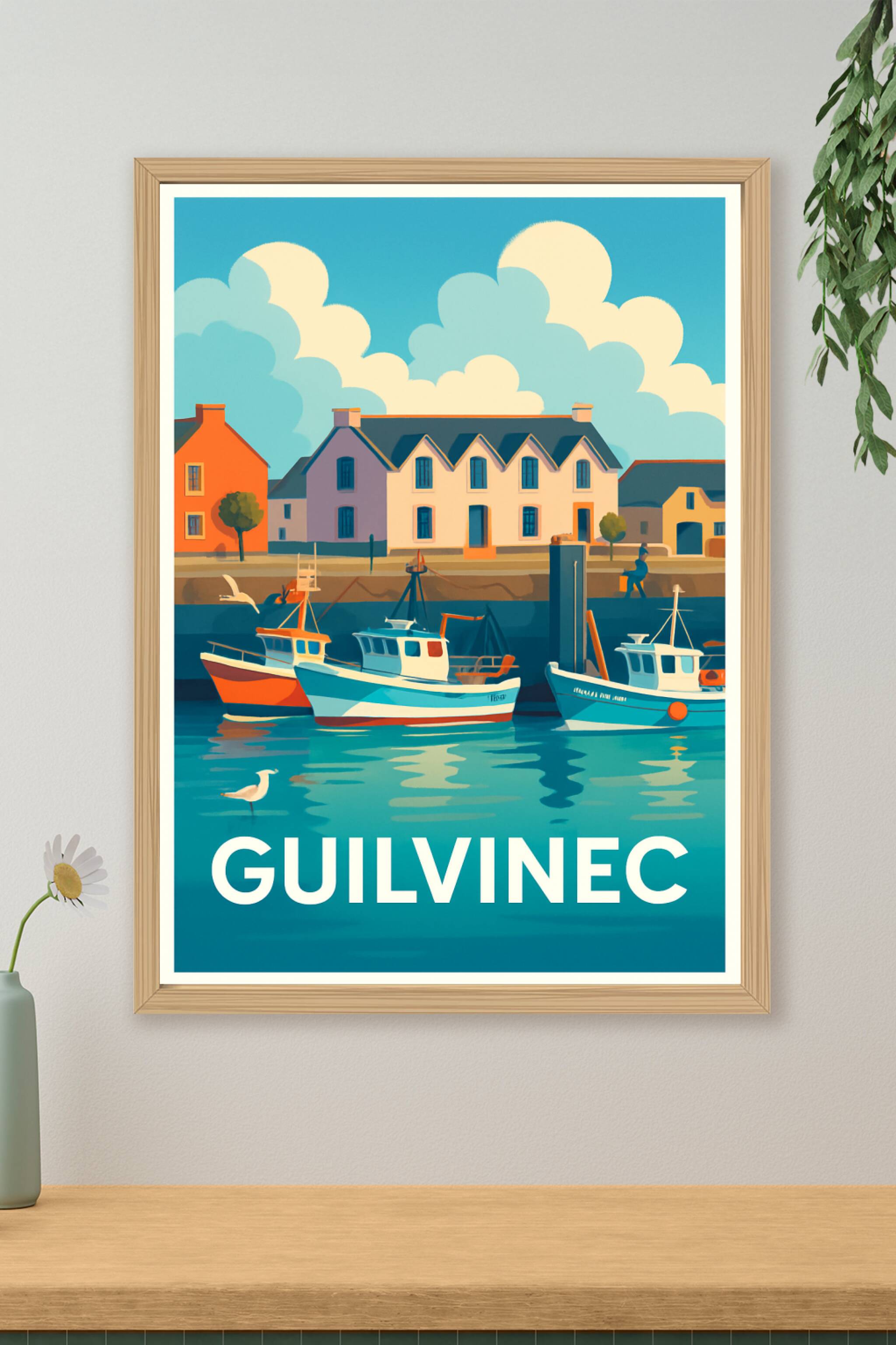Découvrez l'atmosphère paisible et colorée du port de Guilvinec avec cette affiche illustrée mêlant tradition et douceur de vivre. Les bateaux de p...