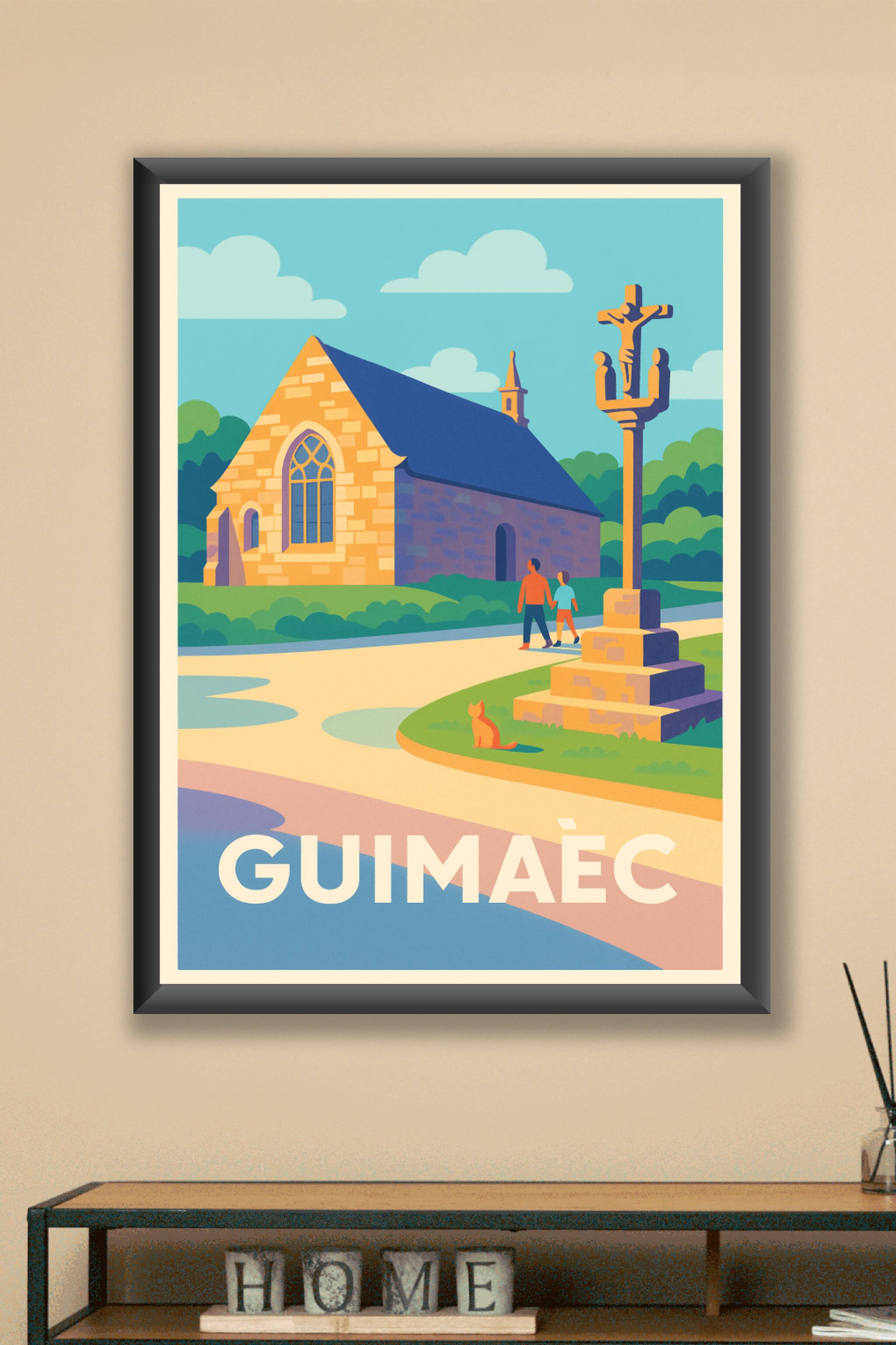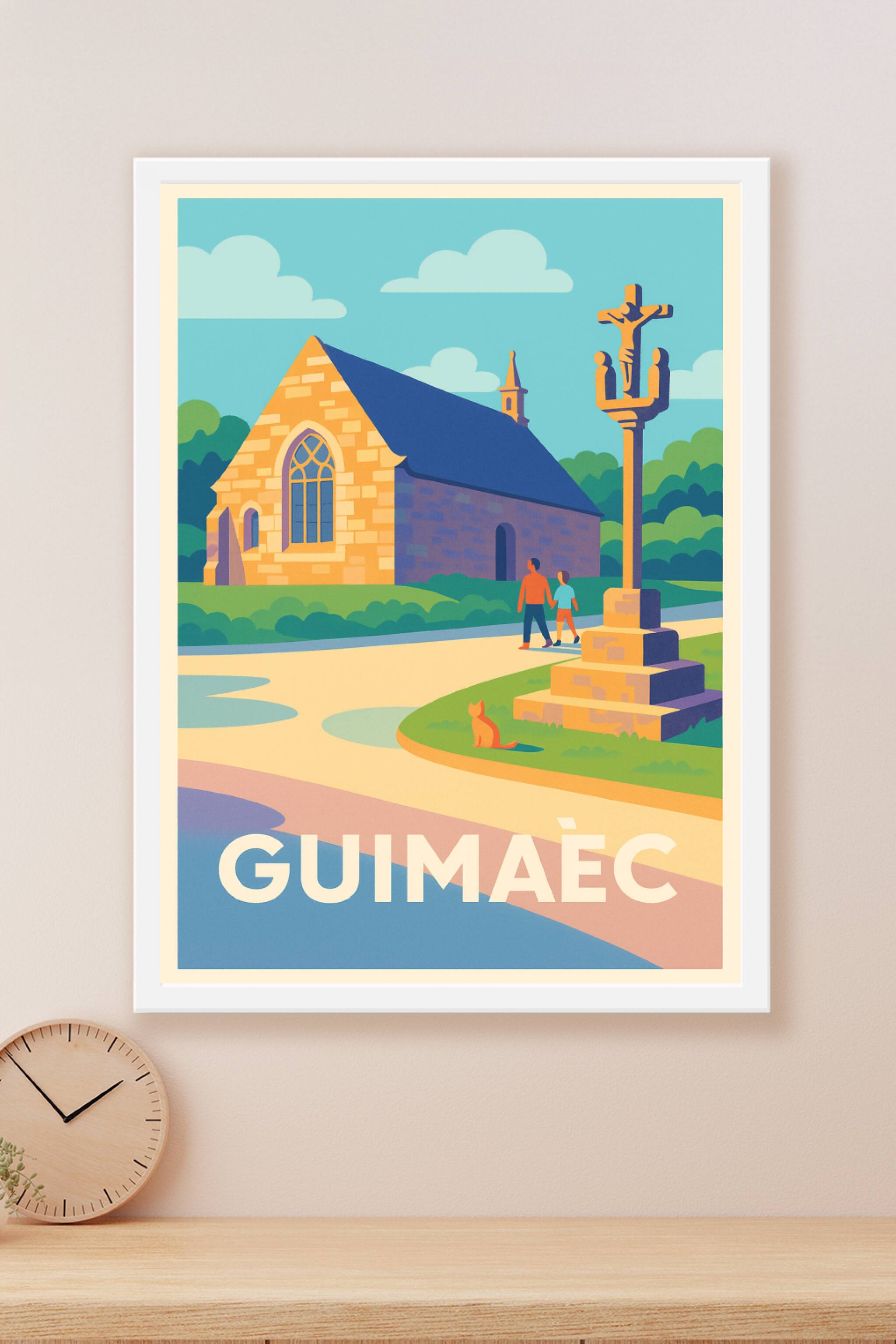 Découvrez l'atmosphère sereine et authentique de Guimaëc avec cette affiche illustrée dans un style graphique et coloré. Le poster met à l'honneur ...